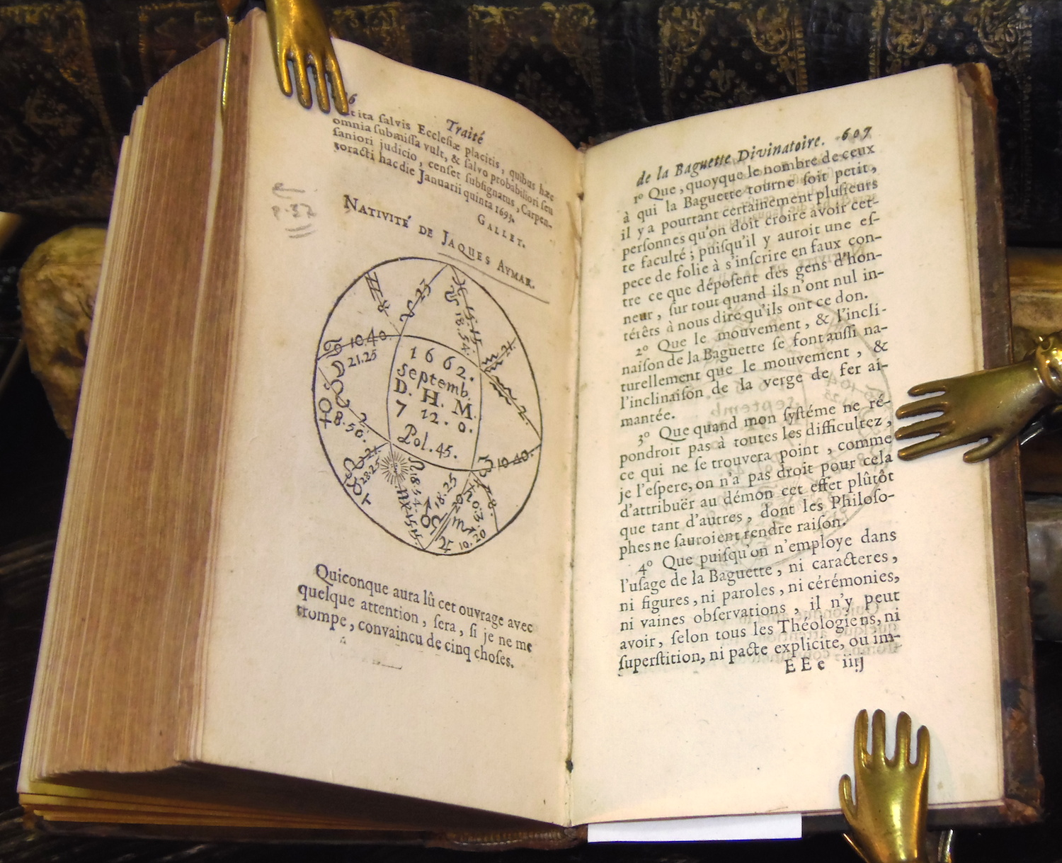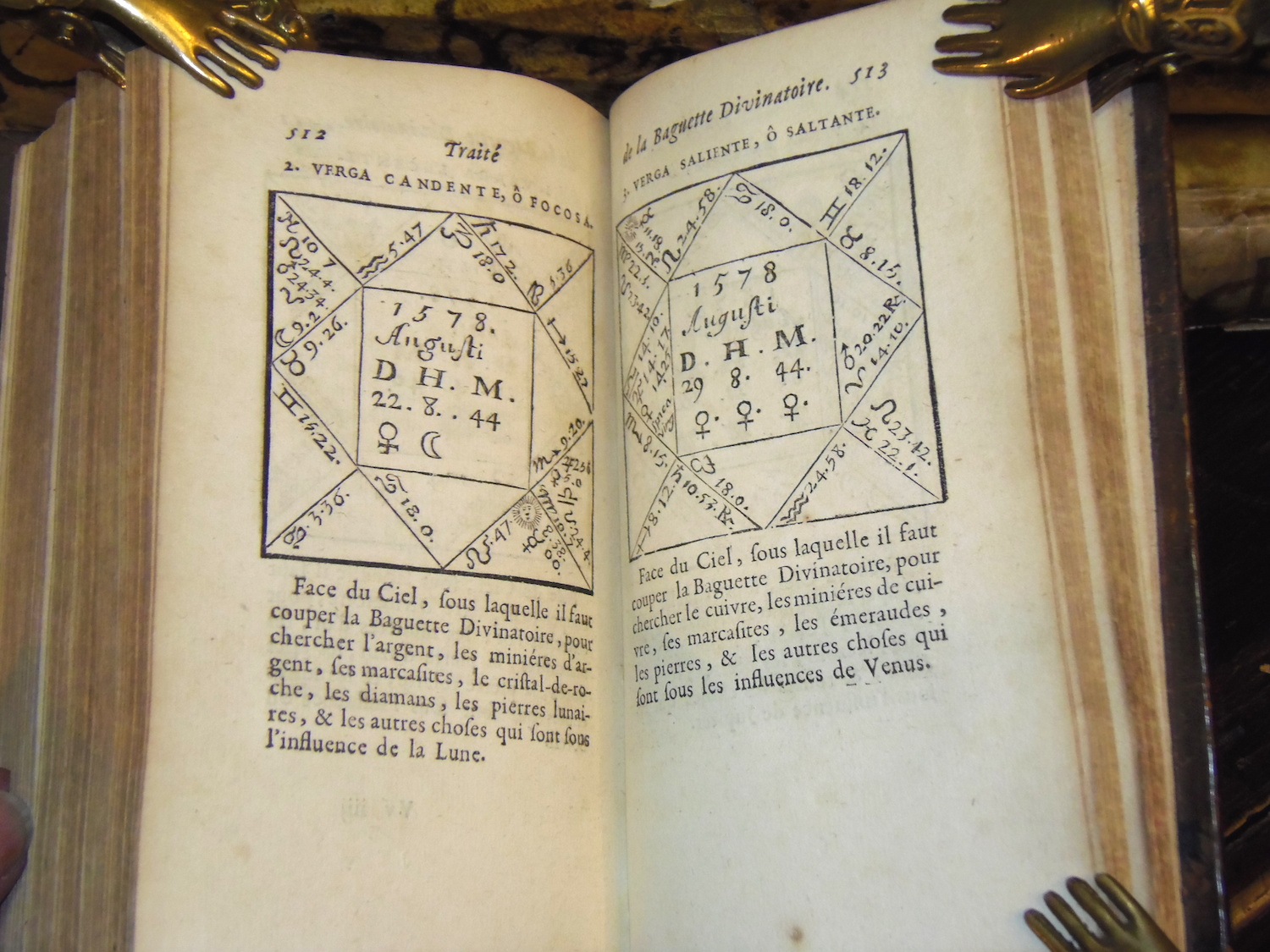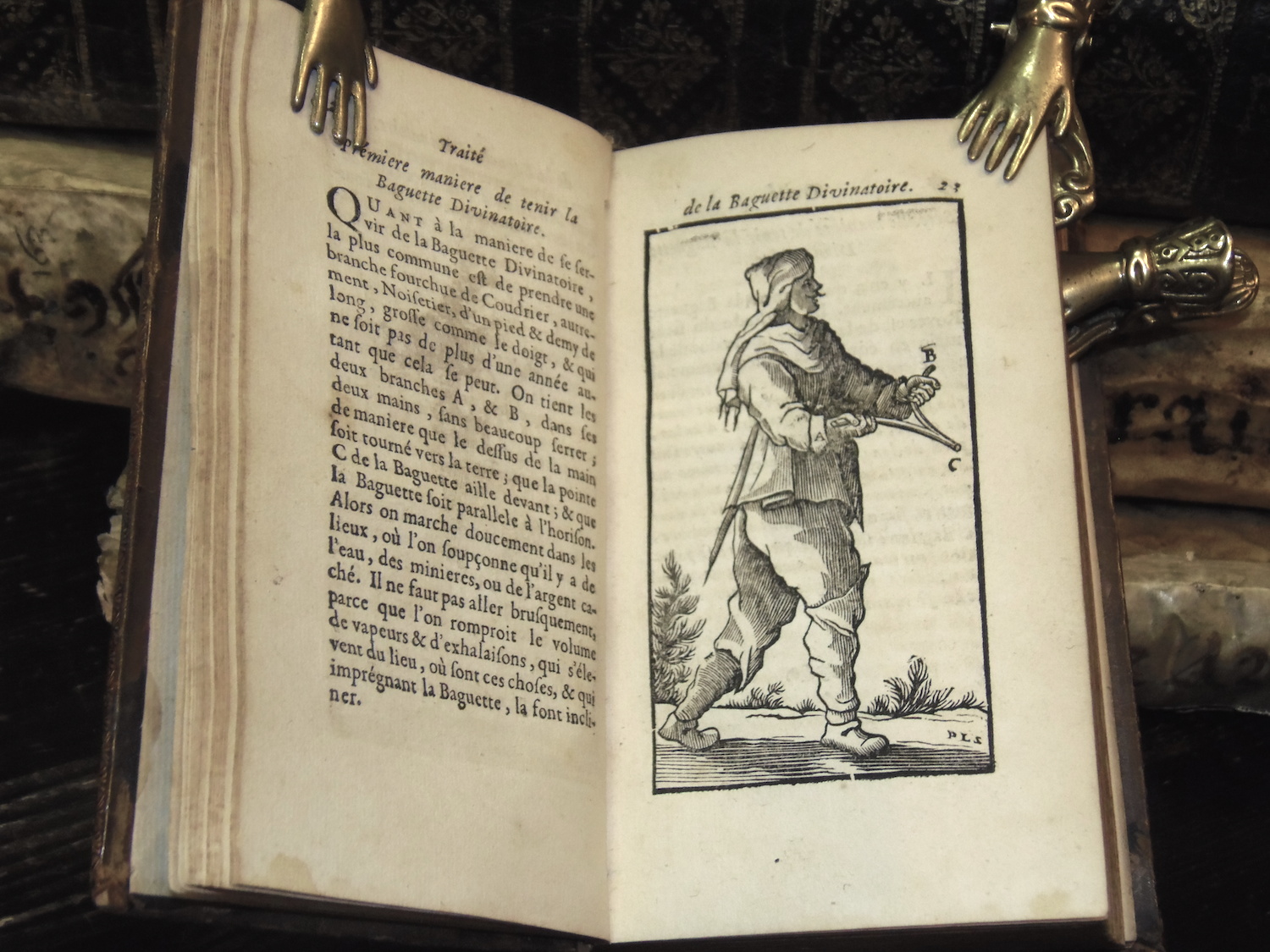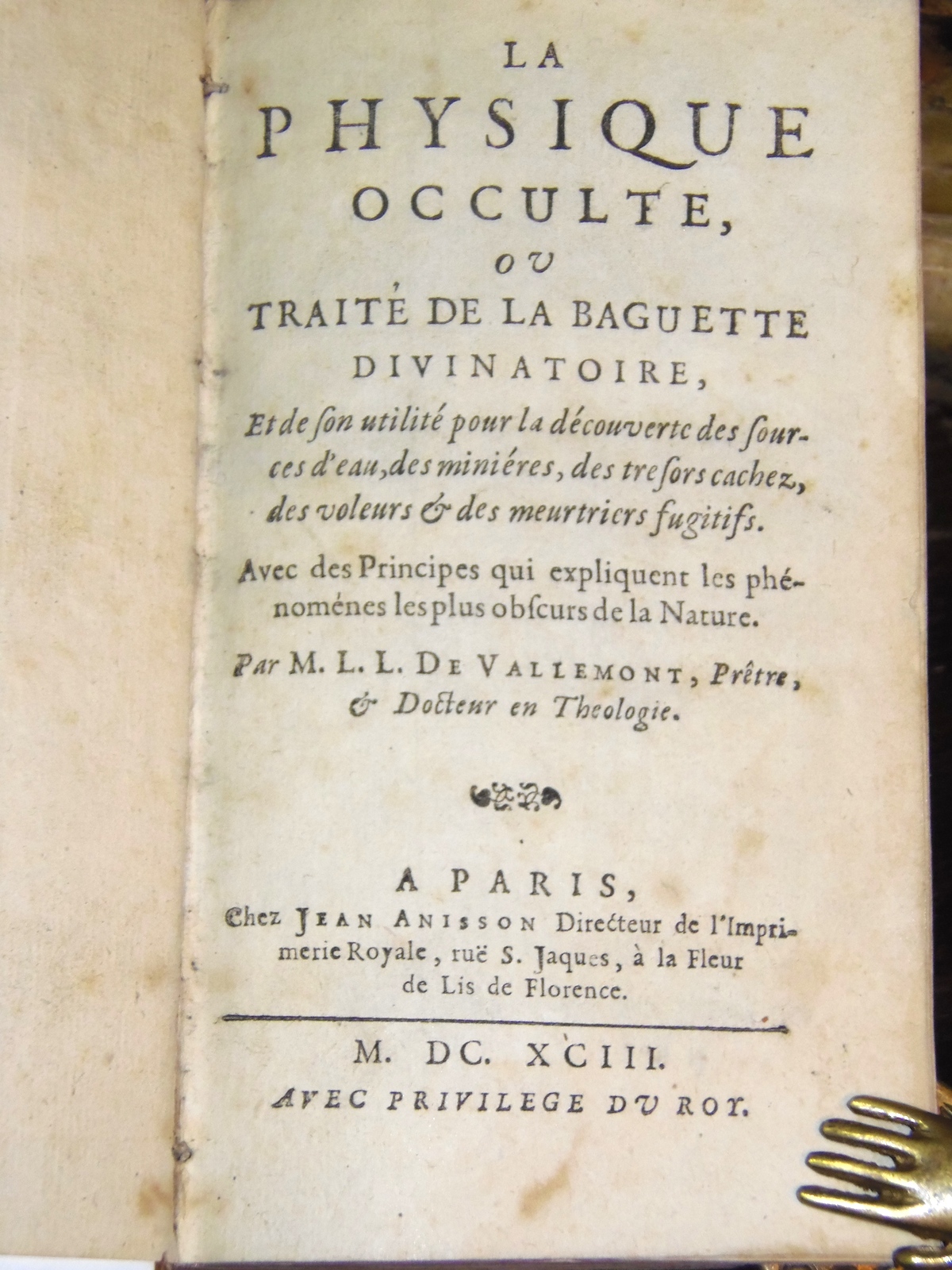 In 8° (160x90) ; pagg. (39), 609, (1) con vignetta in rame all’inizio della dedica, 12 illustrazioni silografiche ed 11 diagrammi a mezza pagina nel testo. Piena pelle coeva con dorso a nervi, scomparti con fregi dorati, tagli a spruzzo rossi. Prima edizione di quest’opera in cui l’aut. cerca di chiarire le proprietà della bacchetta, che come egli ripete non ha nulla a che vedere con la rabdomanzia: si tratta il tema, in gran voga all’epoca, della possibilità di rivelare fenomeni non percebili dall’uomo senza strumenti: le esalazioni e i corpuscoli esalati dai corpi vengono captati dalla bacchetta, il cui movimento deve essere interpretato dall’uomo. L’autore, teologo di Rouen, scrisse di scienze, storia, mistica. Bellissimo esemplare, lievissime tracce d’uso alla leg. Ex libris di Richard De Ruffray.