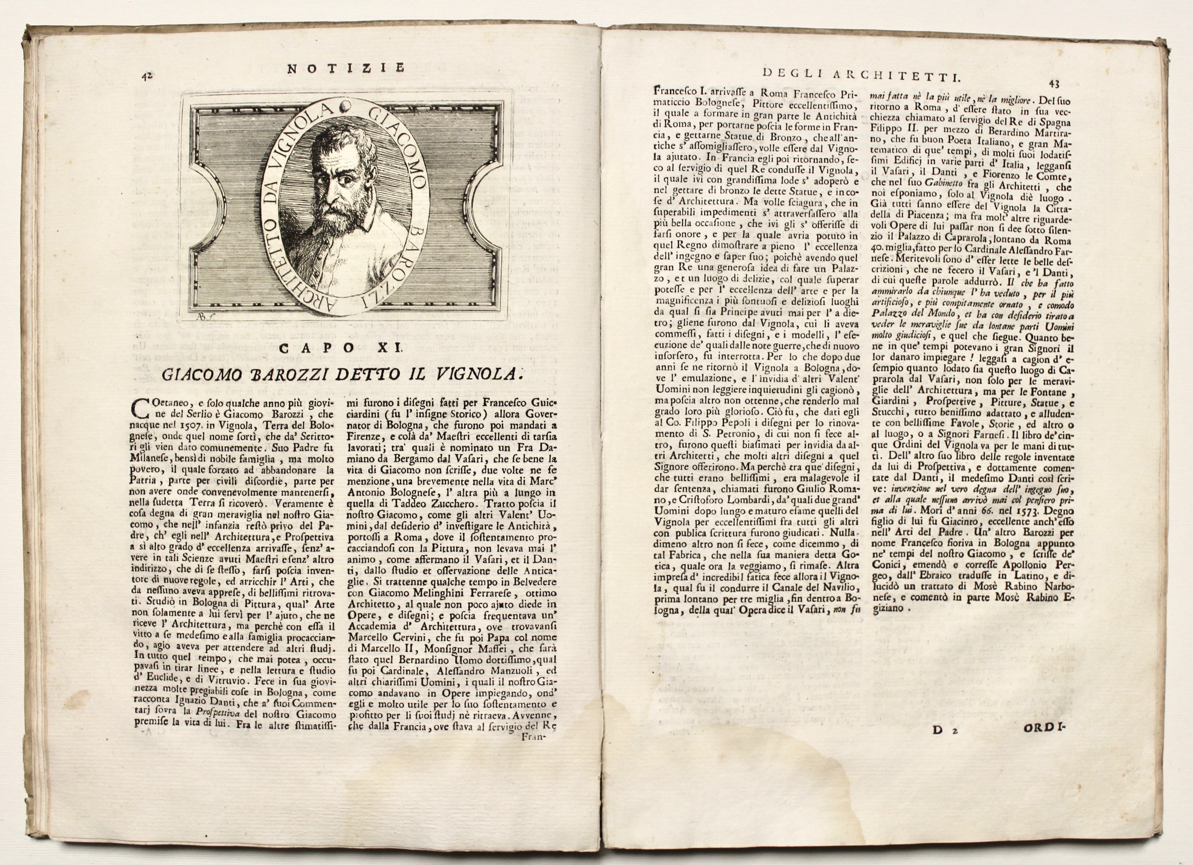 The plates are drawn by Pompei himself on an invention by Gaudenzio Bellini. The antiporta and other engravings are by Antonio Balestra. There is a malnumerazine on p. 104, plat XXXVII is reversed with XXXIV; on p. 67, plat XVII due to a printing error is repeated in place of plat XX, which was not impressed.