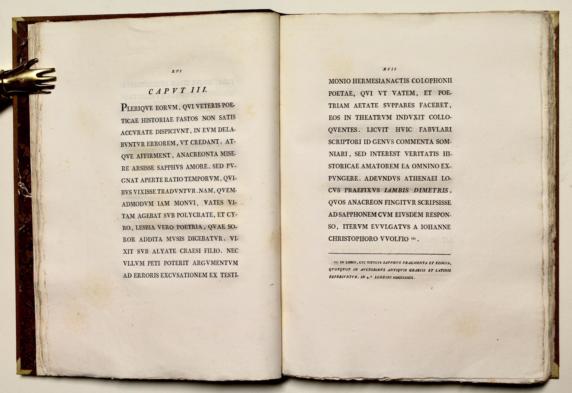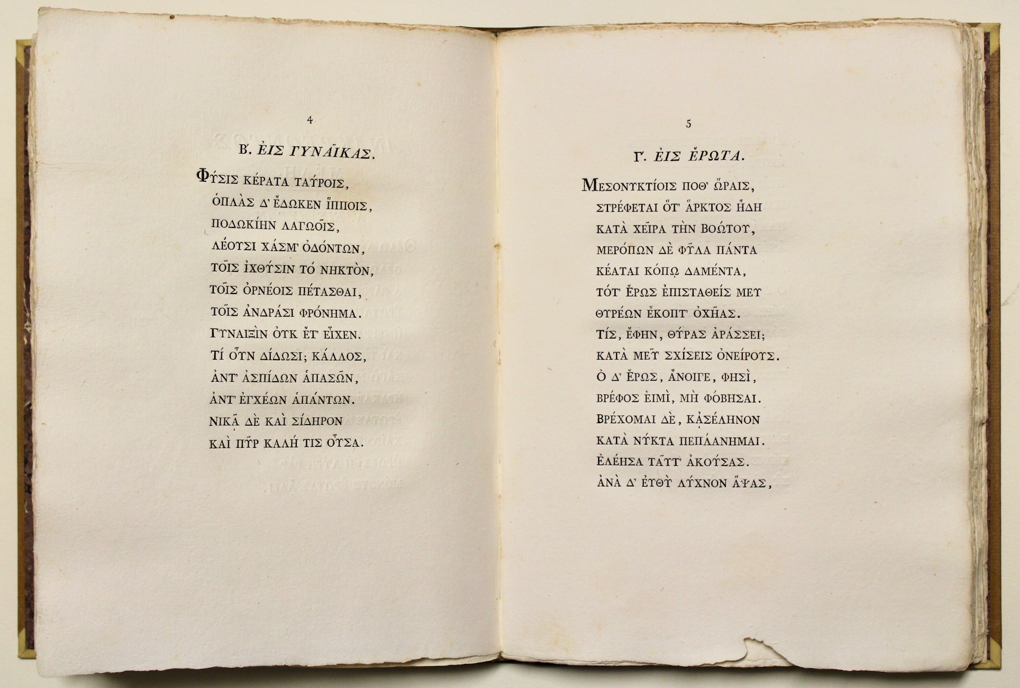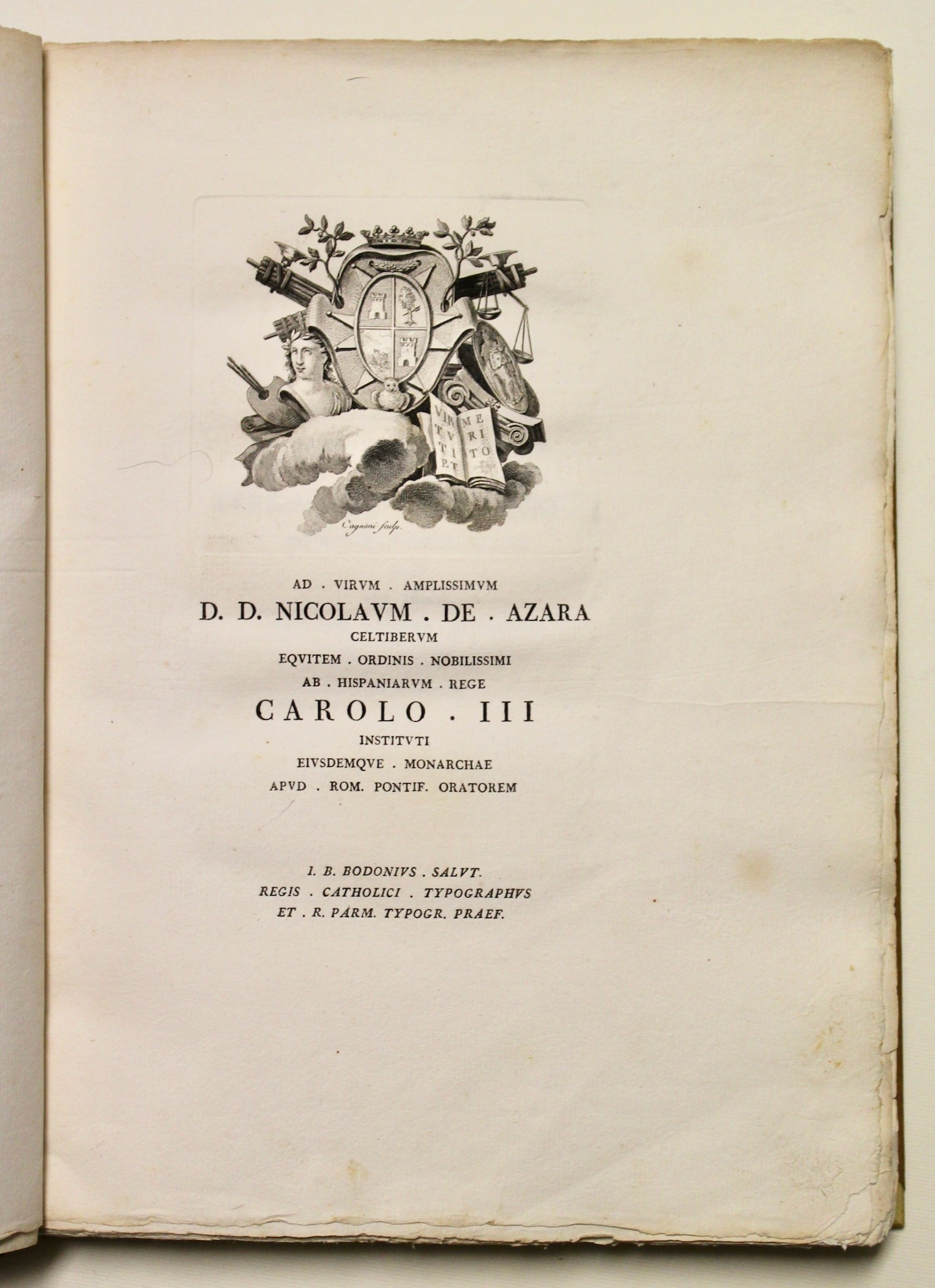 4° (310x220), cc. 3, pp. XCIV, 100; vignetta inc. in rame da Cagnoni al frontespizio ed al foglio di dedica. Legatura amatoriale moderna in mezza pelle con fregi neoclassicic a secco al dorso a nervi. Edizione impressa tutta in caratteri maiuscoli di grande bellezza e nitore. Ottimo esemplare in barbe. Brooks 287: " Magnificamente stampata in caratteri maiuscoli". De Lama pag. 35.