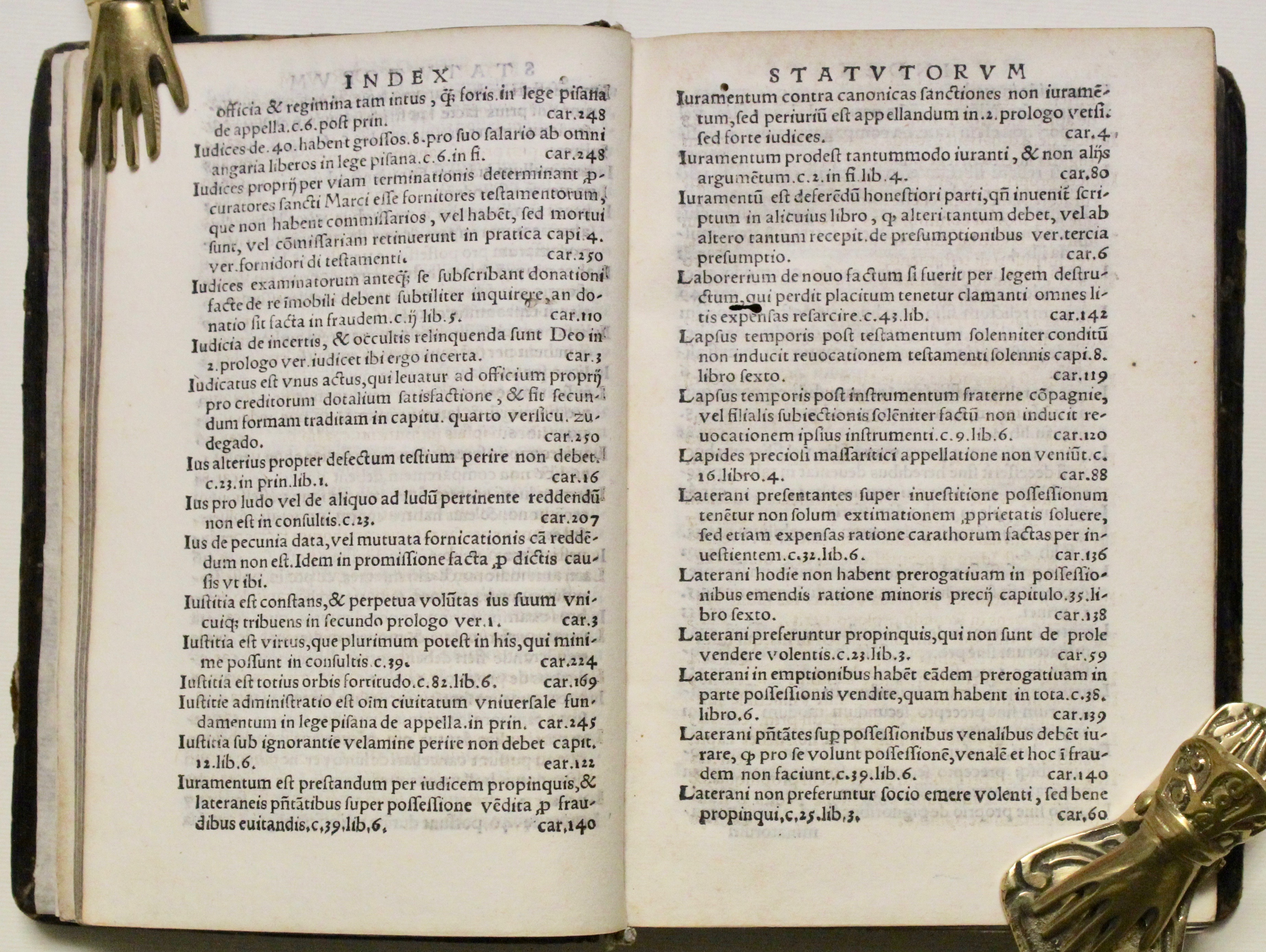 Frontespizio con leone marciano in legno e piccolo timbro di possesso al margine inferiore. Etichetta con ex libris all’interno del piatto anteriore. Legatura coeva in piena pelle con impressioni a secco, tagli scuri, tracce di fermagli in metallo. L’indice con cui inizia l’opera fu redatto da Andrea Trevisano. Gli statuta sono in latino con testo a fronte in volgare veneto. Esemplare in ottimo stato di conservazione. Legatura con tracce del tempo. Piccolo restauro conservativo alle cuffie.