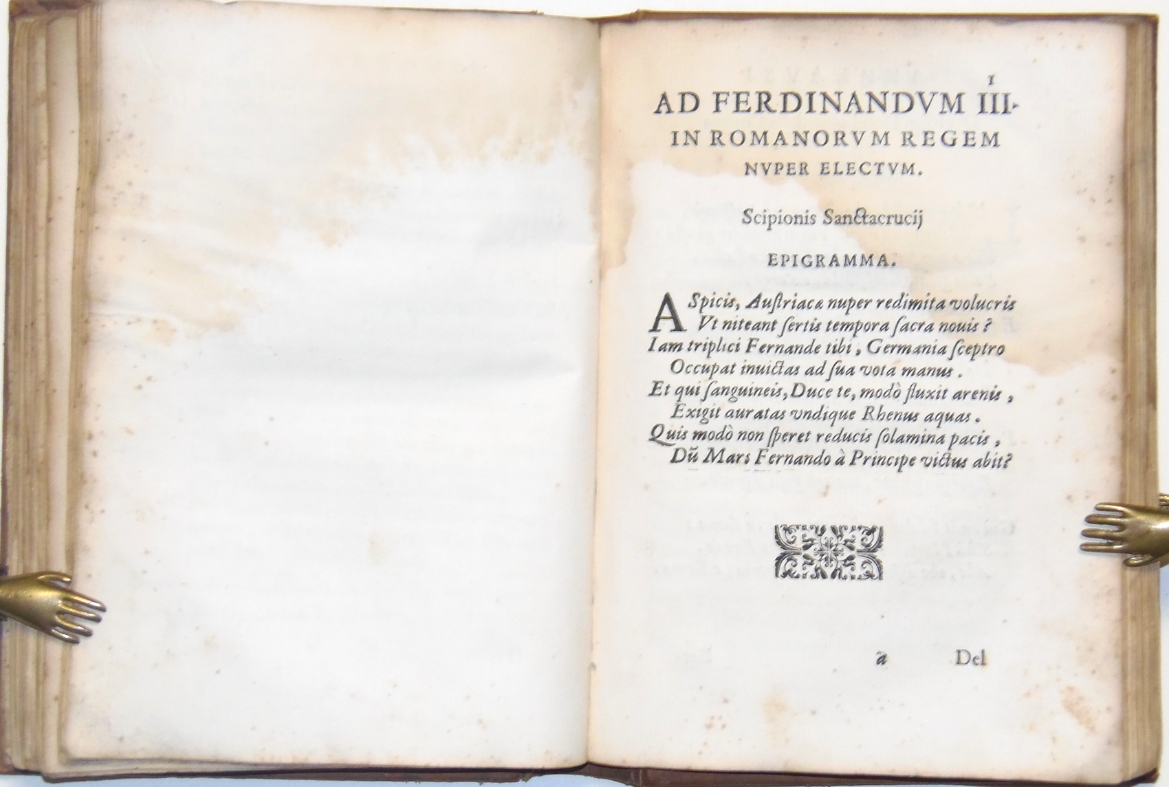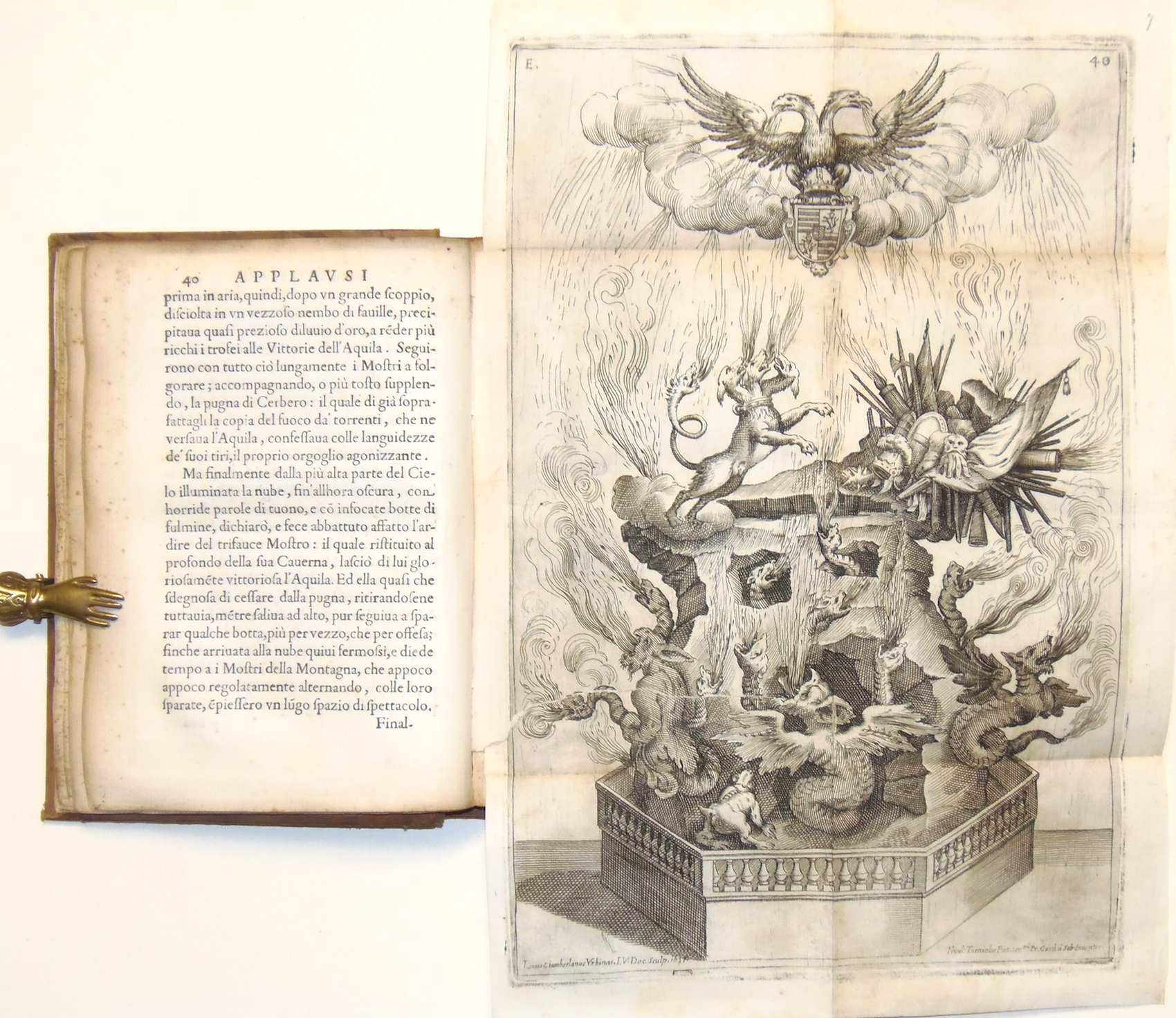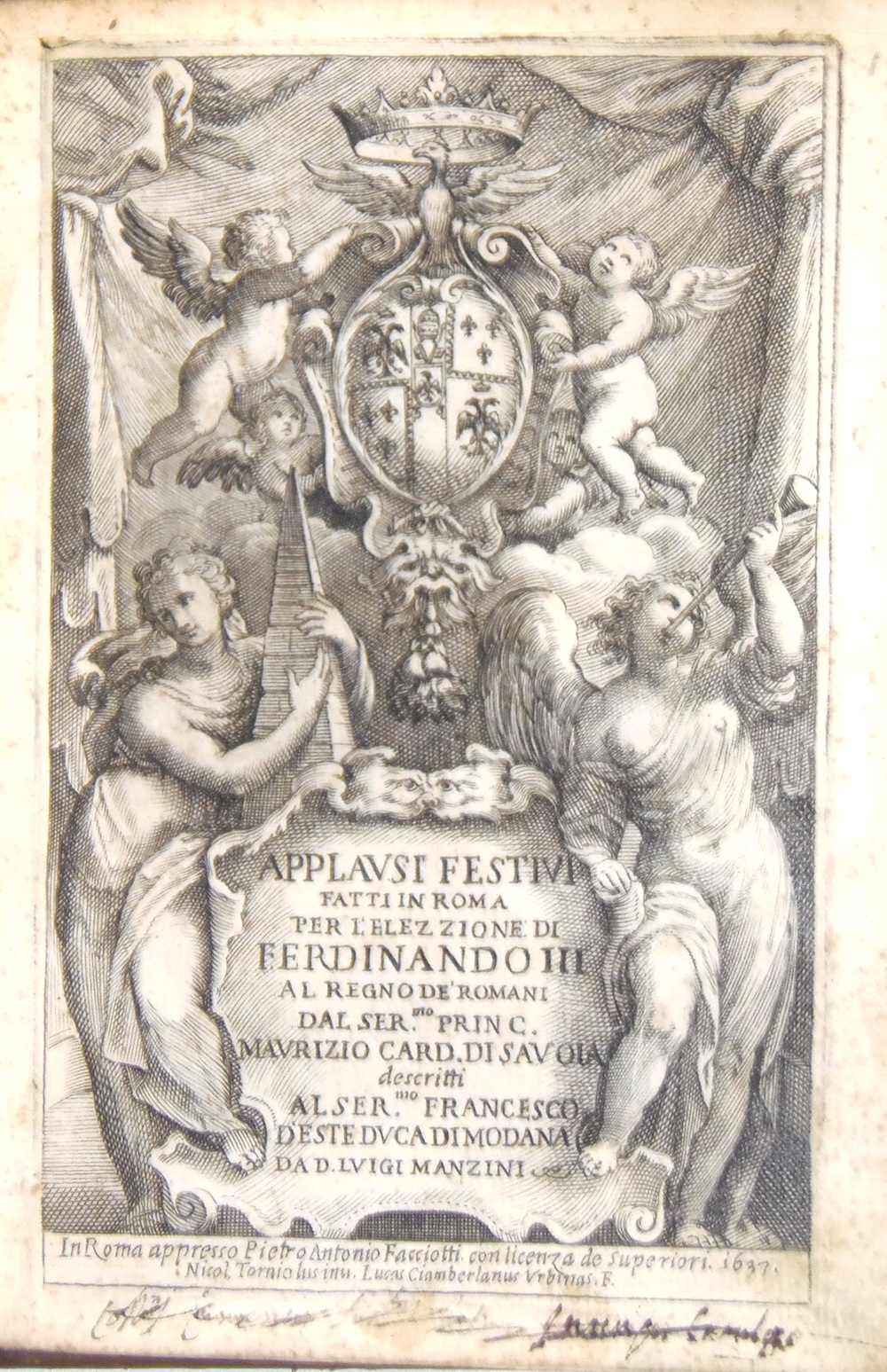 Prima edizione di quest’opera che venne redatta per l’elezione a re di Roma nel 1636 di Ferdinando d’Asburgo re d’Ungheria e di Boemia, futuro imperatore del Sacro Romano Impero. Per l’occasione furono organizzati grandiosi festeggiamenti su commissione del cardinale Maurizio di Savoia, che fece trasformare la piazza antistante Monte Giordano, in un grandioso teatro barocco su progetto di Orazio Turiani.