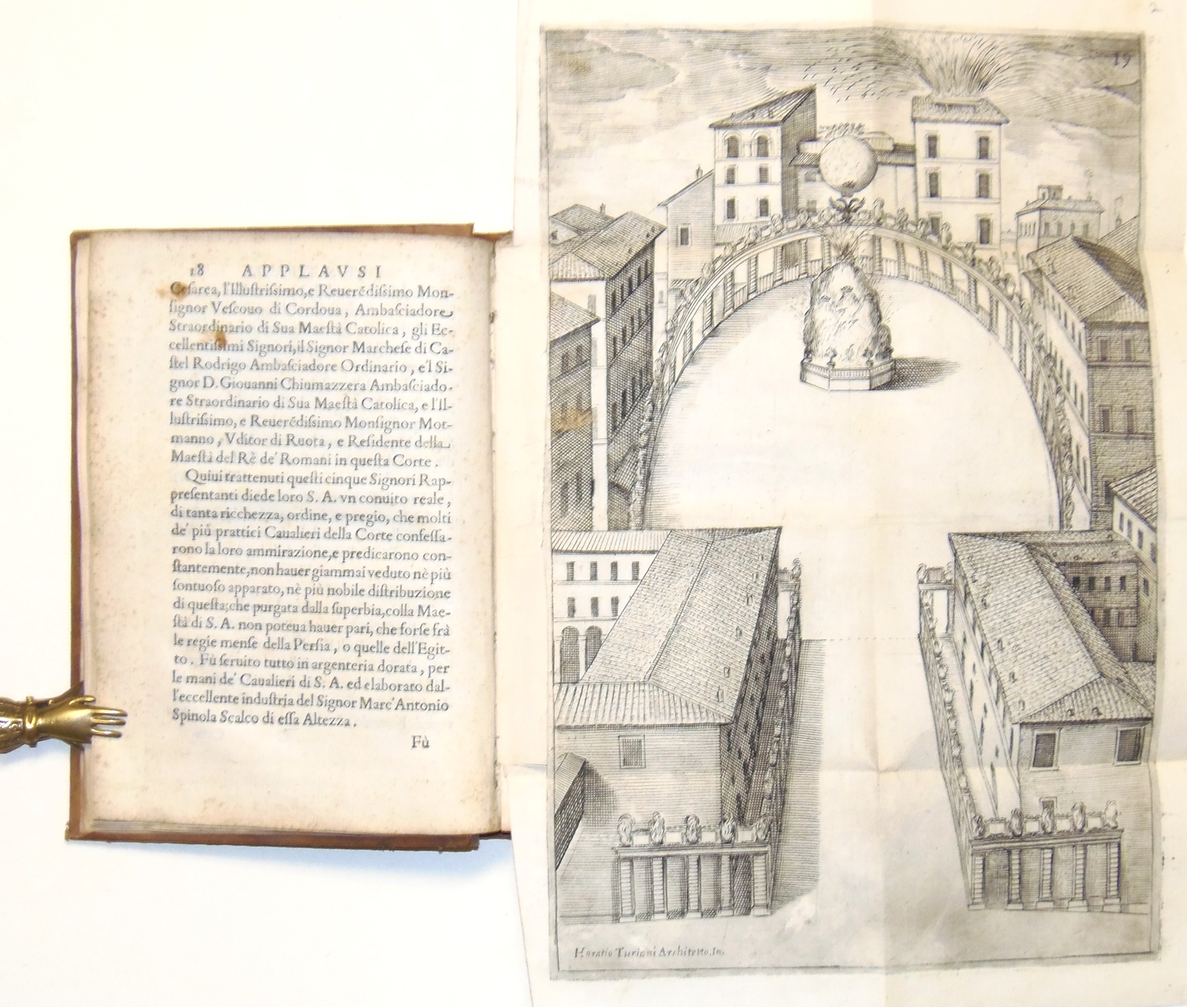 Ruggeri 797; Berlin Kat. 3046; Olscki, Choix, 17483,”Ouvrages courieux surtout pour les planches des machines pyrotecniques dressées pour l’occasion”; Fagiolo Bibl. della festa barocca a Roma, 134.