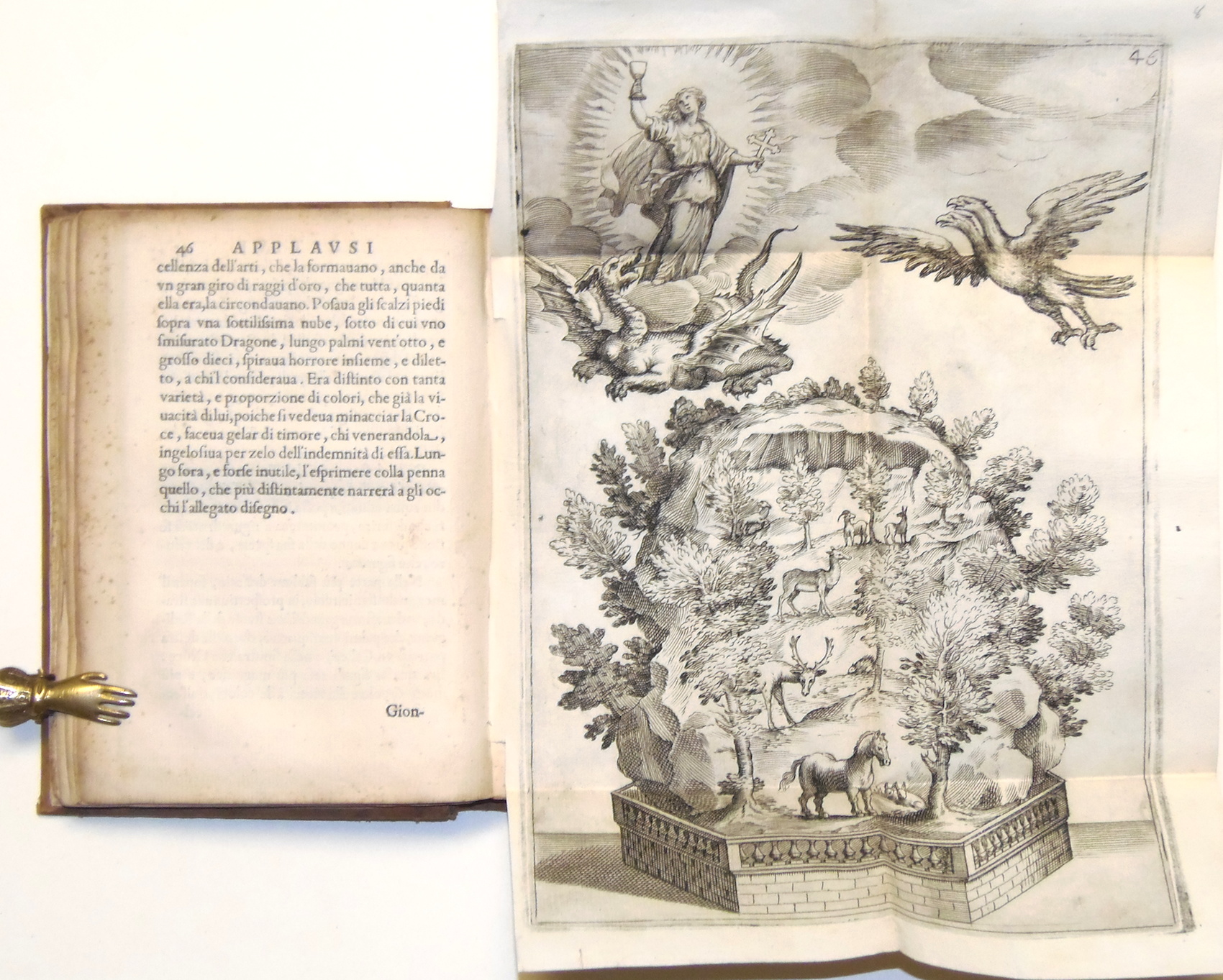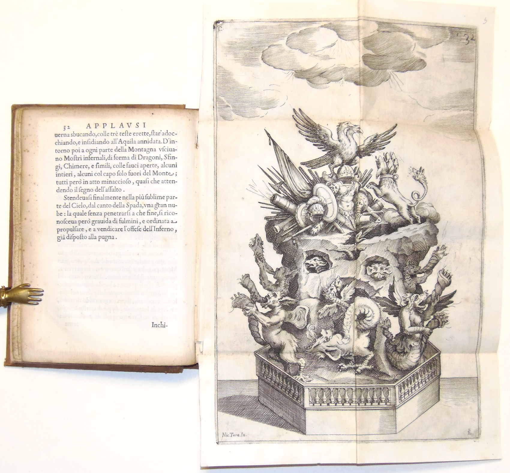 In 4° (220x155); pagg. 90 (mal numerate 92), 1 carta bianca, 72, frontespizio inciso in rame a piena pagina con allegorie e stemma di Ferdinando D’Asburgo sostenuto da putti alati. Assai raffinato l’apparato iconografico rappresentato da 11 belle tavole a piena pag. f.t. ripiegate più volte, incise in rame da Luca Ciamberlano su disegni originali di Orazio Turiani e Niccolò Torniolo. Grandi incisioni in legno ai capilettera che sono inscritti entro grandi vignette, fregi silografici. Piena pelle ottocentesca con note editoriali incise in oro al dorso.