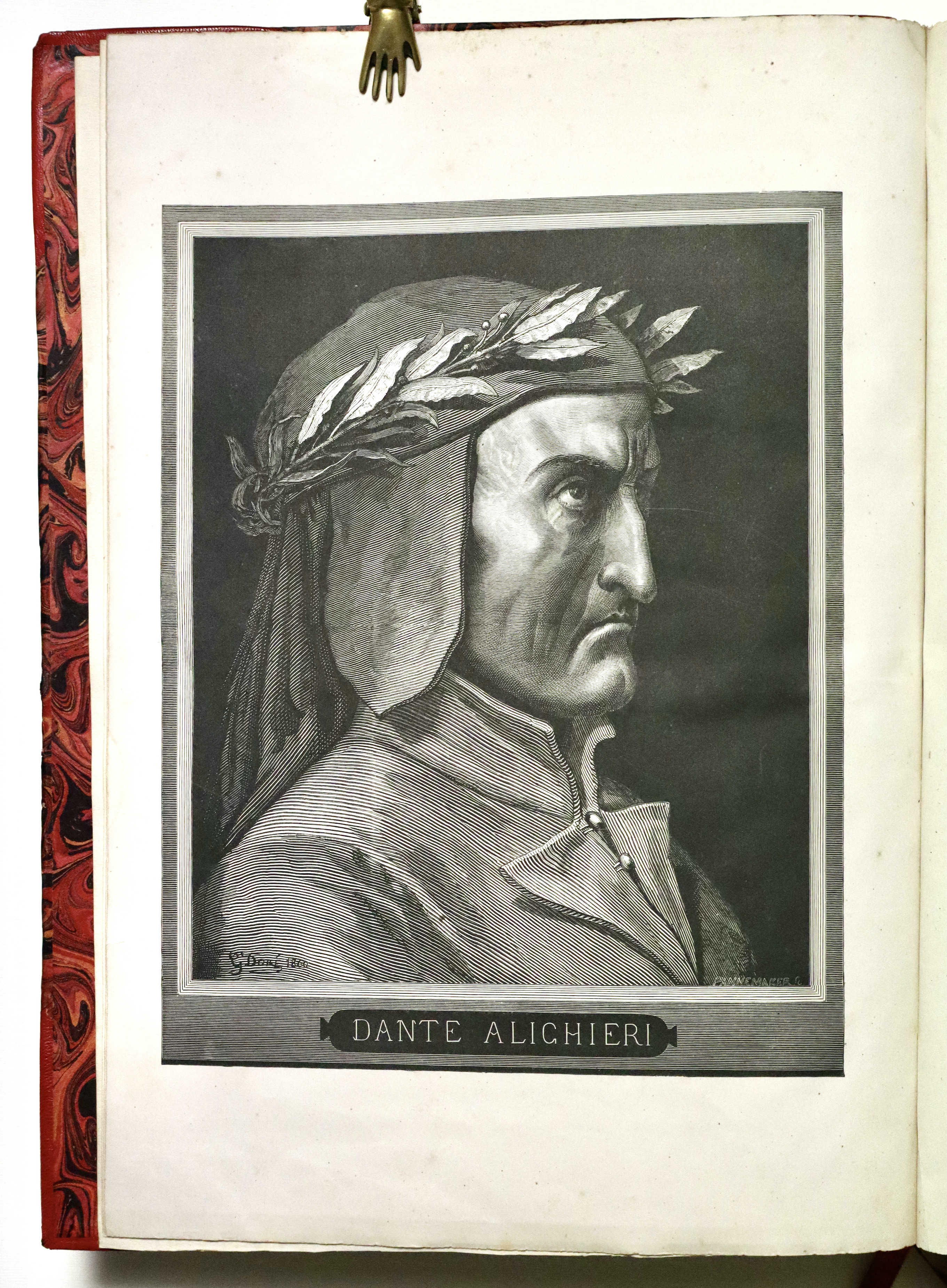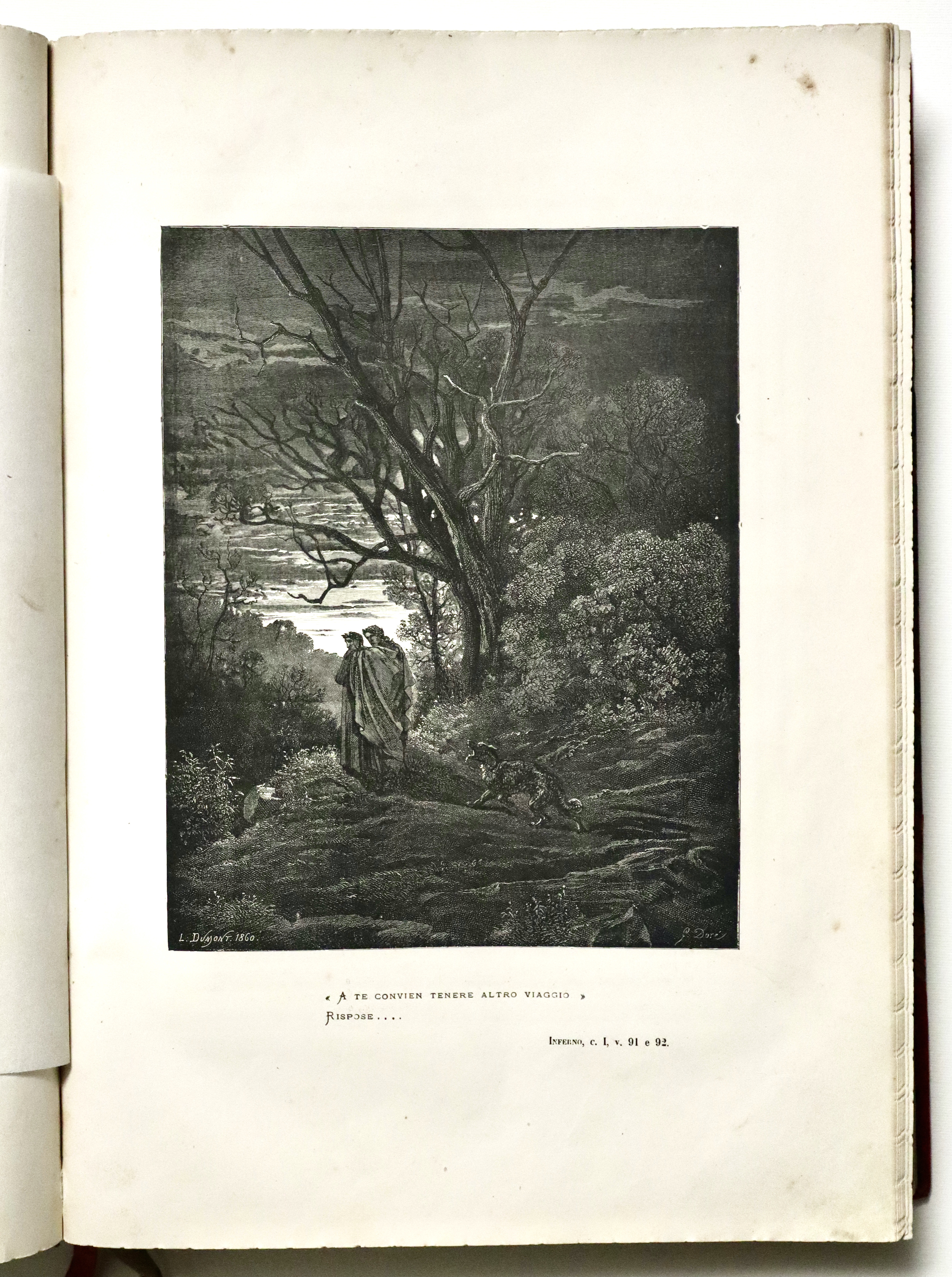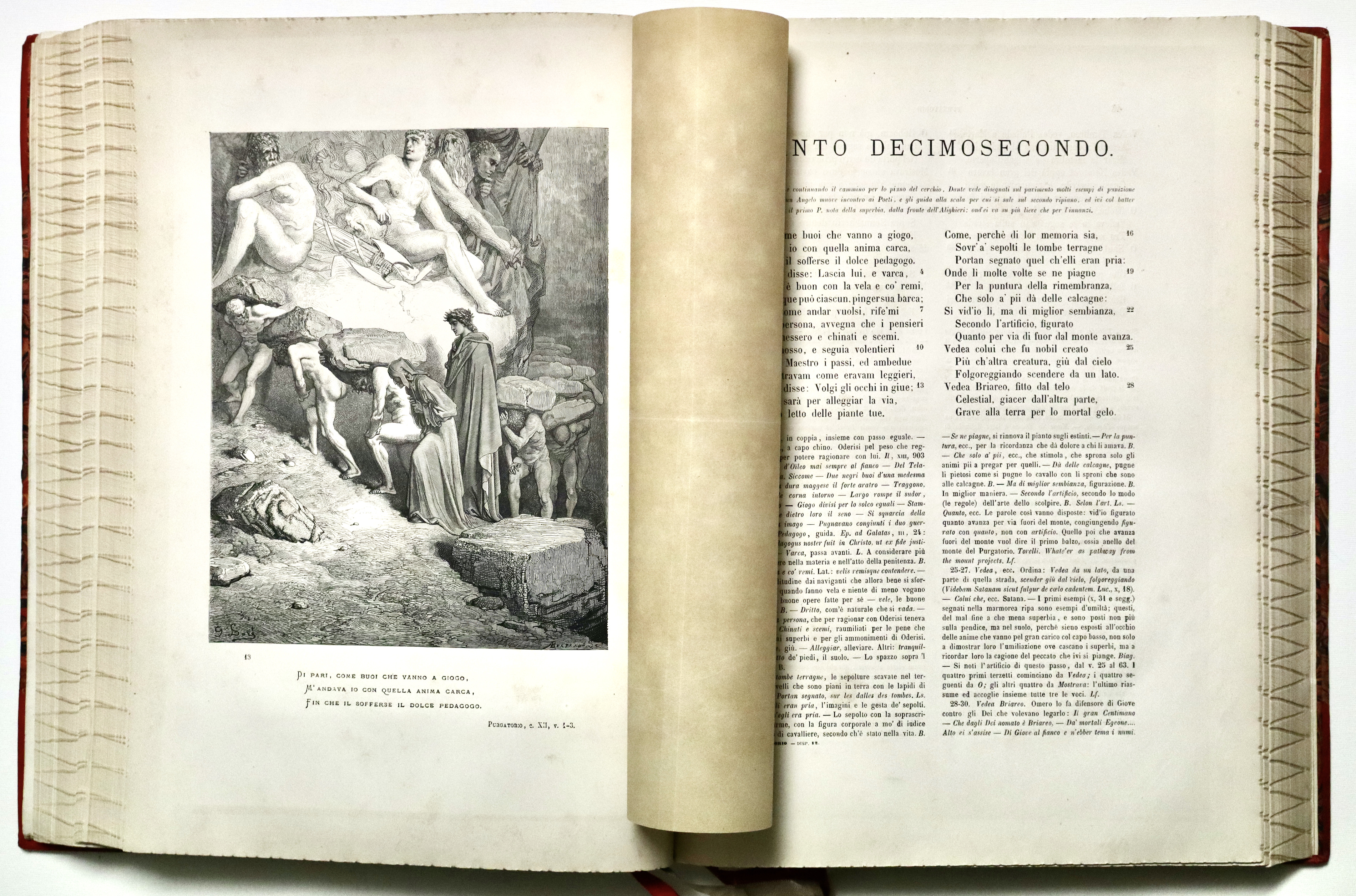 It features an introduction to Dante's life and works, a magnificent iconographic complement of 135 full-page woodcuts (as described above, 75 for the Inferno, 42 for the Purgatory, and 18 for the Paradise), and a frontispiece to the first volume with a portrait of Dante; the text is arranged in two columns and is completed by notes "taken from the best ancient and modern interpreters" edited by Eugenio Camerini.Bound in elegant red half-leather with hazelnut and red marbled corners and boards, gilt title on the spine with six raised bands, gilt titles and embellishments. Blind-decorated borders with a Florentine fleur-de-lis along the boards and corners. Embossed edges. The hazelnut and red silk bookmarks are preserved. The 135 woodcuts are all protected by pink, yellow, and white colored tissue paper.
