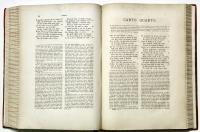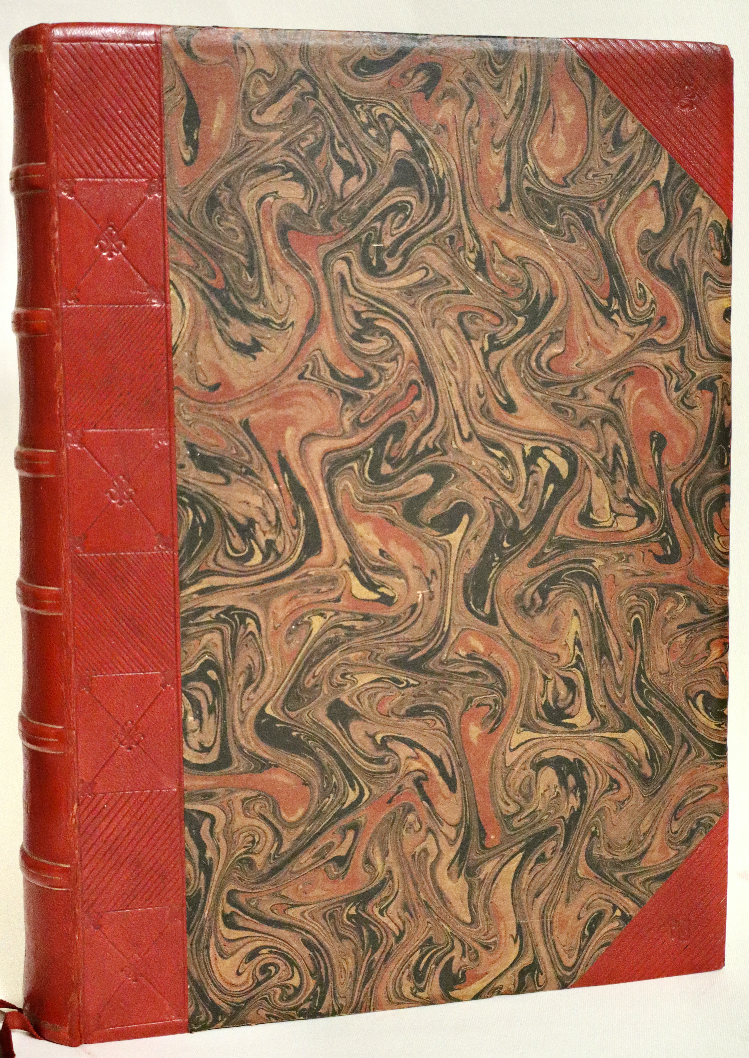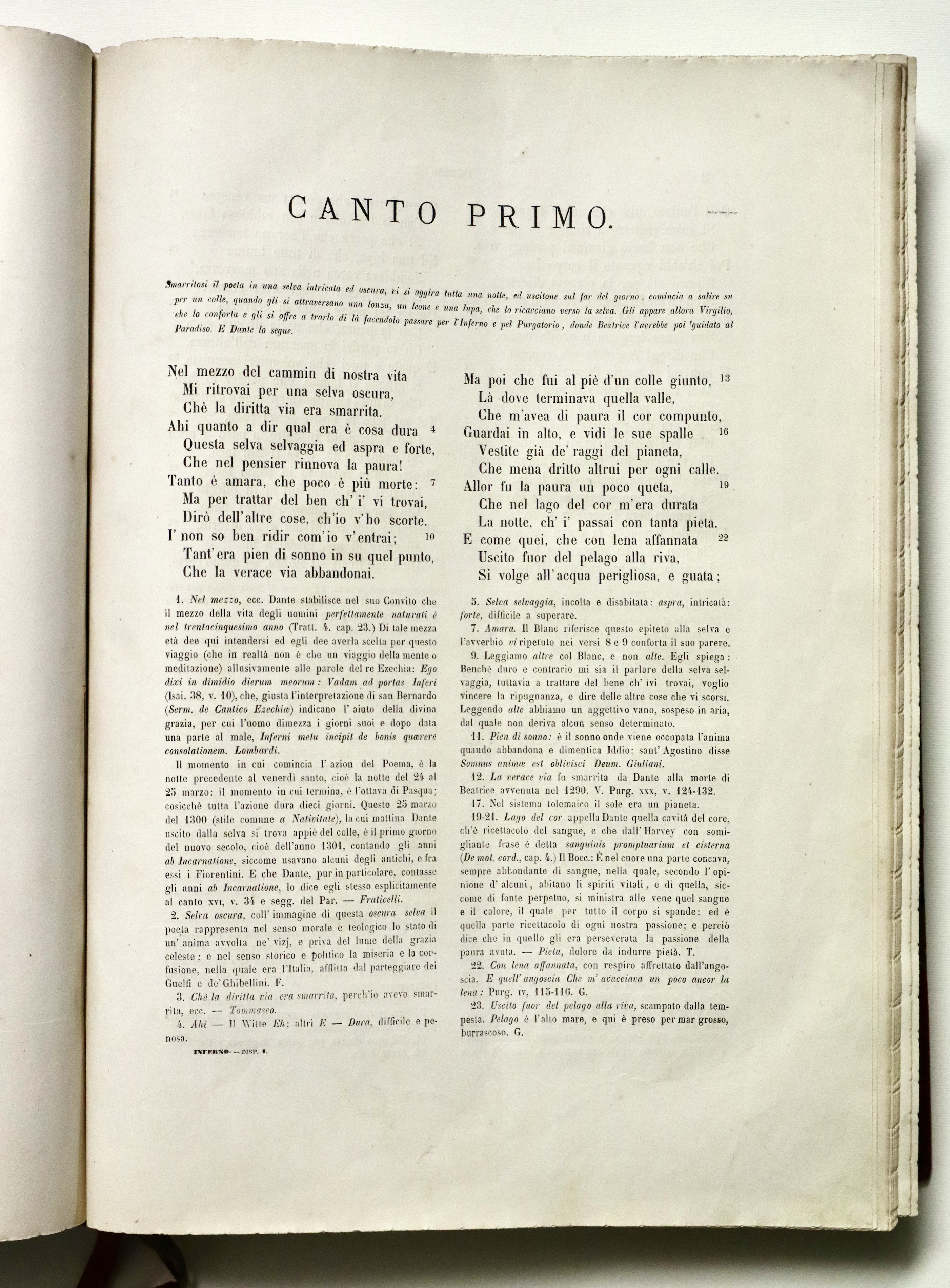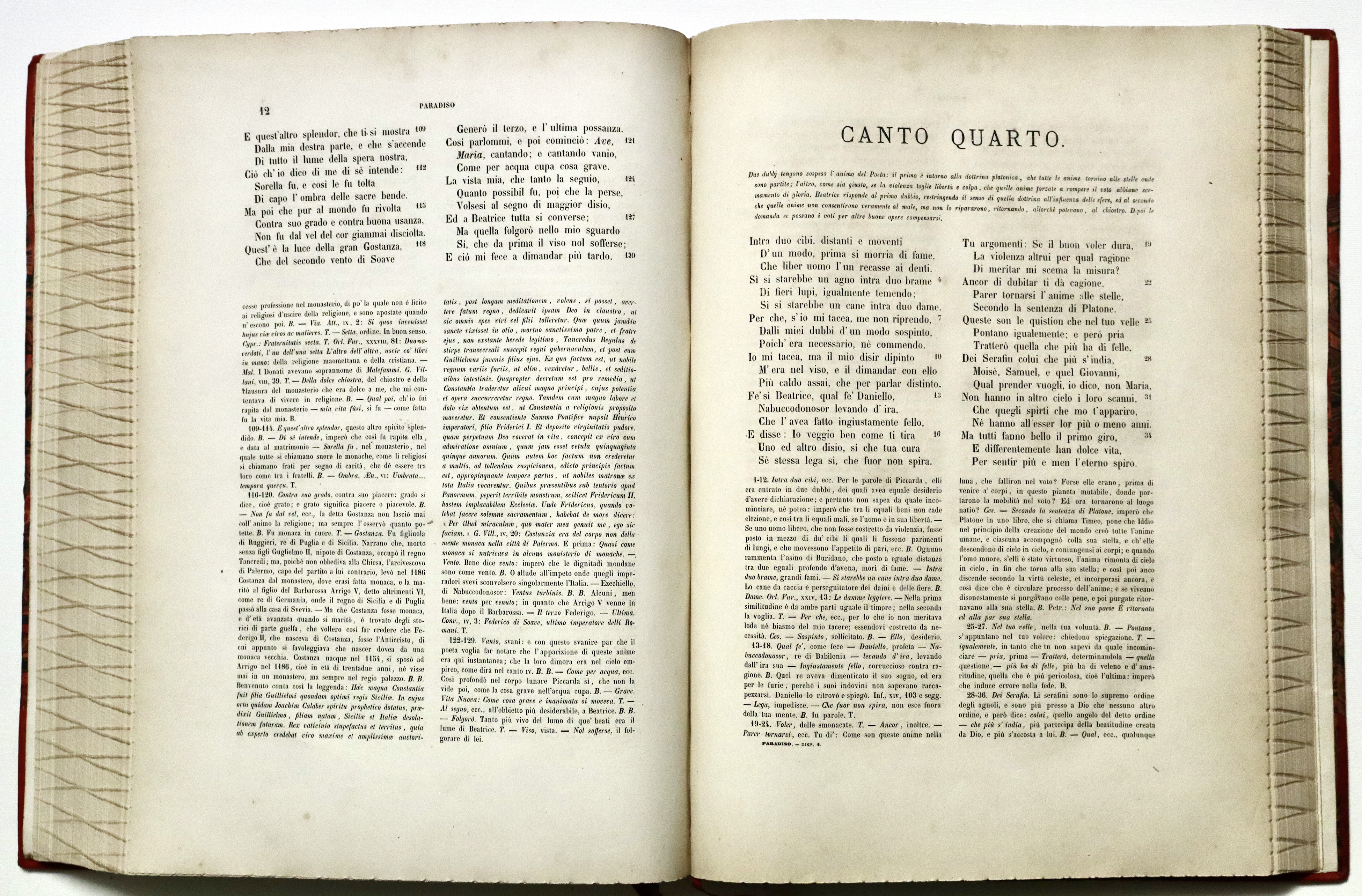 It features an introduction to Dante's life and works, a magnificent iconographic complement of 135 full-page woodcuts (as described above, 75 for the Inferno, 42 for the Purgatory, and 18 for the Paradise), and a frontispiece to the first volume with a portrait of Dante; the text is arranged in two columns and is completed by notes "taken from the best ancient and modern interpreters" edited by Eugenio Camerini.Bound in elegant red half-leather with hazelnut and red marbled corners and boards, gilt title on the spine with six raised bands, gilt titles and embellishments. Blind-decorated borders with a Florentine fleur-de-lis along the boards and corners. Embossed edges. The hazelnut and red silk bookmarks are preserved. The 135 woodcuts are all protected by pink, yellow, and white colored tissue paper.
