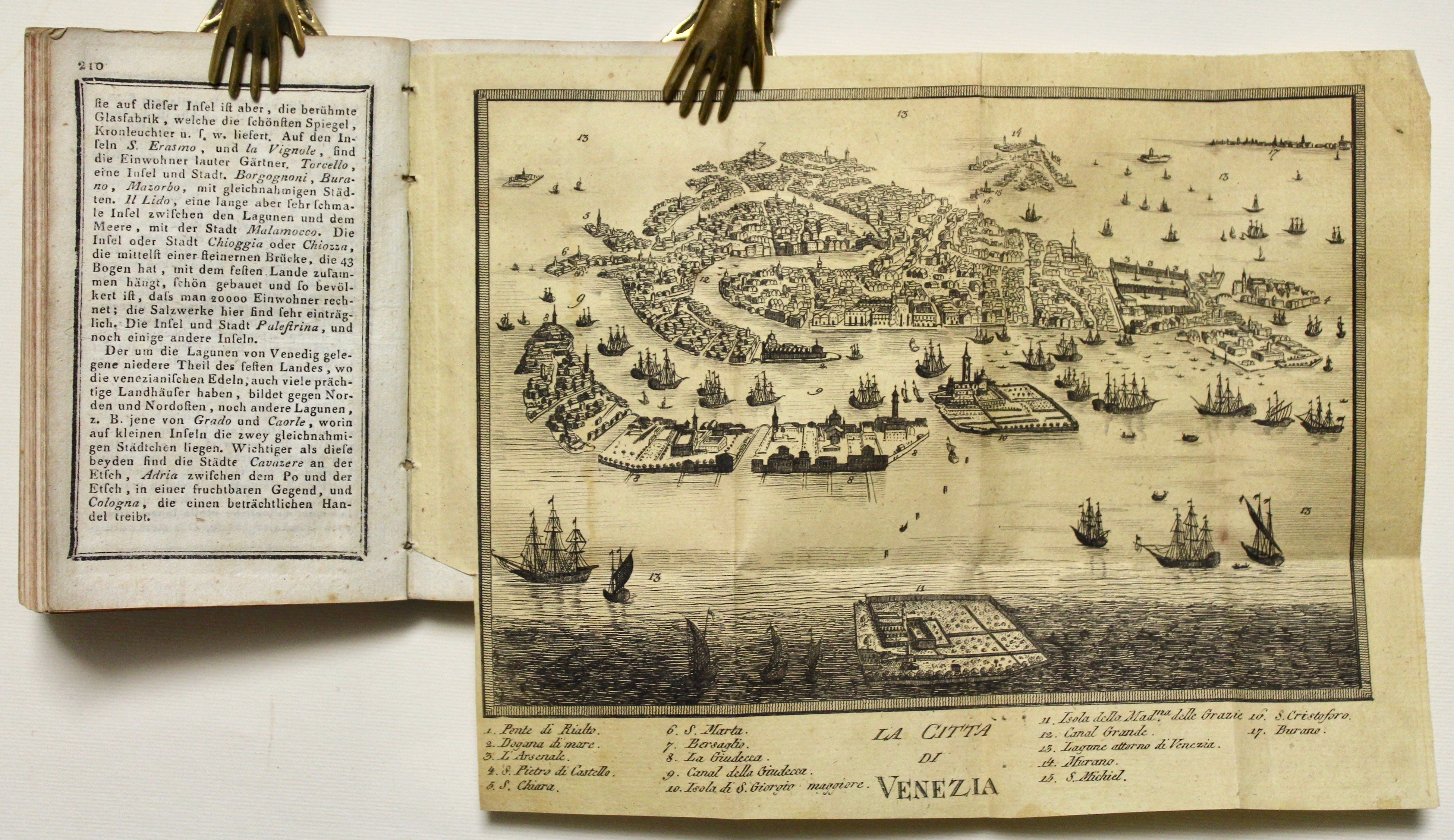 In 12°(mm 130x80). Pagg. VIII, 263. Cartoncino verde editoriale.Titolo su etichetta al dorso. Bella vignetta in rame a colori d’epoca al frontespizio, con due putti abbigliati di cappello e baionetta che giocano a scacchi su un tamburo. Testo inquadrato da doppio filetto silografico, numerosi finalini sempre in legno; tagli a spruzzo. Una tavola f.t. incisa in rame, ripiegata più volte che raffigura una rara veduta di Venezia (non vi sono riferimenti tipografici). Bell’esemplare genuino, ben conservato. Alcune note sottolineate o cassate ad inchiostro antico. Piccole mende al dorso.