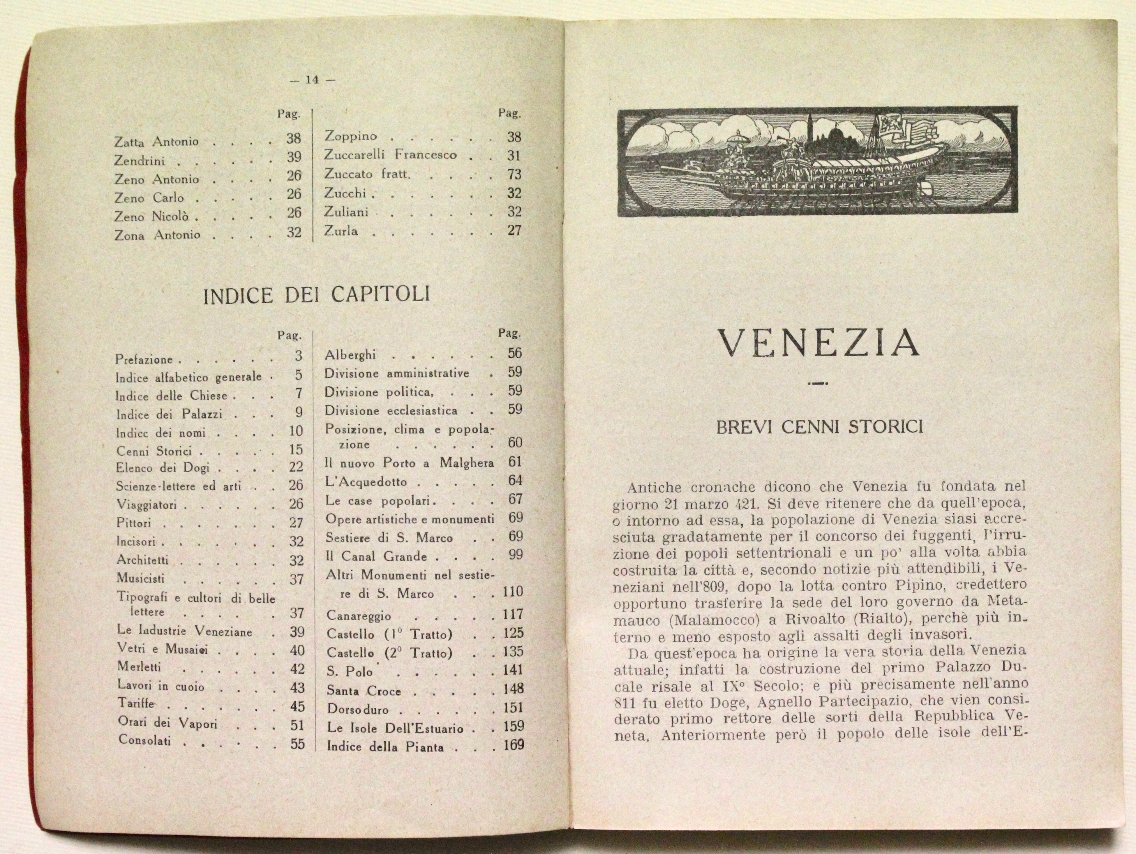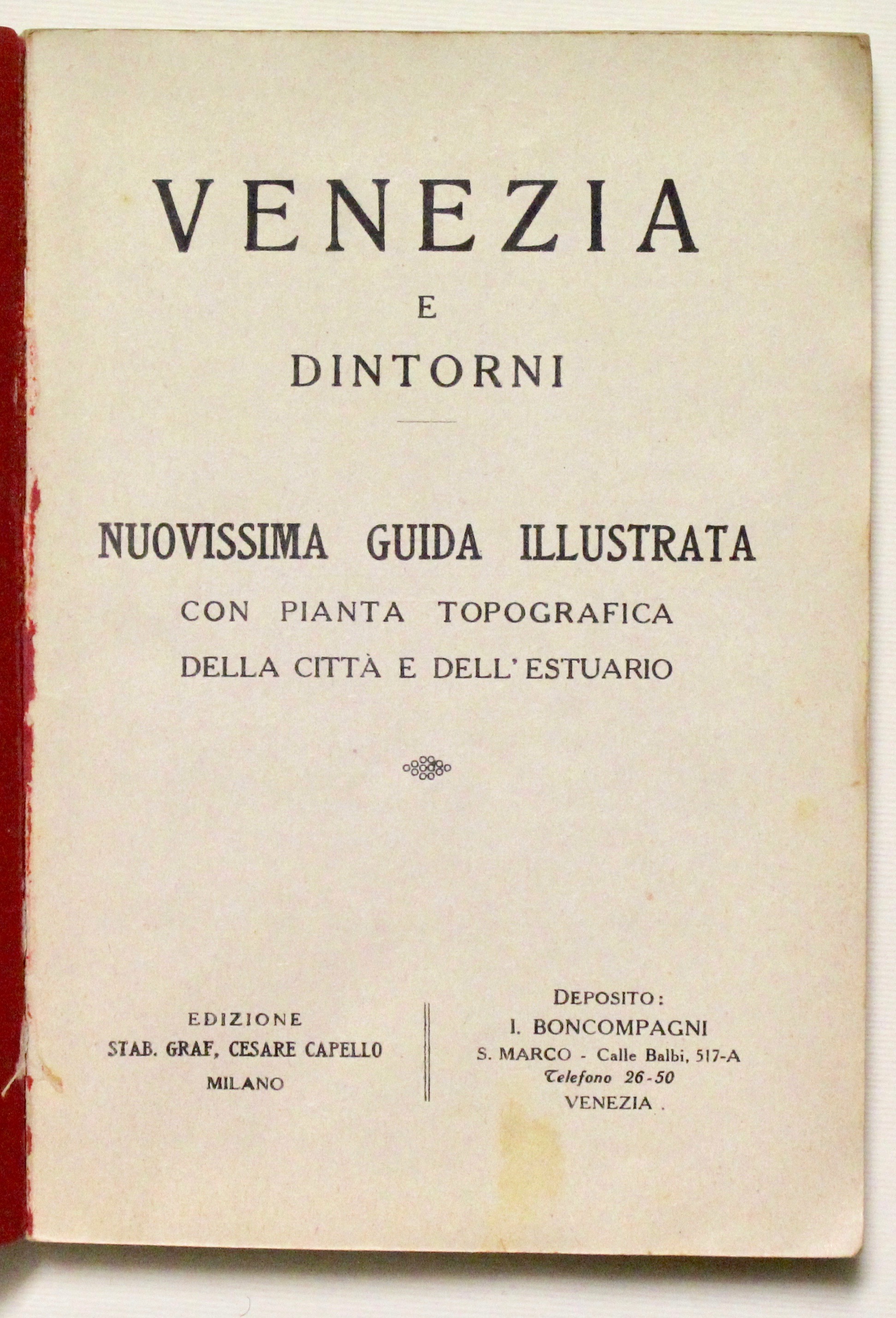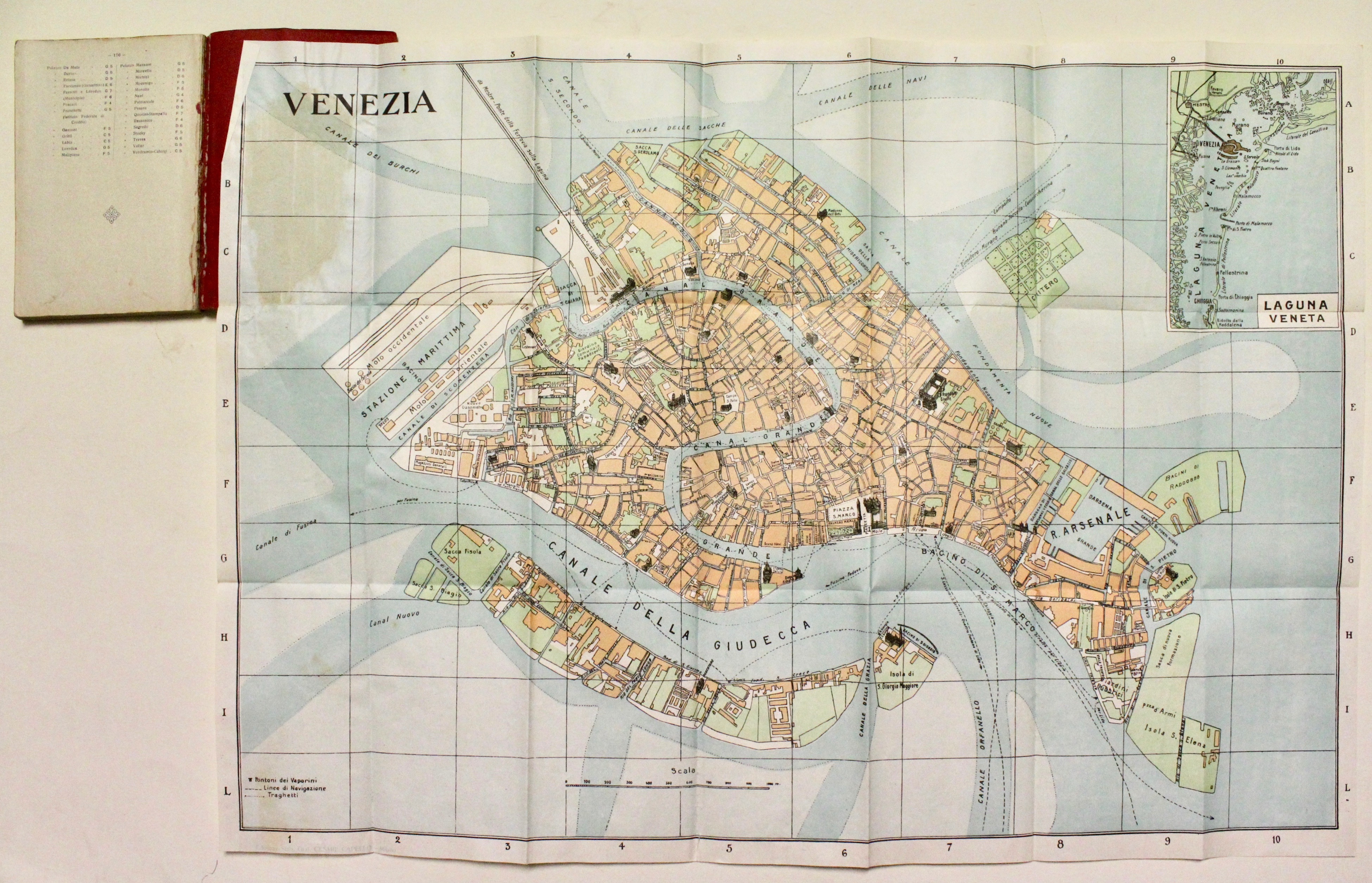 In 16° (mm 170x110); pagg. 178 con numerose illustrazioni fotografiche di varie dimensioni e una grande pianta a colori di Venezia, più volte ripiegata. Cartoncino editoriale policromo con titolo e decorazioni impresse. Bell’esemplare
