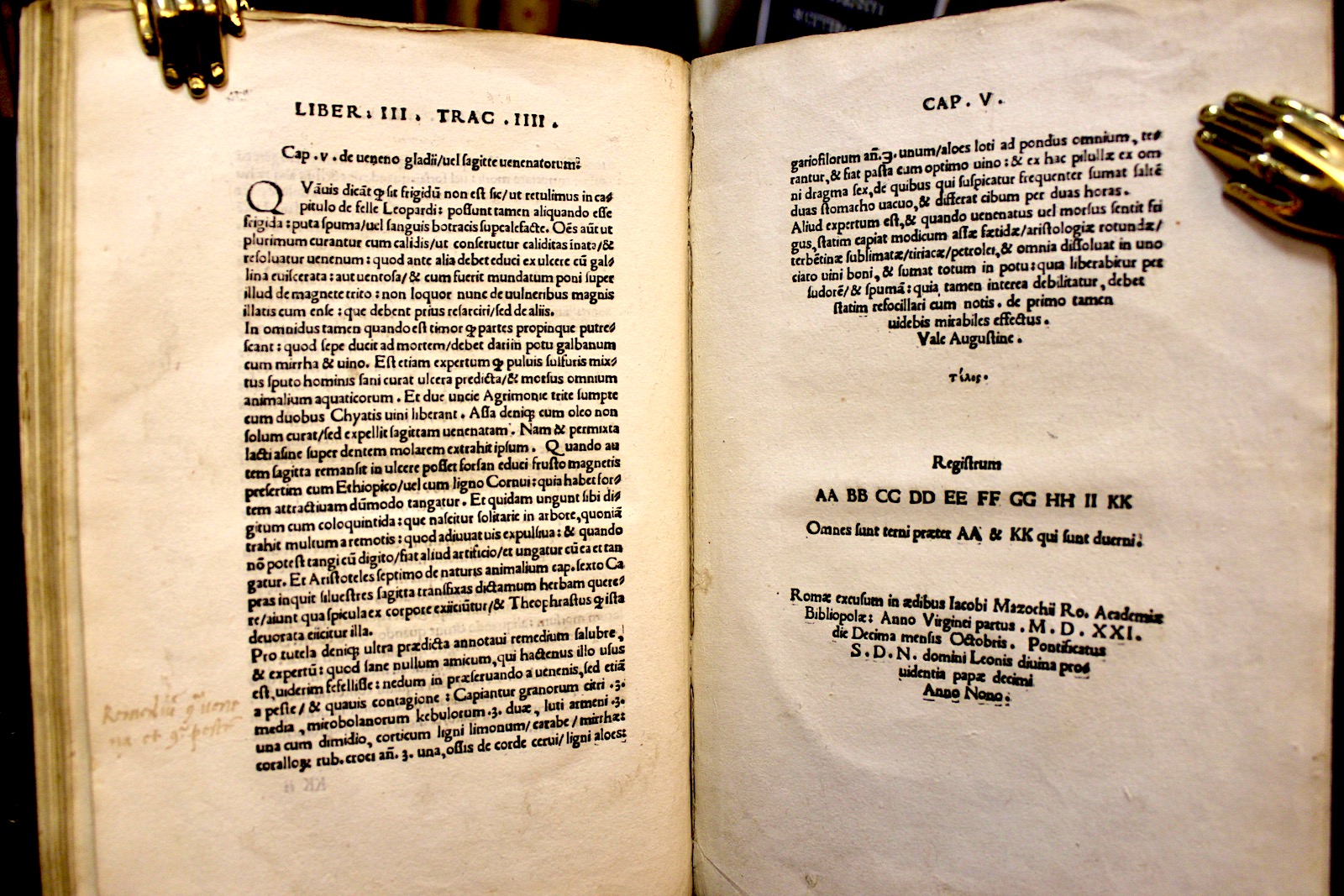 Libellus de venenis a Ferdinando Ponzetto tituli sancti Pancratii presbitero cardinali editus. (al colophon): Romae excusum in aedibus Iacobi Mazochii Romanae academiae Bibliopolae: Anno Virginis partus 1521 die decima mensis Octobris.