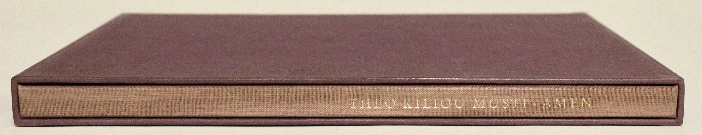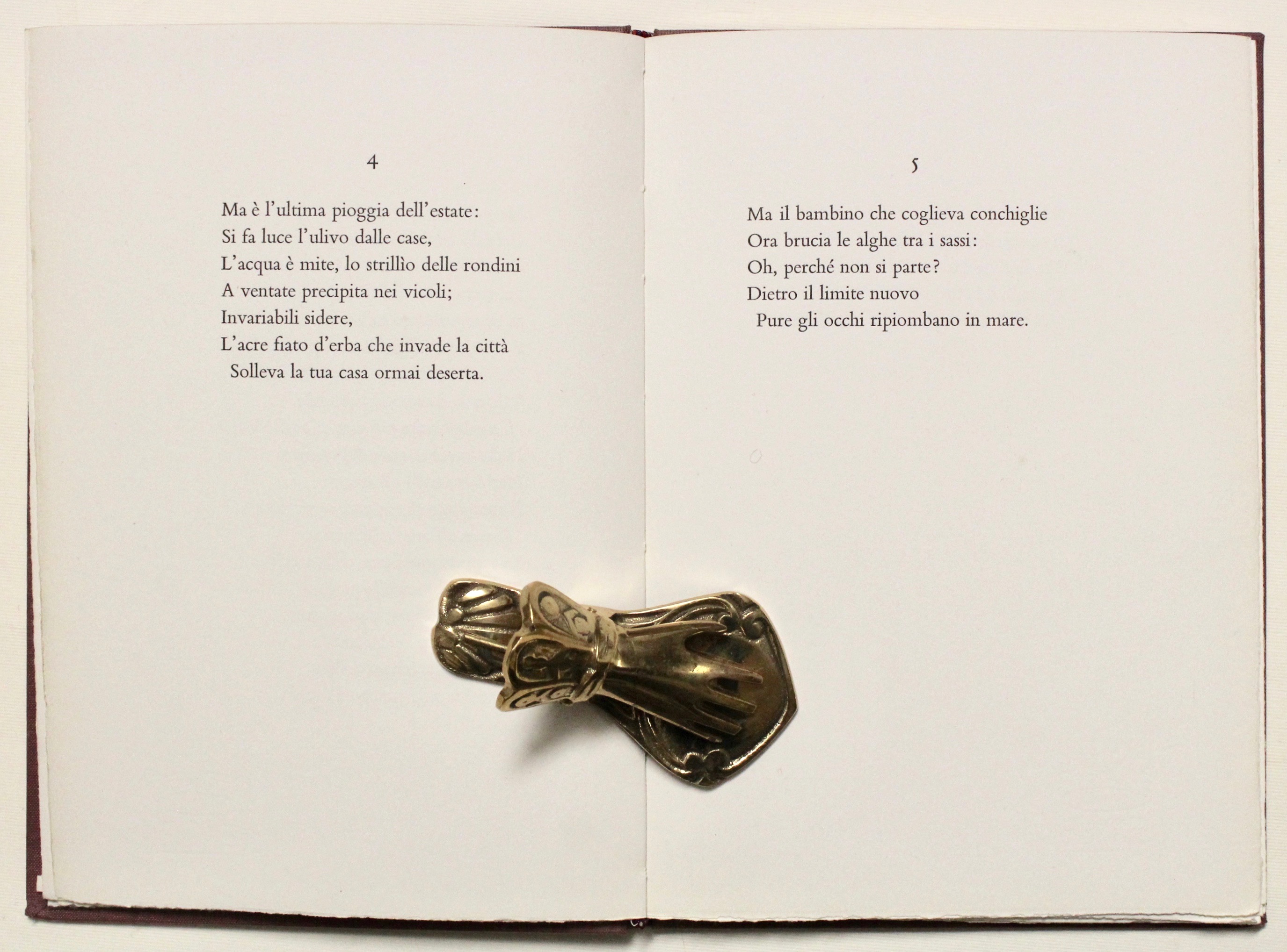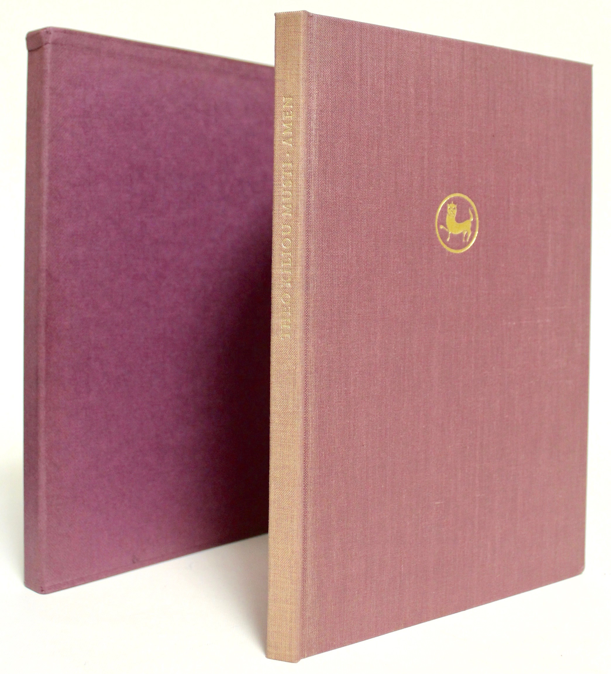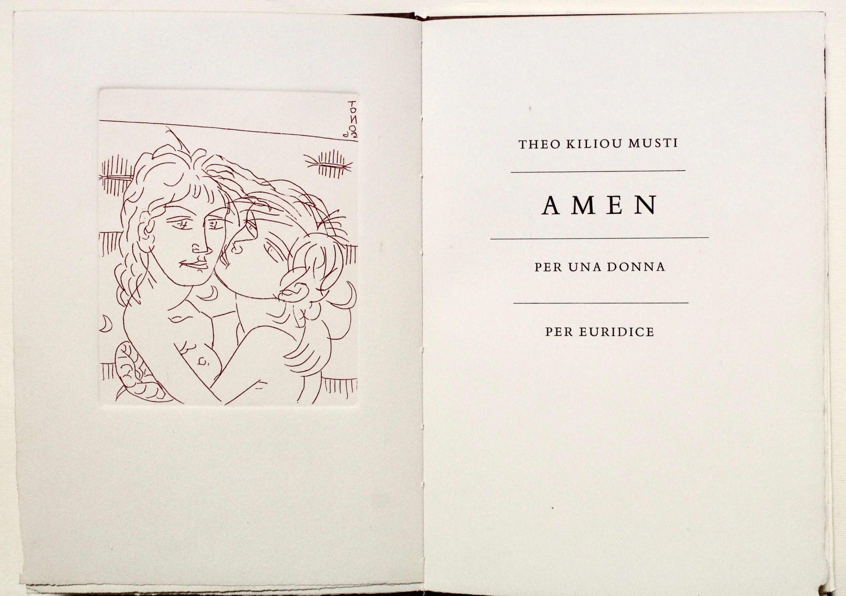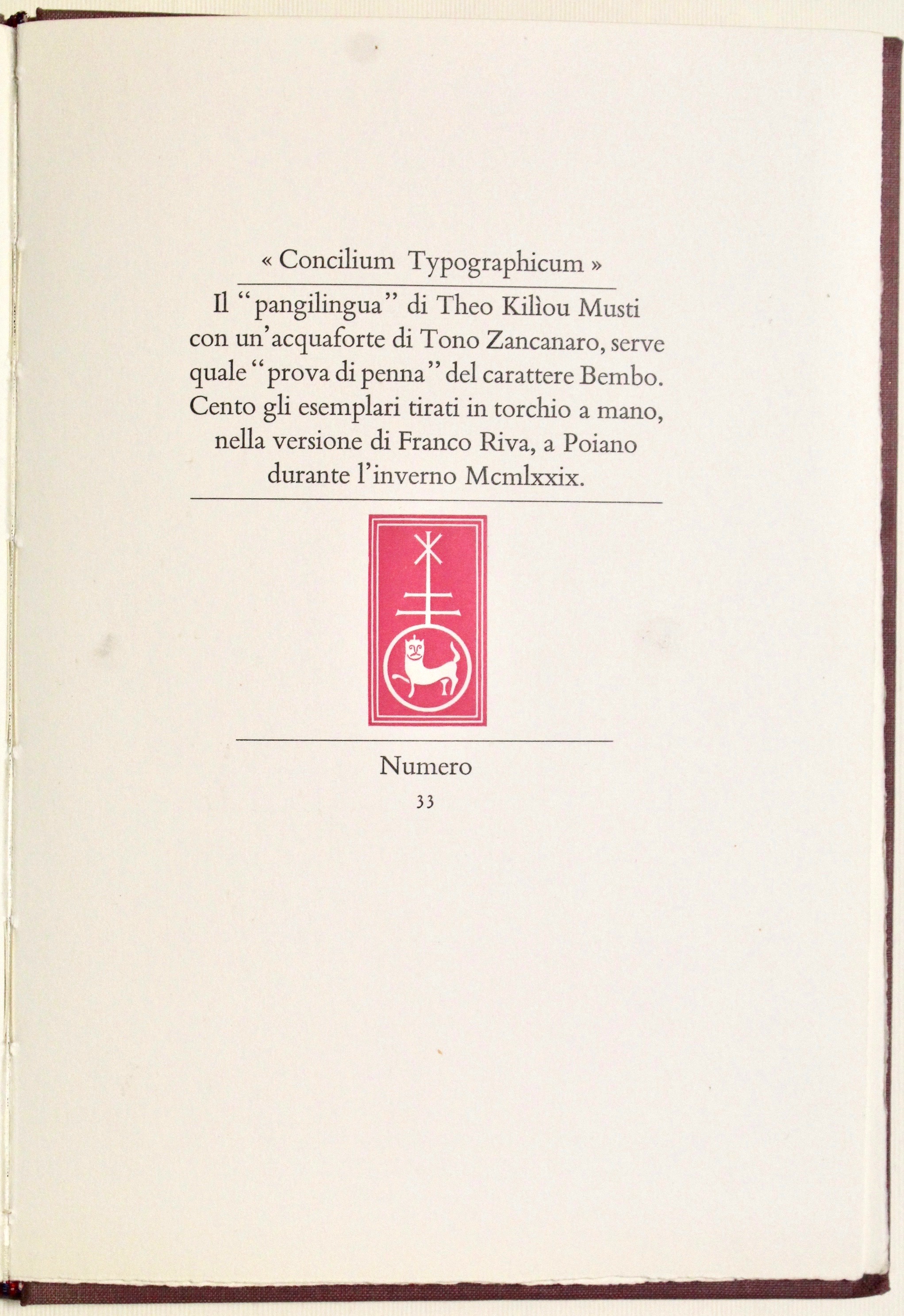 In 8° (mm 240x170); pagg. 21, 5 con una acquaforte di Tono Zancanaro, firmata in lastra e stampata in violetto; testo in carattere Bembo tondo su carta Magnani. Leg. in tela edit. con astuccio color vinaccia. Tiratura di 100 esempl. numerati (n. 32 il nostro). Perfettamente conservato, solo il dorso lievemente schiarito dalla luce.