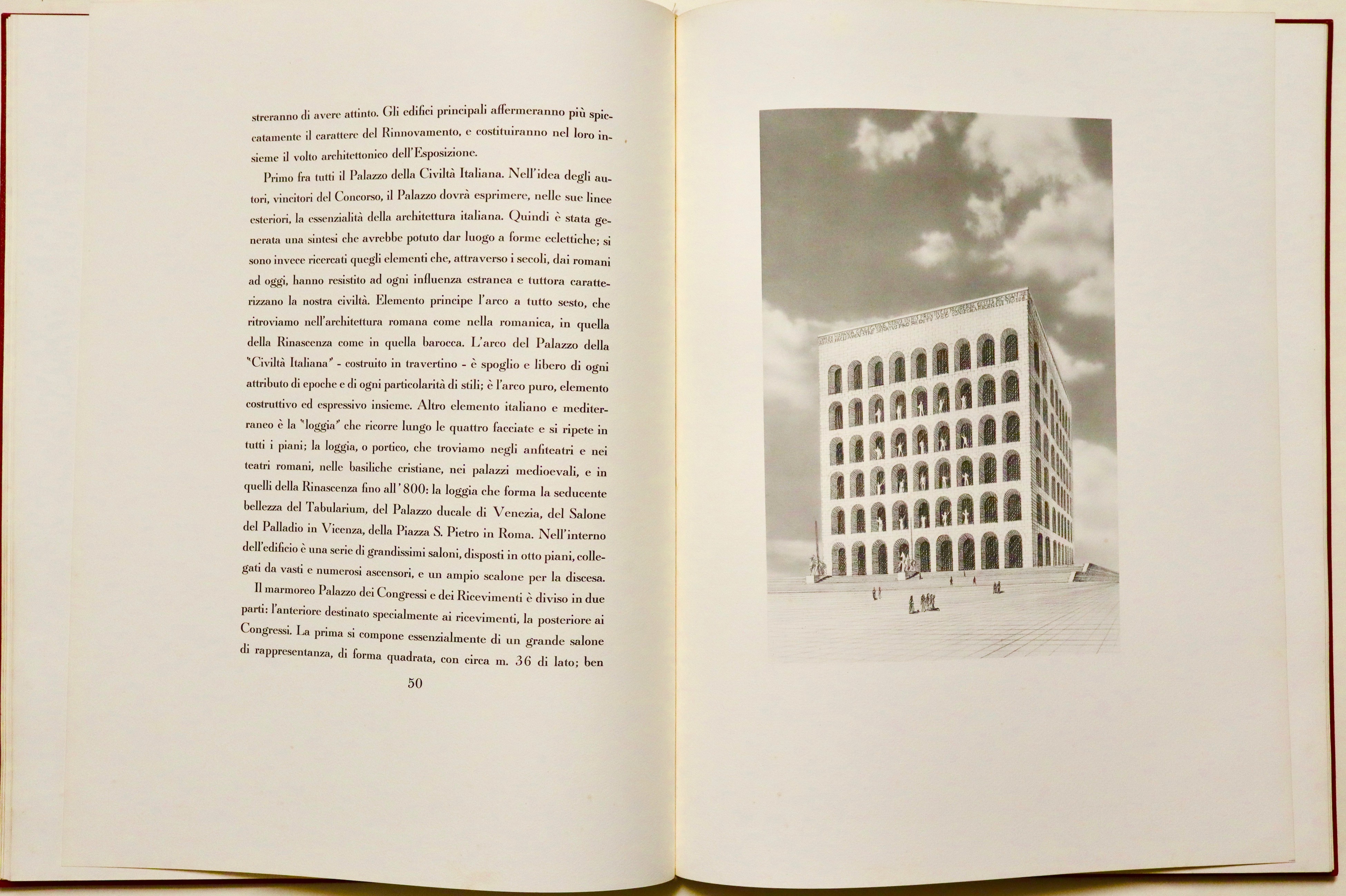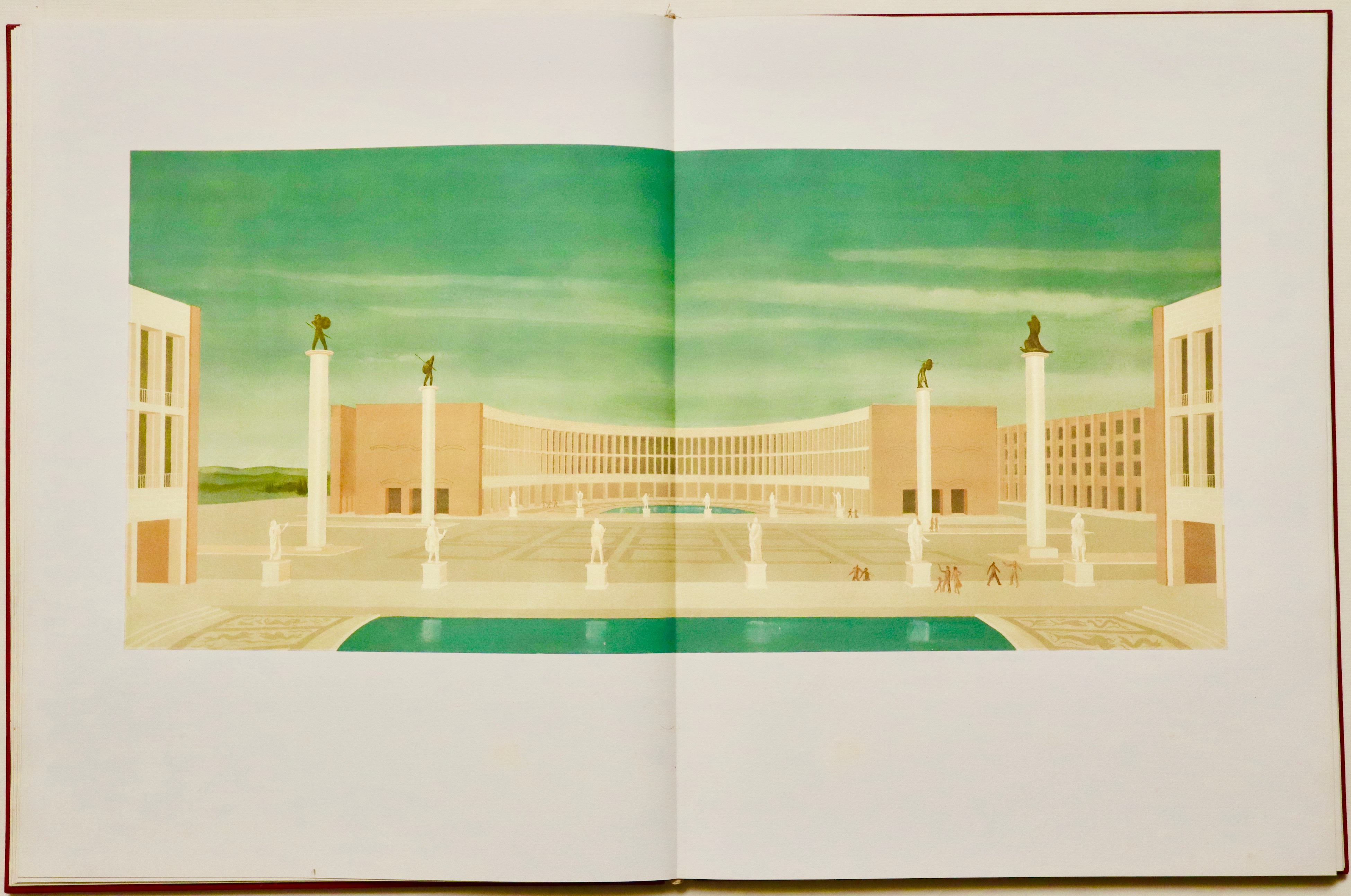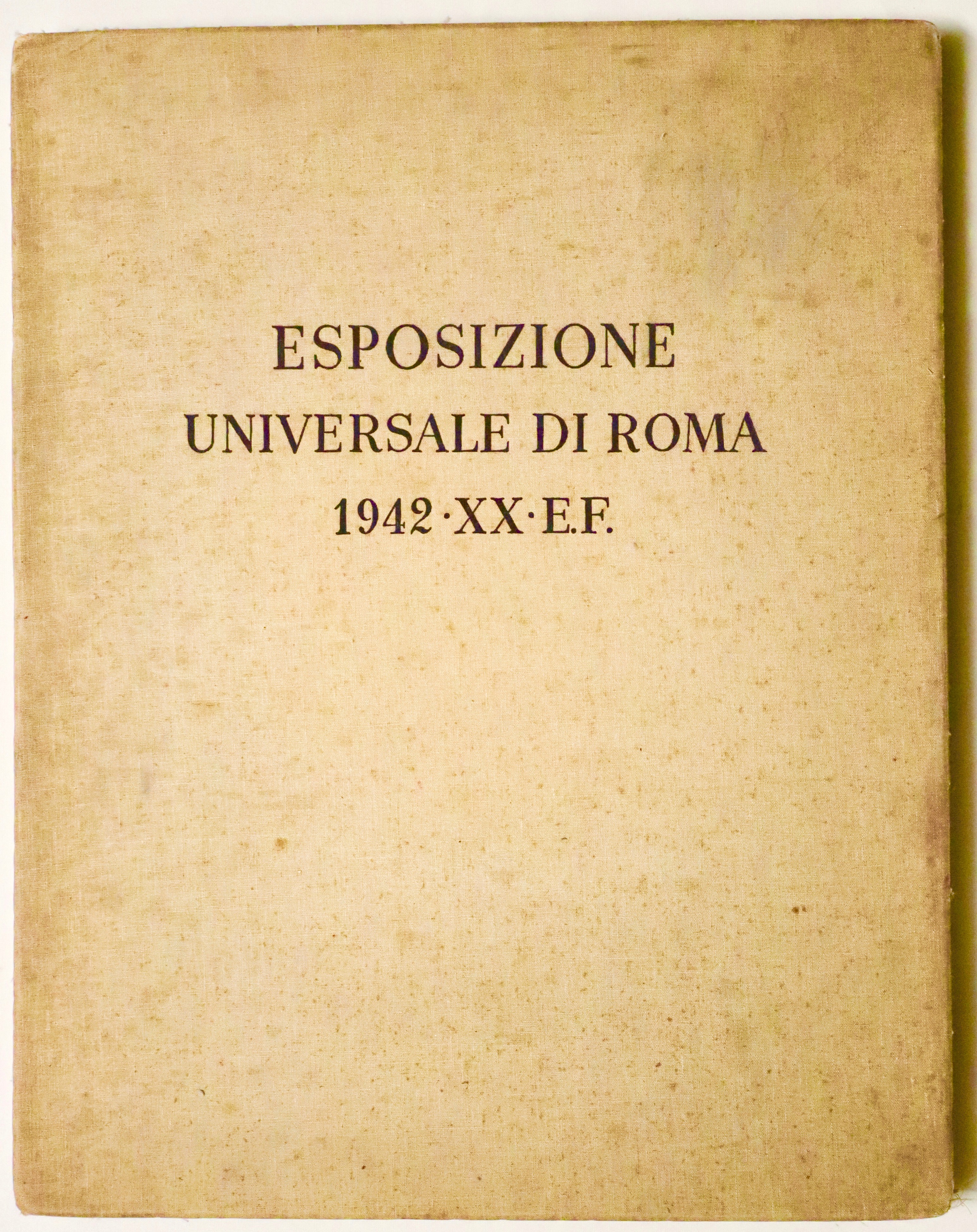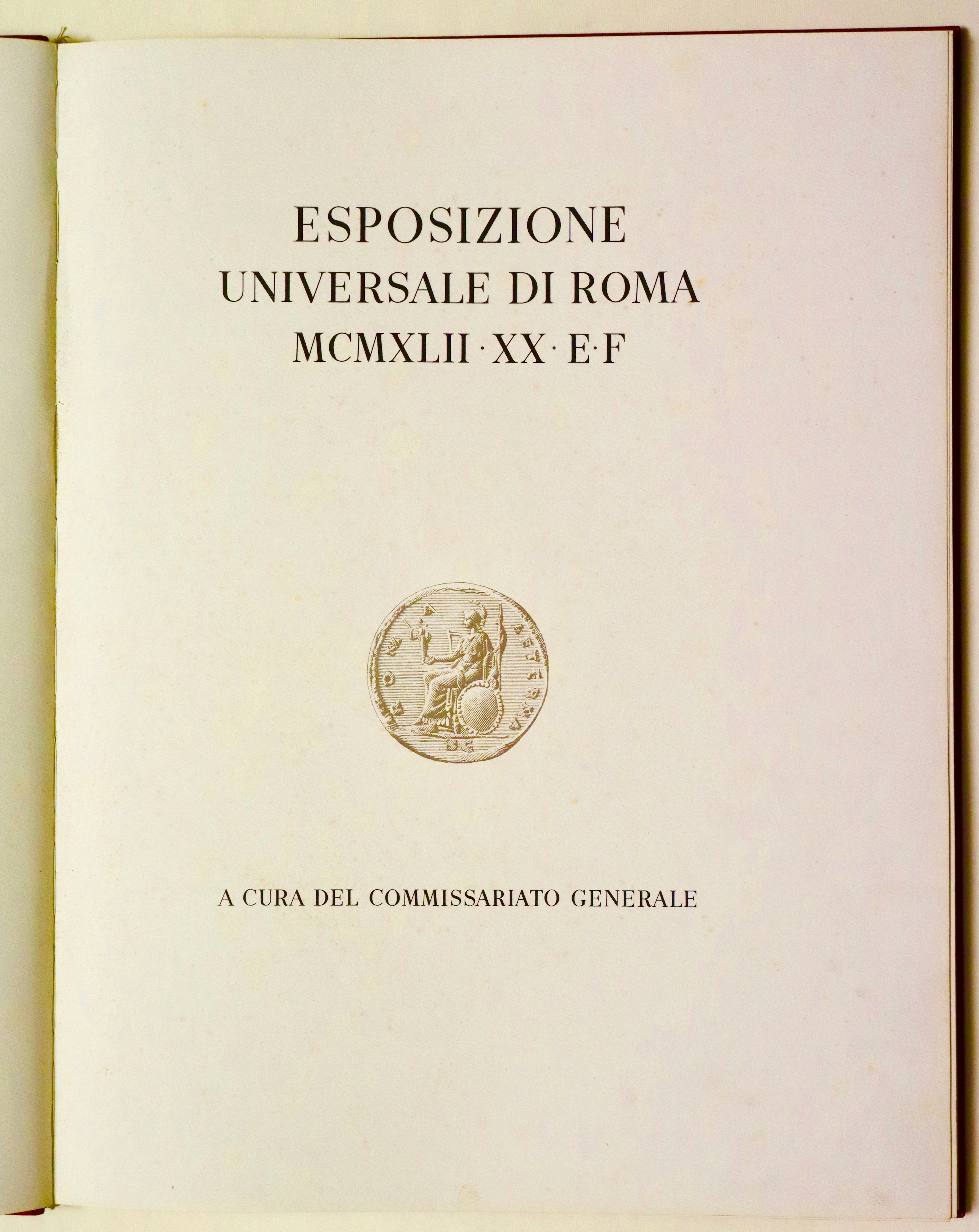 Folio (590x450 mm); 87-(6) pages with a photograph of King Victor Emmanuel III, one with a portrait of Mussolini, two plates with a reproduction of Mussolini's autographed letter of introduction, dated Rome, December 26, 1938, with four large double-page plates depicting the EUR project, a beautiful color plate by Sironi, plans and elevations of future buildings (several of which were later built). This is the deluxe edition of 1,200 copies (but certainly never completed, given the outbreak of World War II, probably just over 200 copies were produced) of the project commissioned by Mussolini for the Universal Exposition that was to be held in 1942. In the colophon: This volume presenting the Universal Exposition in Rome was printed by the General Commissariat in Paganini type on Fabriano handmade paper. Editorial binding in full red leather with a large medal embossed on the front cover and three fasces embossed on the back cover, contained in a special hemp box with black dry titles on the front cover. Good copy internally in excellent condition. Binding with some traces of moisture and stains. Complete with hazelnut-colored canvas case (with some defects) and fabric bag.