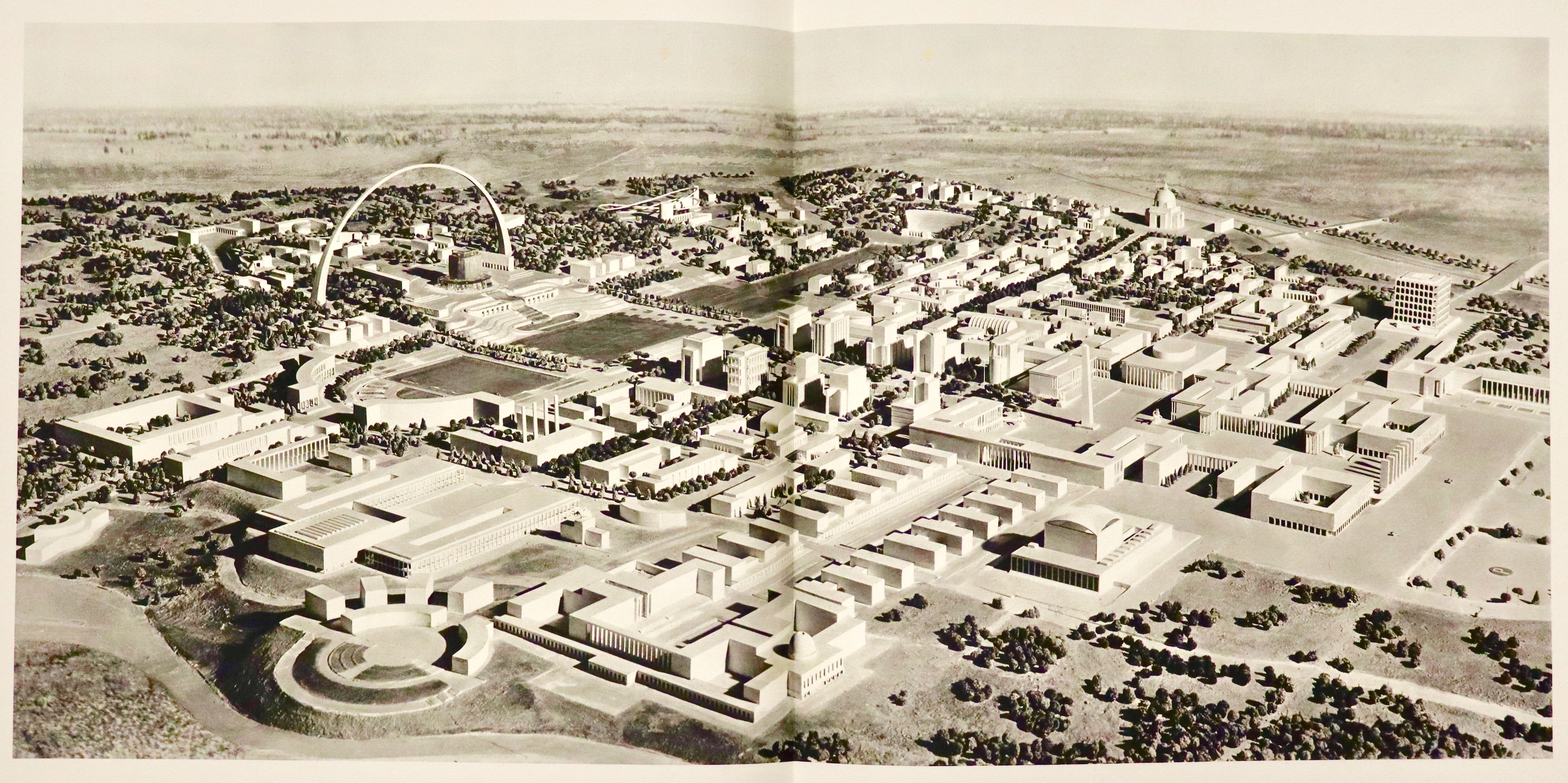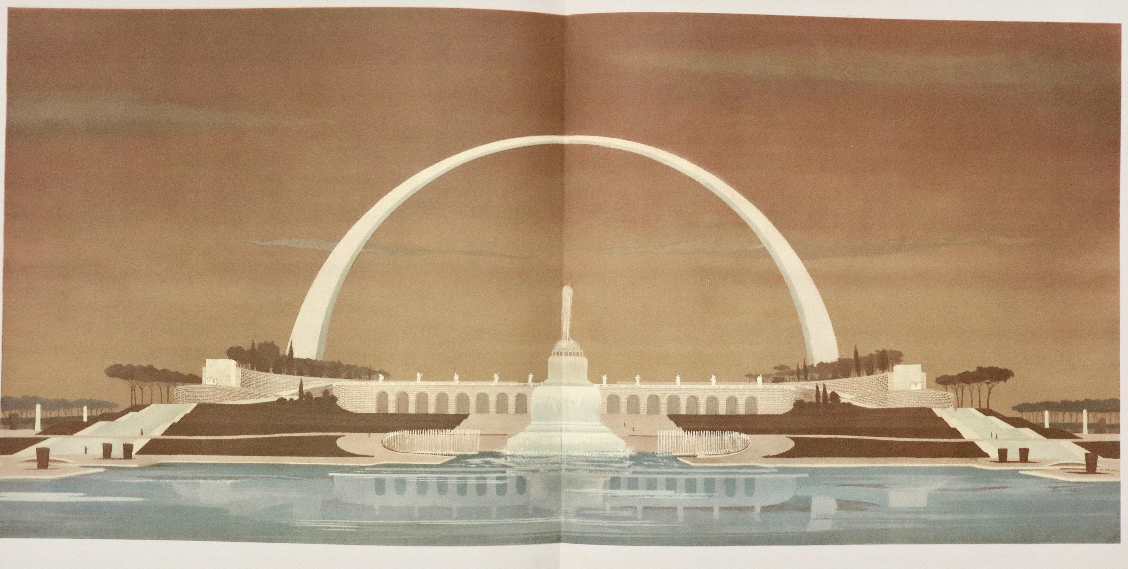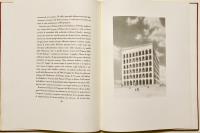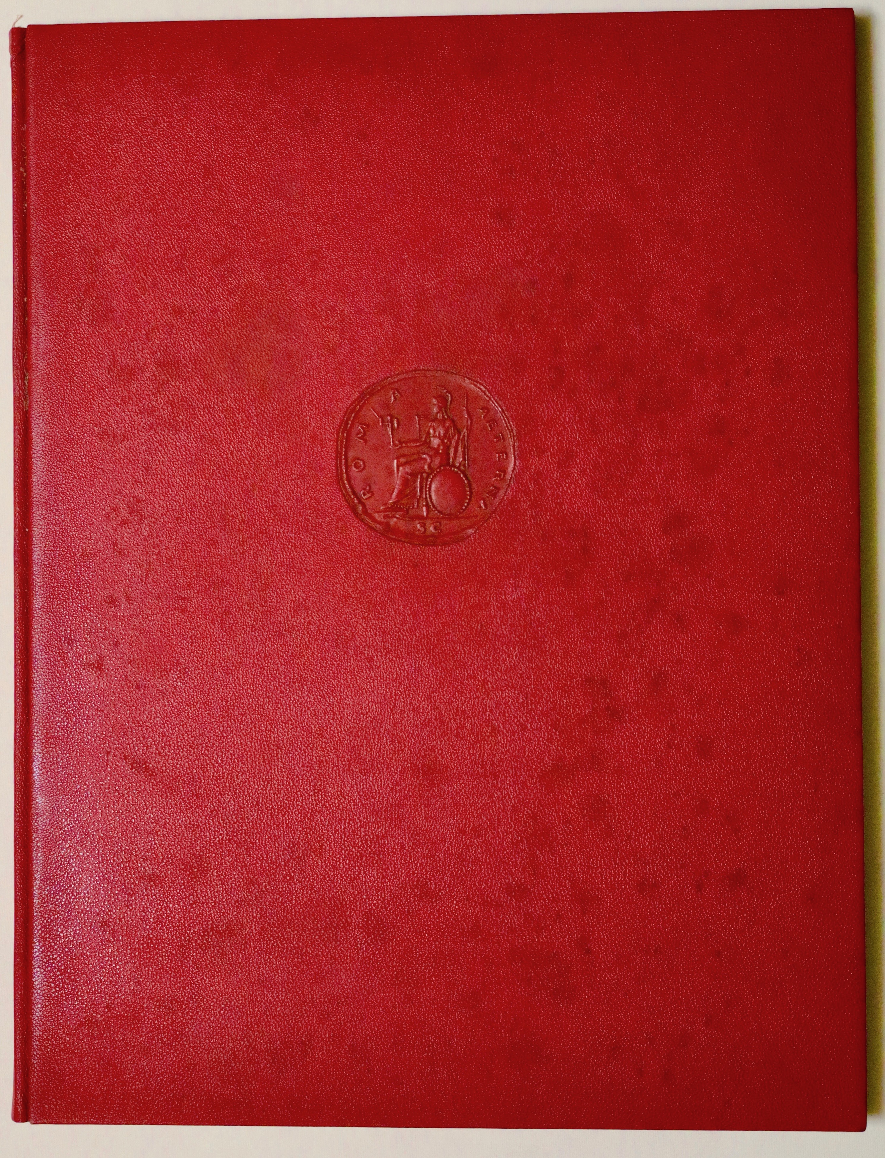 Folio (590x450 mm); 87-(6) pages with a photograph of King Victor Emmanuel III, one with a portrait of Mussolini, two plates with a reproduction of Mussolini's autographed letter of introduction, dated Rome, December 26, 1938, with four large double-page plates depicting the EUR project, a beautiful color plate by Sironi, plans and elevations of future buildings (several of which were later built). This is the deluxe edition of 1,200 copies (but certainly never completed, given the outbreak of World War II, probably just over 200 copies were produced) of the project commissioned by Mussolini for the Universal Exposition that was to be held in 1942. In the colophon: This volume presenting the Universal Exposition in Rome was printed by the General Commissariat in Paganini type on Fabriano handmade paper. Editorial binding in full red leather with a large medal embossed on the front cover and three fasces embossed on the back cover, contained in a special hemp box with black dry titles on the front cover. Good copy internally in excellent condition. Binding with some traces of moisture and stains. Complete with hazelnut-colored canvas case (with some defects) and fabric bag.