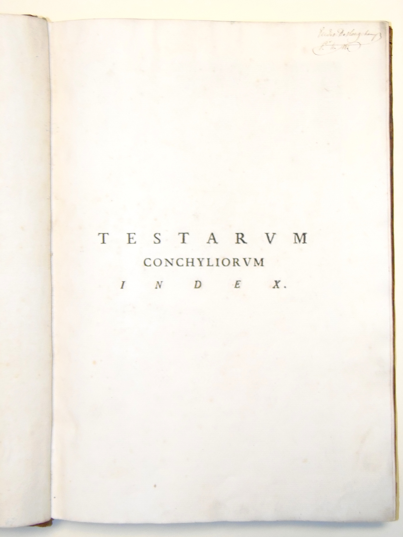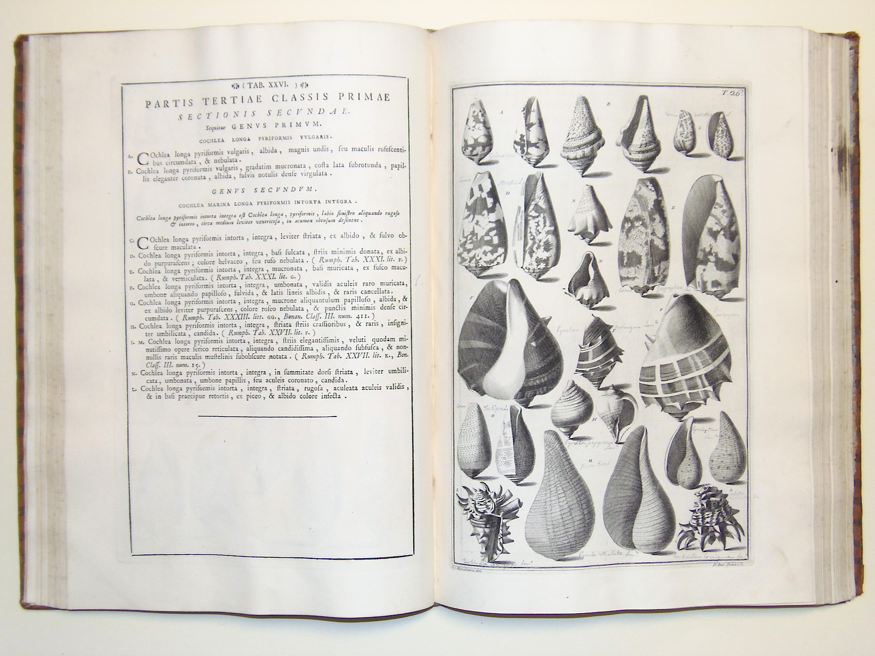 In folio (435x300). Occhietto, antiporta allegorico in acquaforte disegnato da Campiglia, ritratto dell’autore entro ovale disegnato da Maria Maddalena Gozzi, il tutto inciso da Pazzi; frontespizio in rosso e nero con grande vignetta paesaggistica di soggetto marino. Dedica a Francesco III Medici. 5 parti in un volume ognuna con proprio frontespizio, ciascuno con vignetta ovale, 8 tavole in rosso e nero raffiguranti coralli, madrepore e 110 raffinate tavole a piena pagg. numerate incise in rame raffiguranti conchiglie, tutte entro una bordura con doppio filetto, disegnate da Menabuoni e incise da Pazzi con a fronte il testo; 16 belle tavv. nel testo sempre in acquaforte, su disegno di Menabuoni ed incise da Bernardo Sgrilli. Legatura in piena pelle coeva con dorso a sei nervi, titolo su tassello in oro, dorso a 7 scomparti con ricchi fregi di carattere floreale, dentelle dorate, alla cuffia inf. e impresso uno stemma gentilizio raffigurante una torre inscritta in un ovale sormontata da corona. Prima edizione di questa magnifica opera del Gualtieri (1688-1744) che fu medico personale di Cosimo III de’ Medici, il quale, grande collezionista ed estimatore di rarità, possedeva un magnifico gabinetto di conchiglie includendo circa 360 specie, che gli furono mandate da Rumphyus; il Duca diede al Gualtieri molti dei suoi duplicati. Gualtieri fu inoltre professore all’università di Pisa, dedicando i suoi studi alla botanica, geologia ed alla zoologia. Assai raffinato l’apparato iconografico, che illustra dettagliatamente centinaia di molluschi e fossili che appartenevano alla collezione privata dell’autore. Splendido esemplare stampato su carta forte. Lievi tracce d’uso alla legatura (allo spigolo inf. del piatto posteriore).