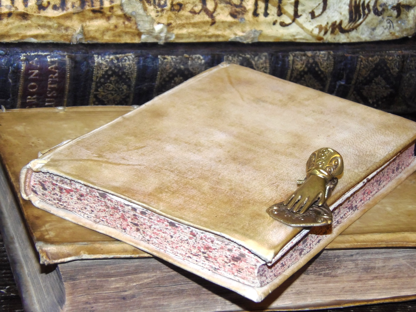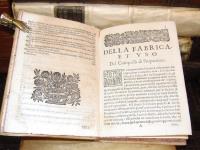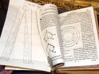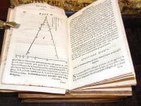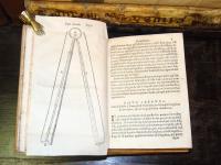 In 4° (215x150), carte n.n.4, pagg. 250. Frontespizio con scena allegorica incisa in legno, iniziali ornate e fregi silografici; 4 tavv. f.t. in silografia, ripiegate, numerose incisioni nel testo di figure geometriche e schemi. Piena pergamena rigida coeva, dorso a cinque nervi e titolo manoscritto, tagli a spruzzo, antica etichetta di scaffale alla cuffia inf.