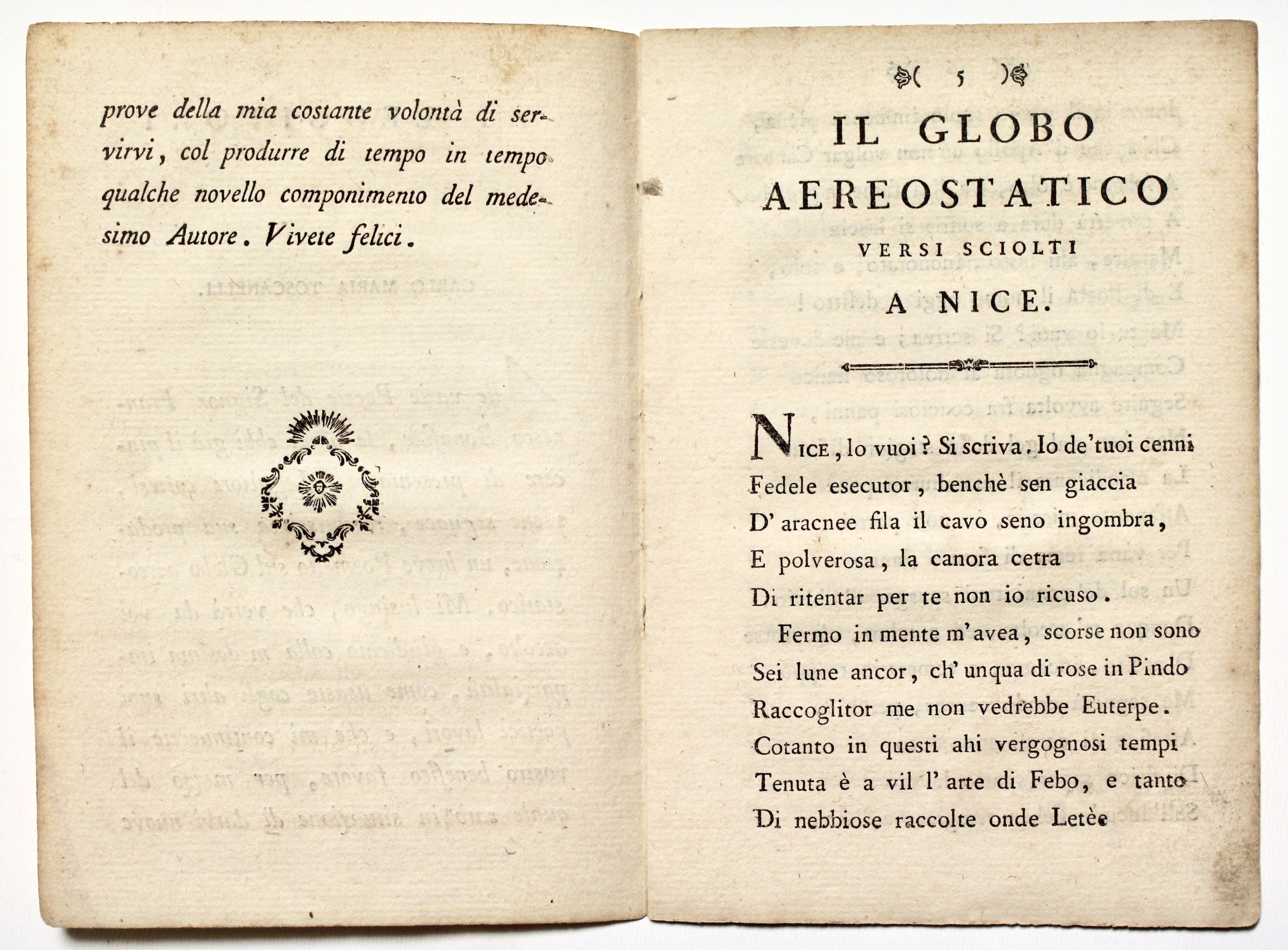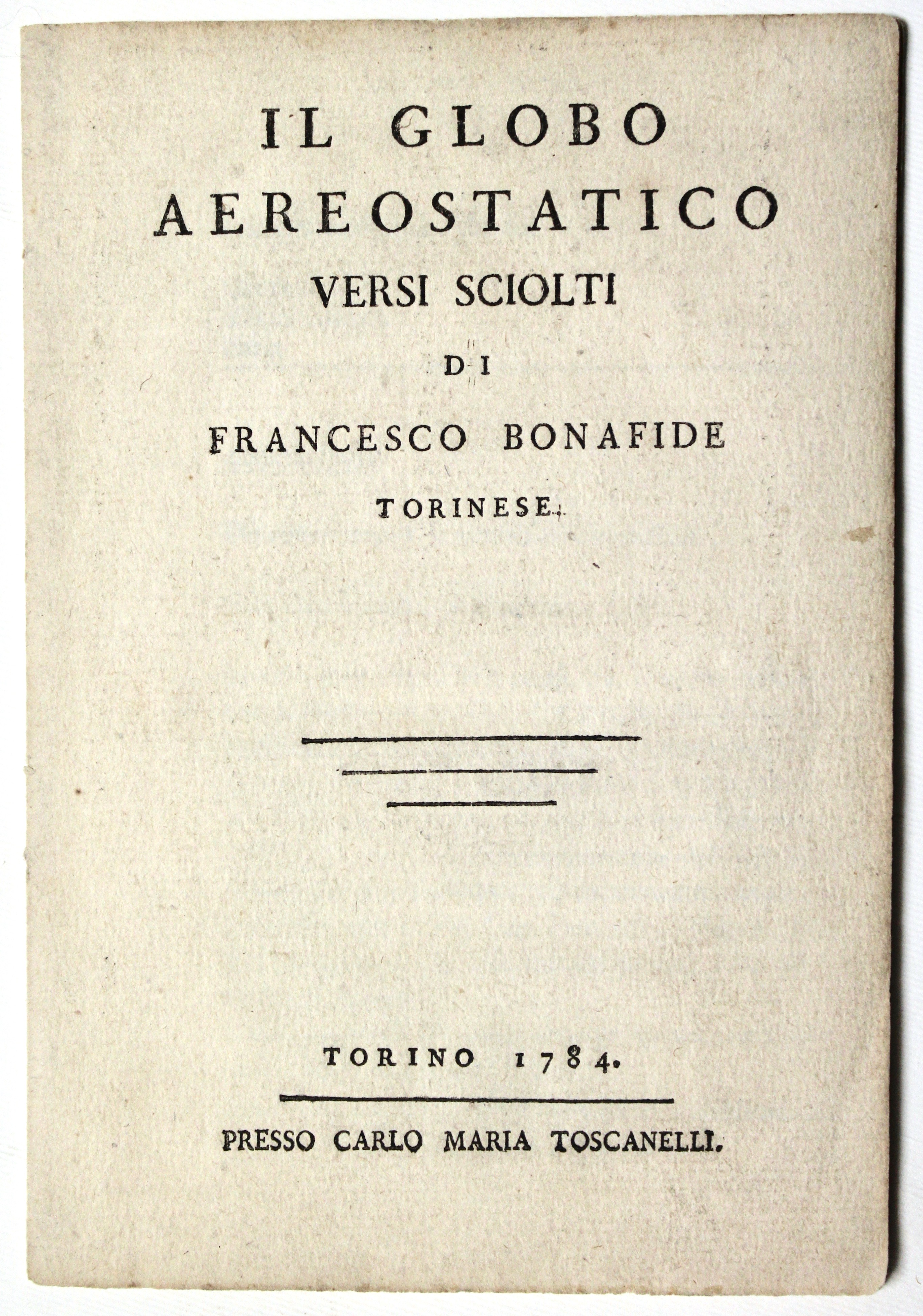 In 8°(mm175x120); pagg. 16, senza legatura. Rara e curiosa placchetta, un poemetto in versi sul globo aerostatico. Una copia alla Civica Centrale di Torino. Ottimo esemplare stampato su carta vergellata.