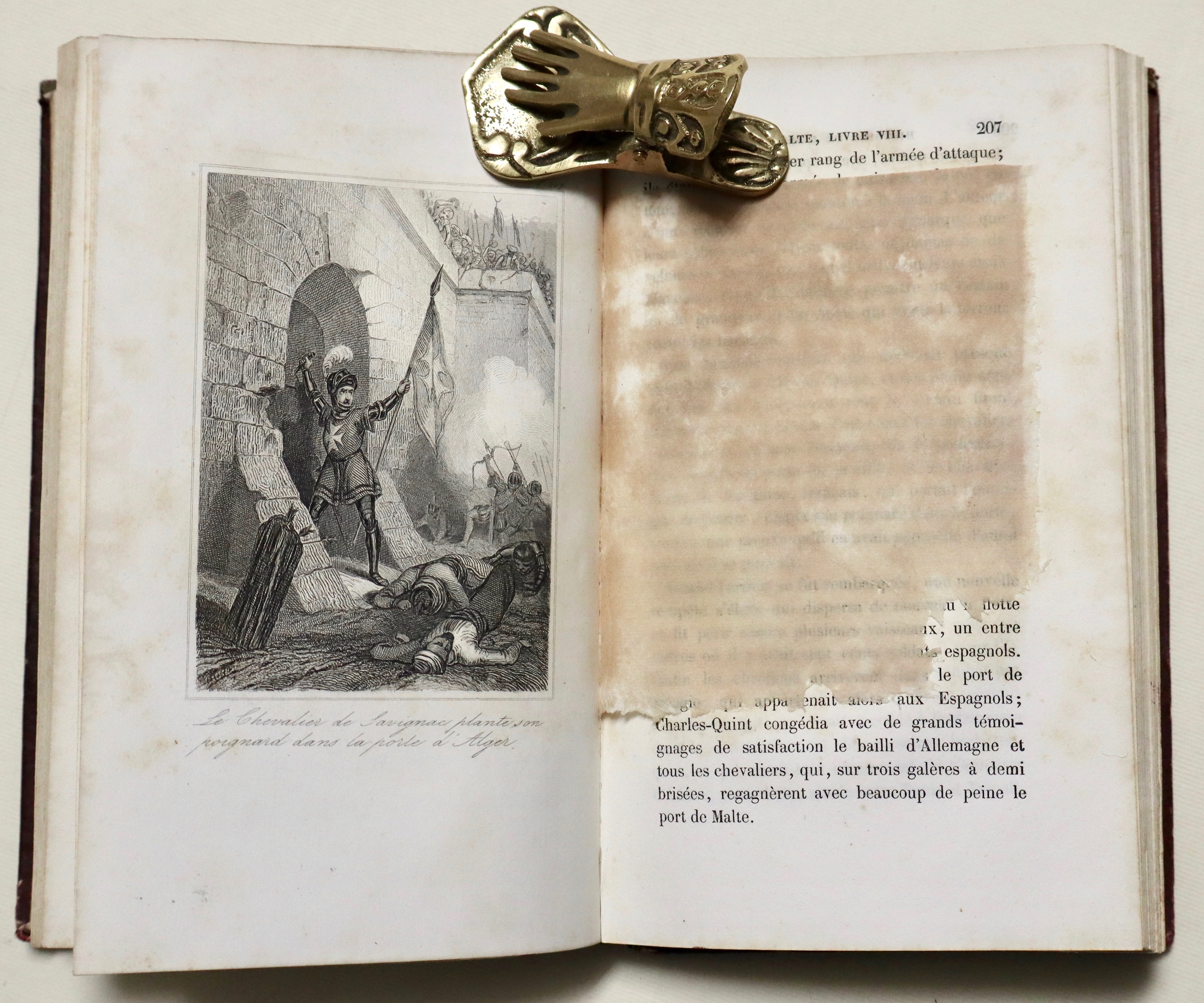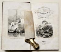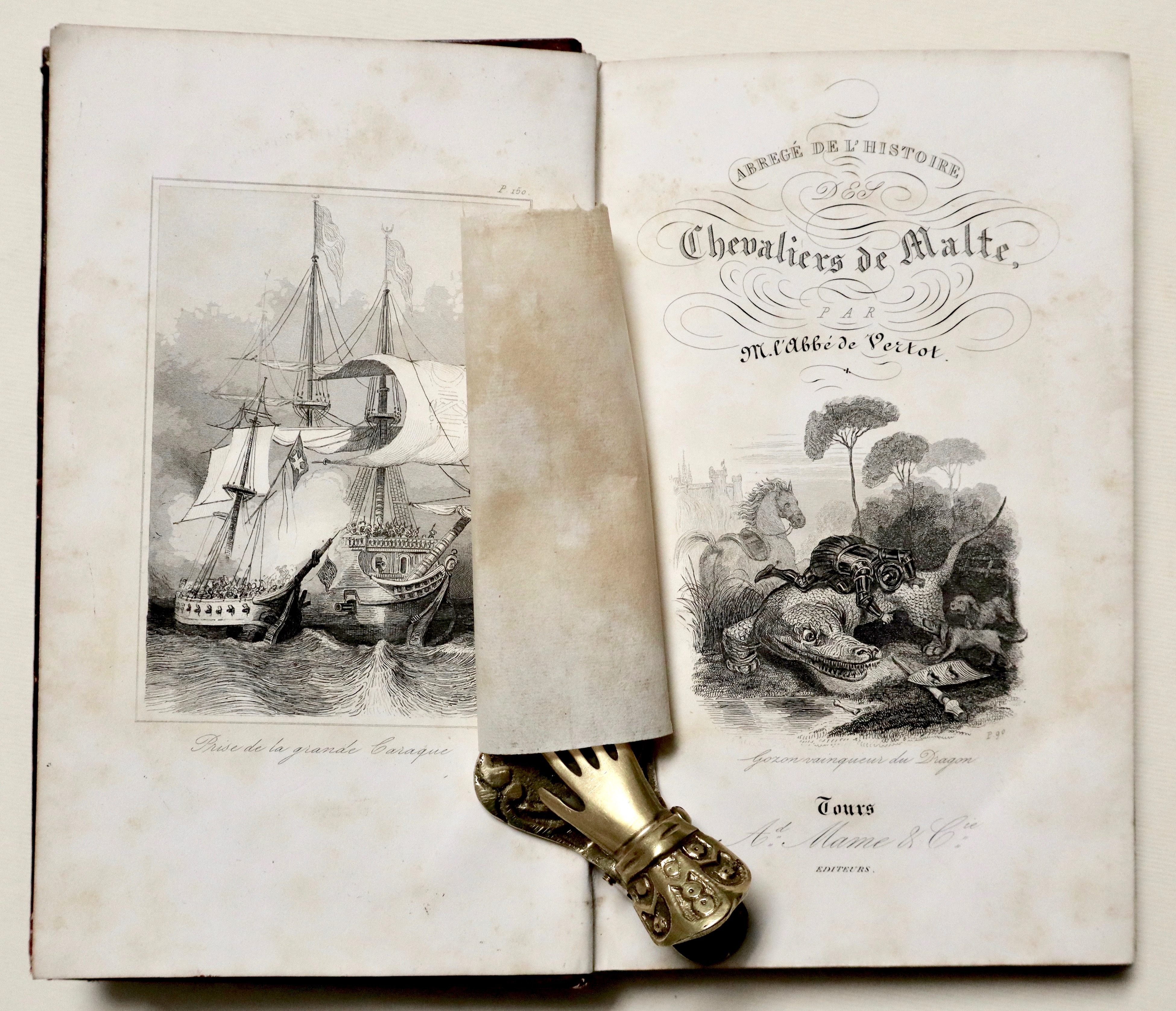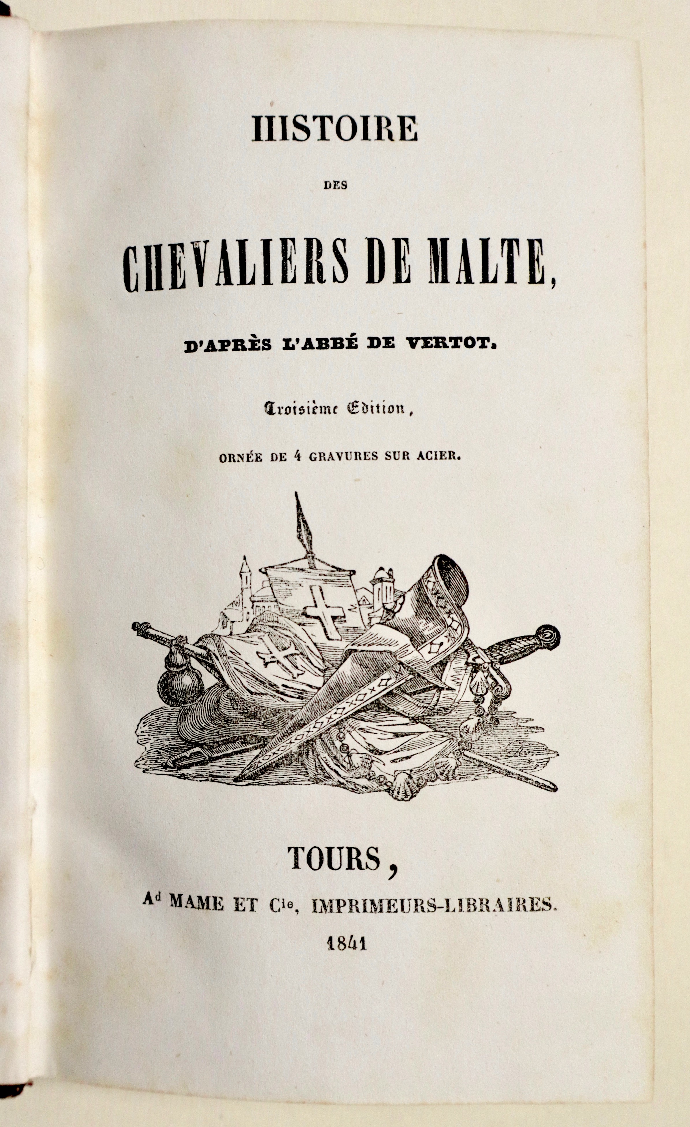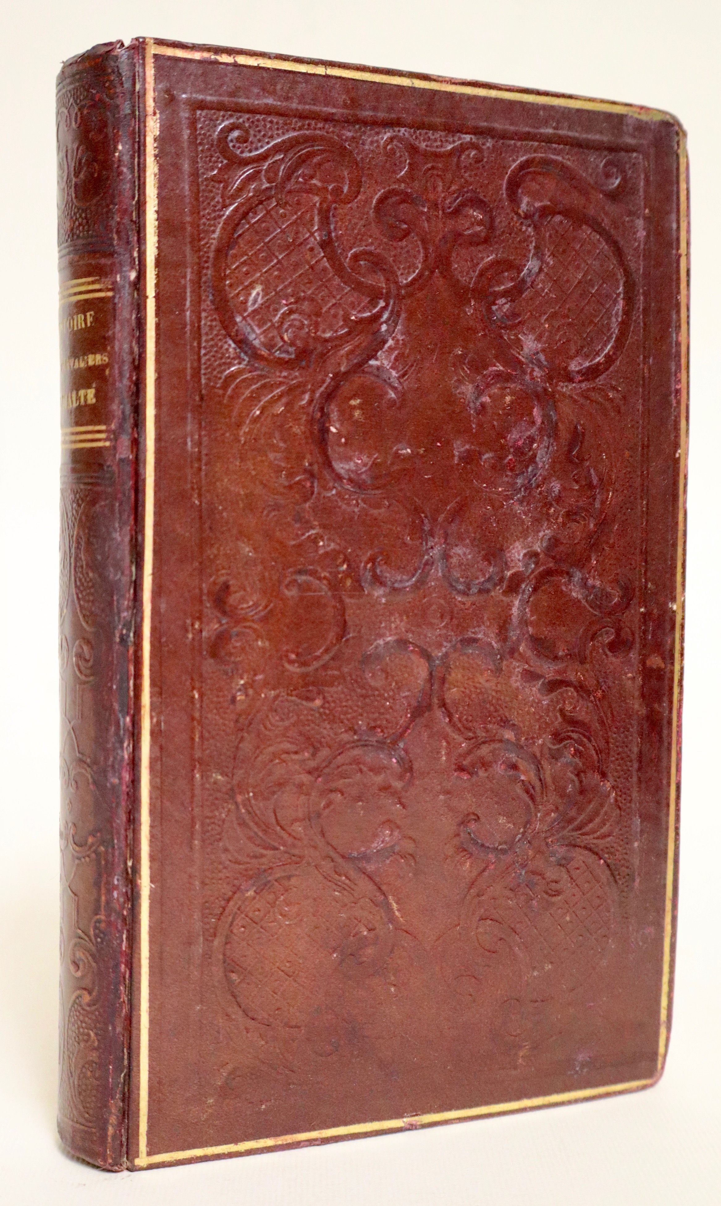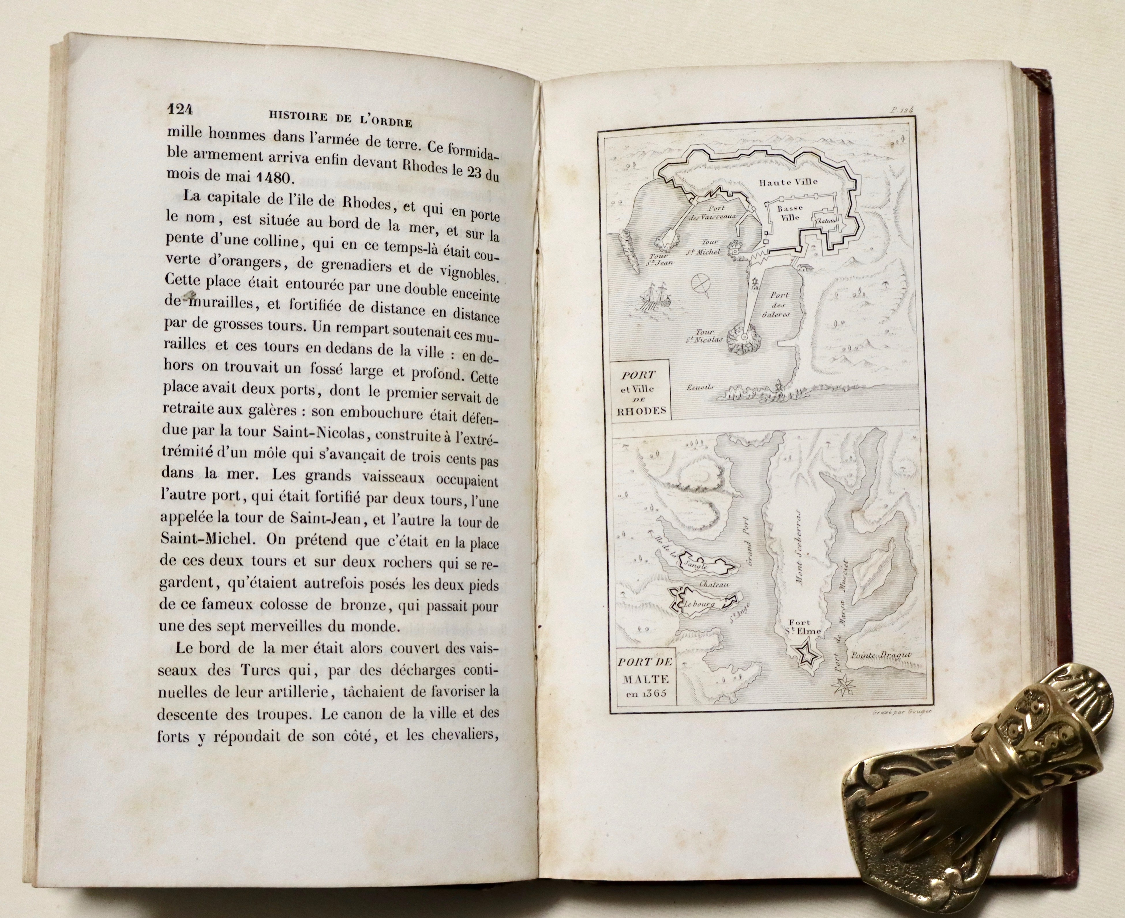 In 8° (mm 175x100); occhietto, doppio frontespizio, il primo figurato con vignetta in acciaio, il secondo illustrato da silografia, pagg. 312 con 3 incisione in acciaio a piena pagina (per complessive quattro incisioni); una delle illustrazioni riporta le piante di Malta e Rodi, antica sede dei Cavalieri. Ottimo esemplare con raffinata legatura di premio in pelle bordeaux ornata da impressioni floreali a secco ai piatti ed al dorso, piatti inquadrati da filetti dorati. Titolo in oro su tassello al dorso. Interessante storia dei Cavalieri dell' Ordine dell'ospedale di San Giovanni di Gerusalemme, ovvero dei Cavalieri di Rodi in seguito detti Cavalieri di Malta, in XII libri; narra dalla fondazione dell’ordine al tempo della prima crociata (1097) e prosegue fino ad arrivare alla resa di Malta ai francesi con Napoleone Bonaparte. Lievi e saltuarie fioriture internamente. Minime tracce d’uso alla legatura.