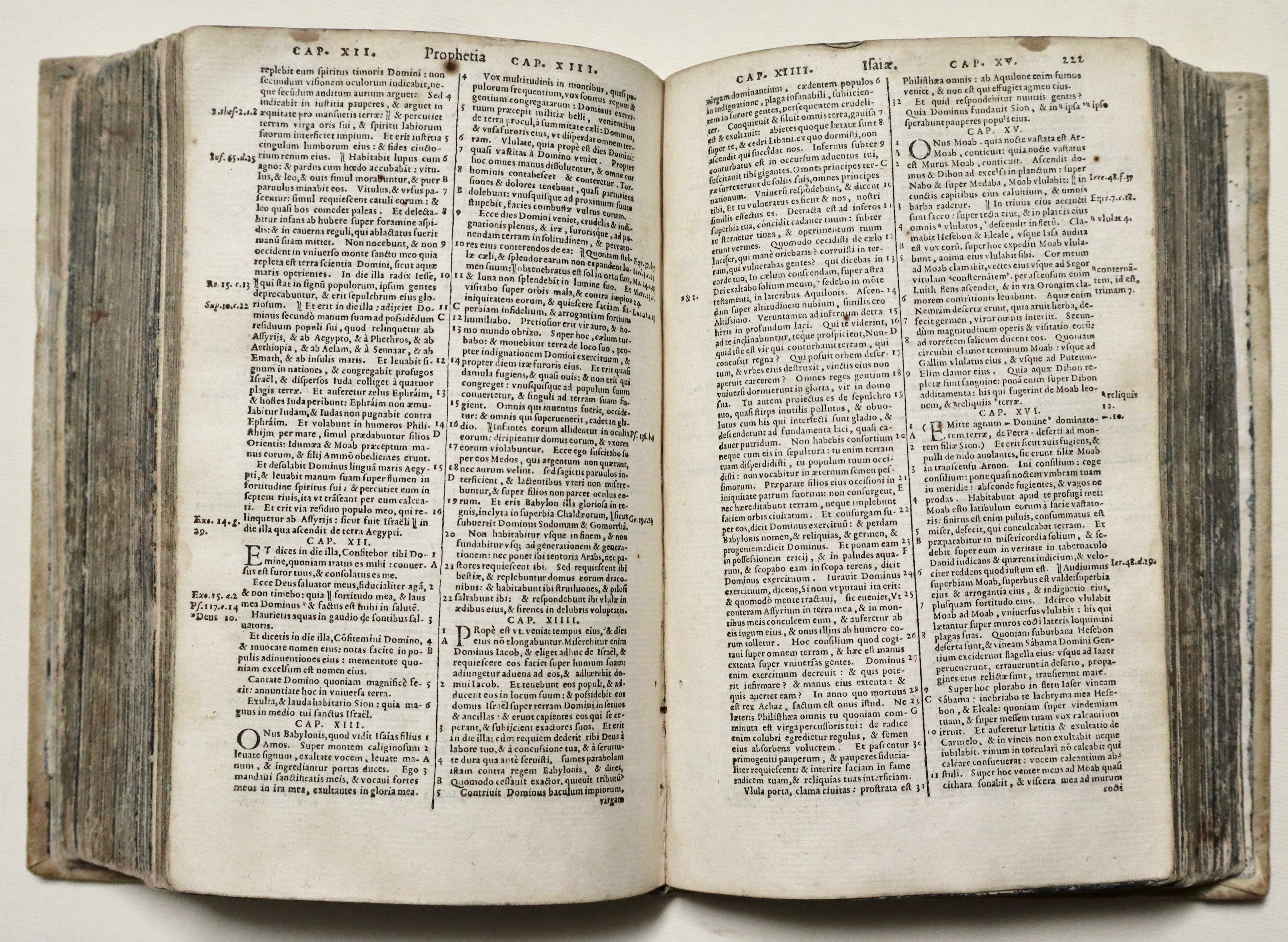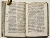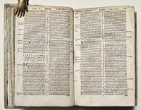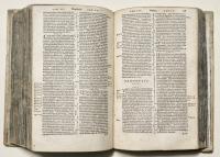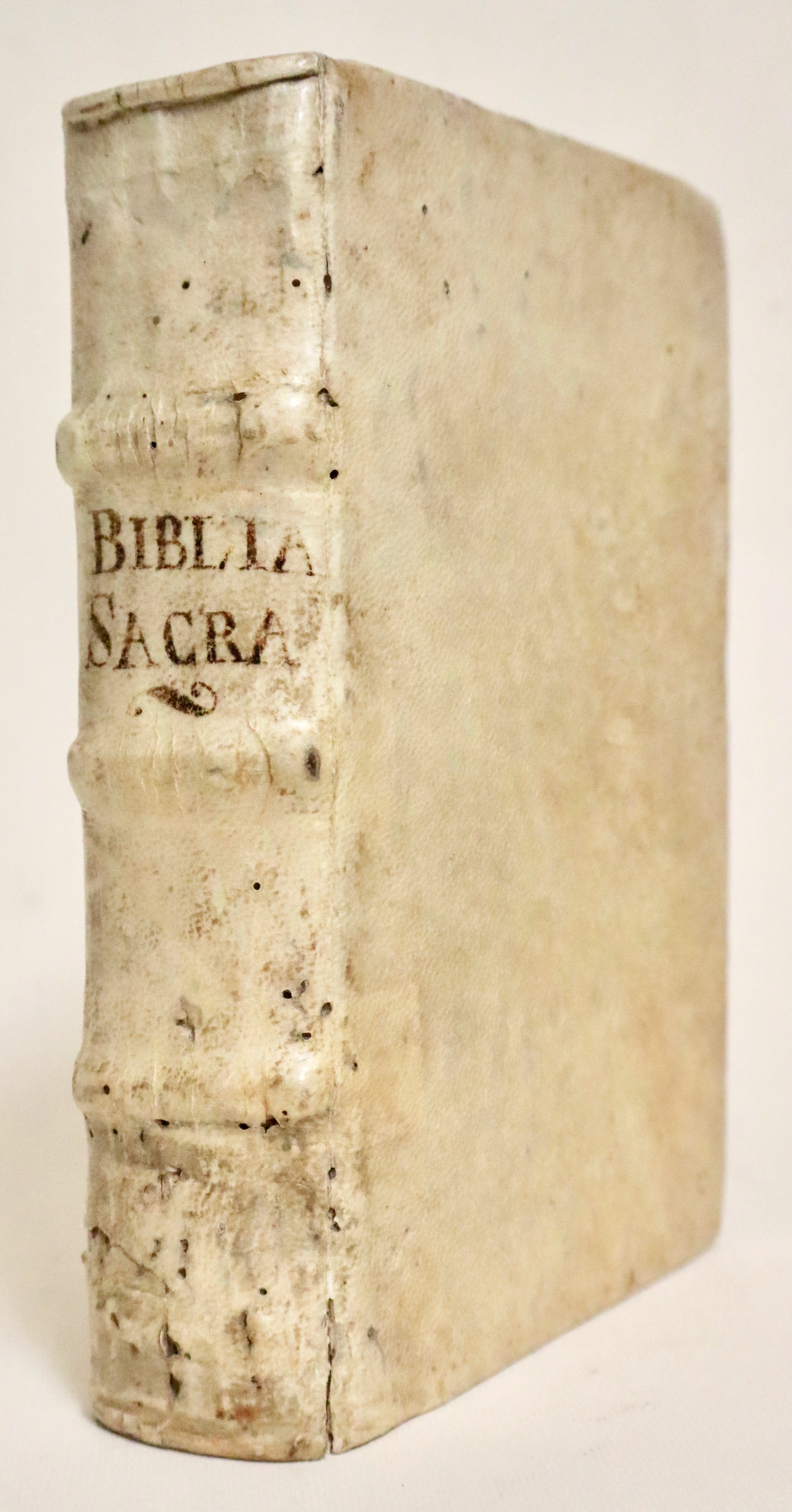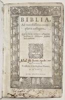 Pergamena settecentesca con dorso a tre nervi e titolo scritto al dorso.Importante edizione molto diffusa nella seconda metà del Cinquecento. Si tratta di una ristampa tascabile della celebre Bibbia di Lovanio, pubblicata nel 1547, che fu la prima autorizzata dal privilegio papale dopo la Riforma luterana fino alla pubblicazione della Bibbia Sistina del 1590. La seconda parte contiene il Nuovo Testamento.