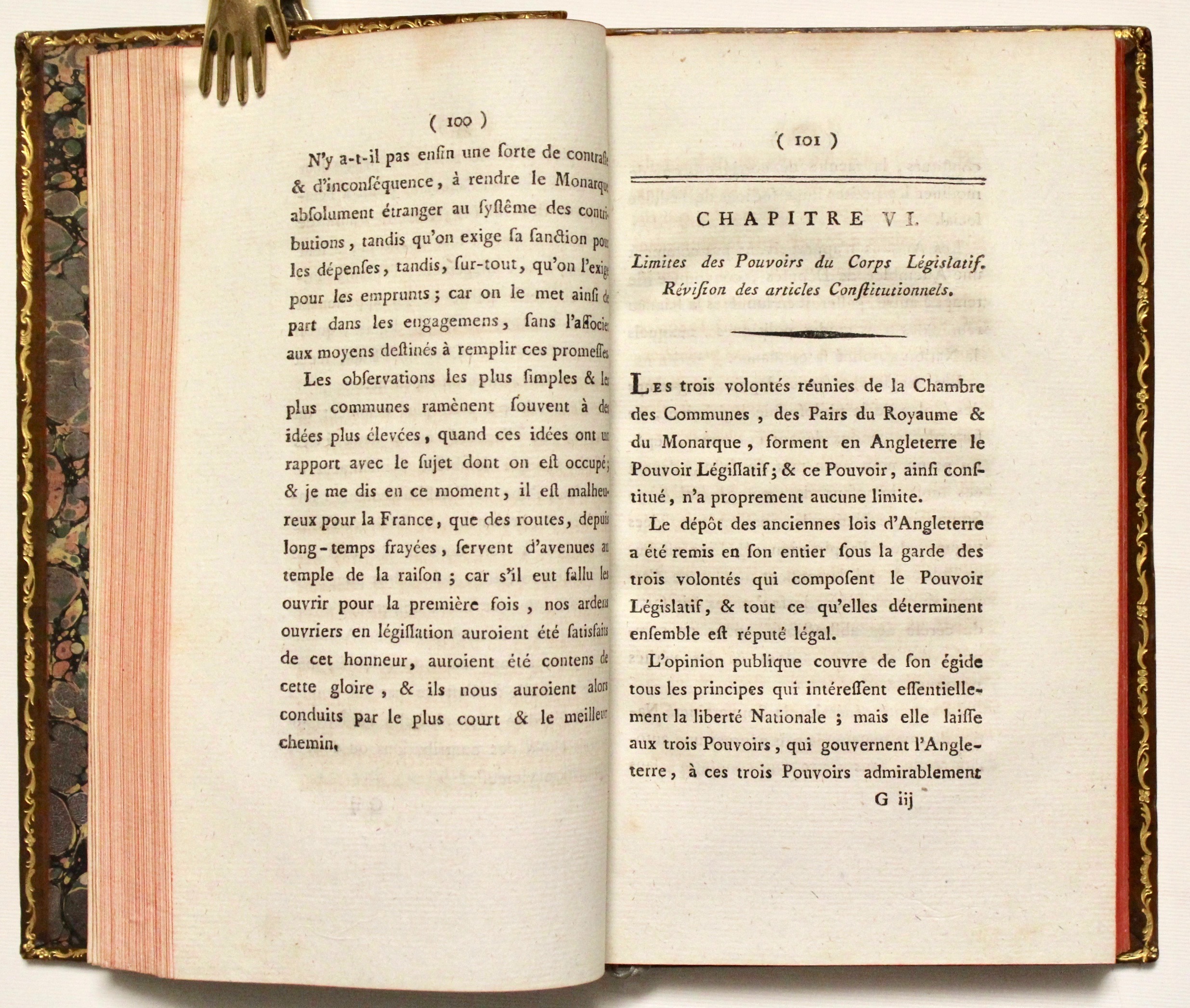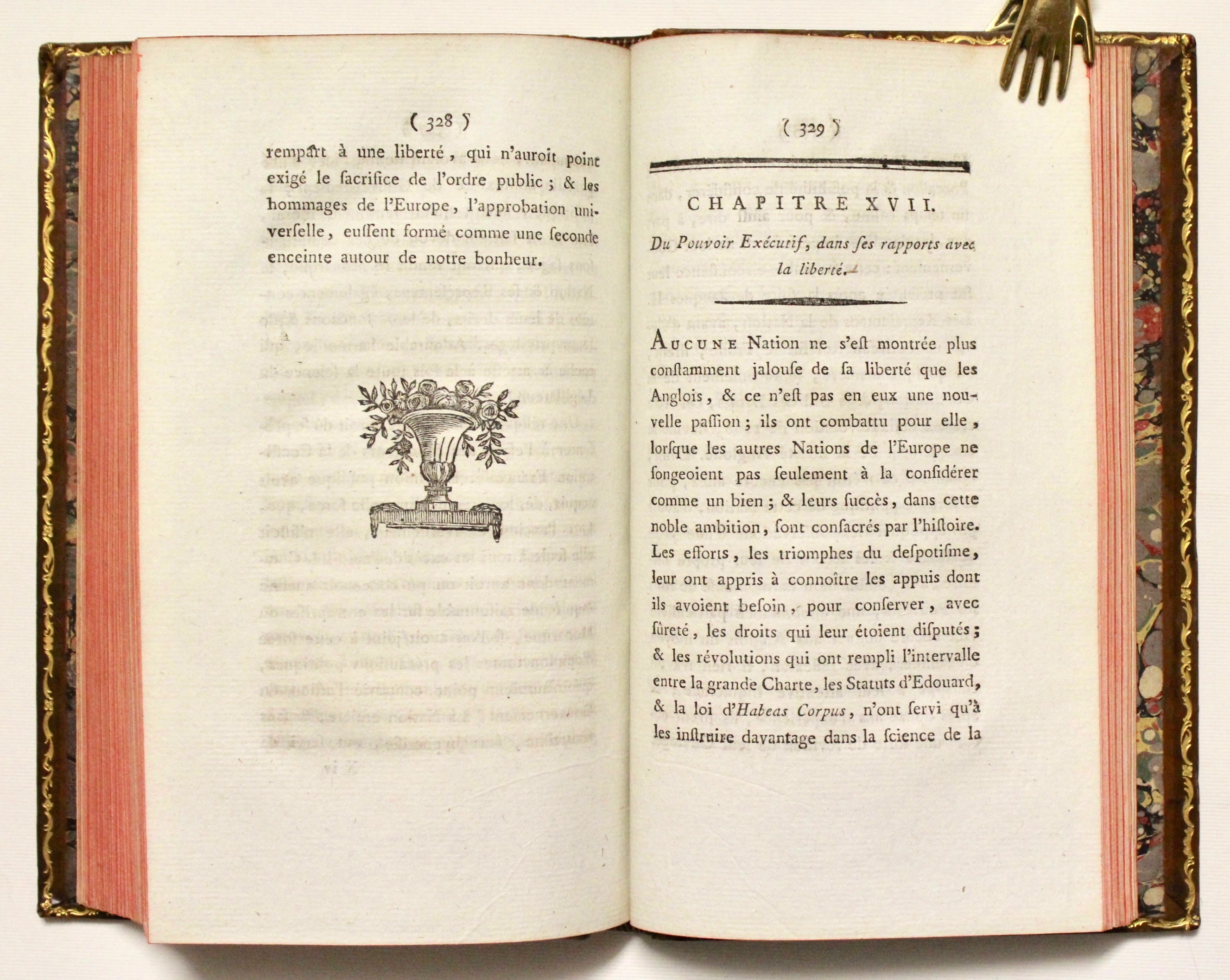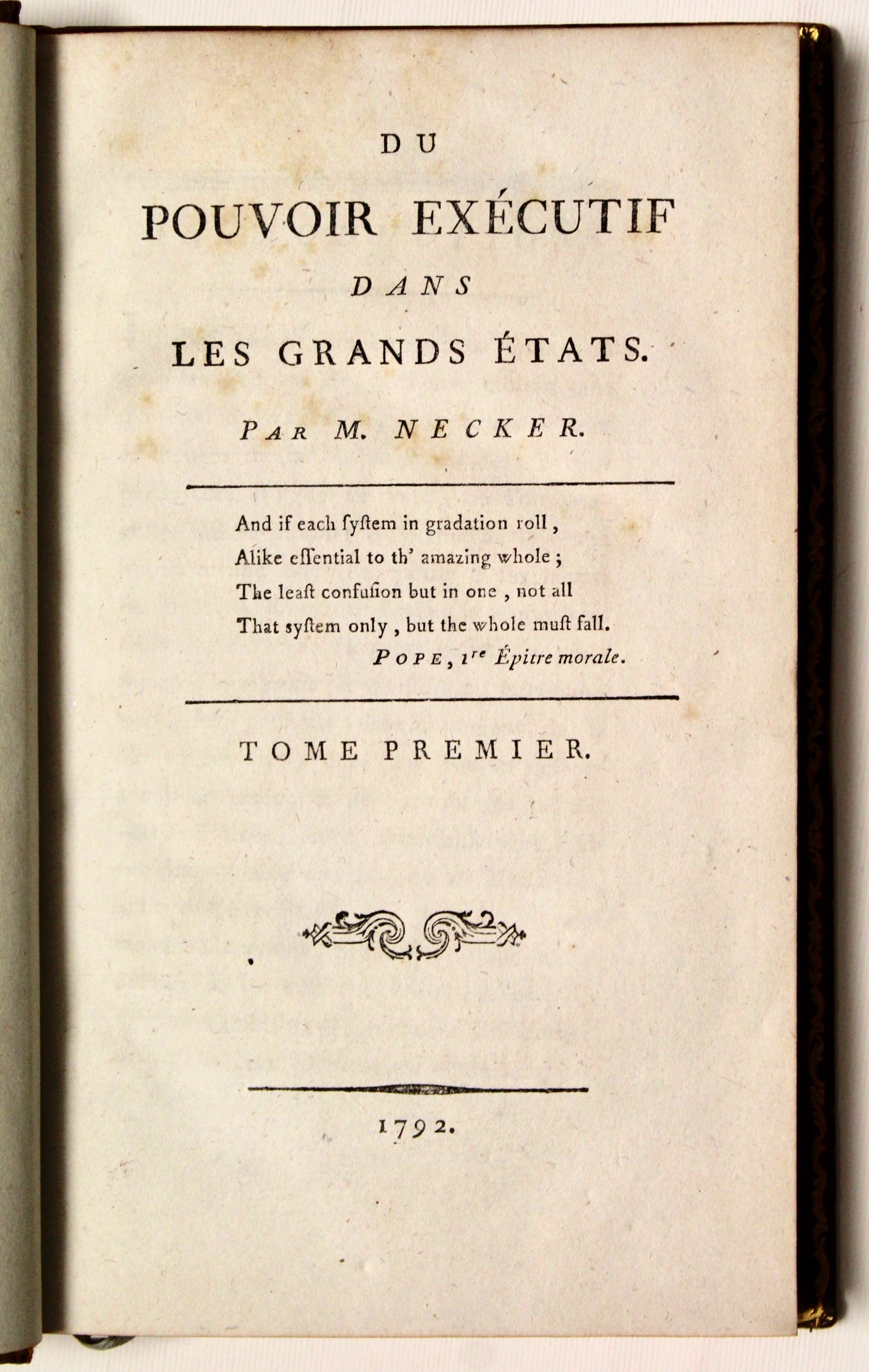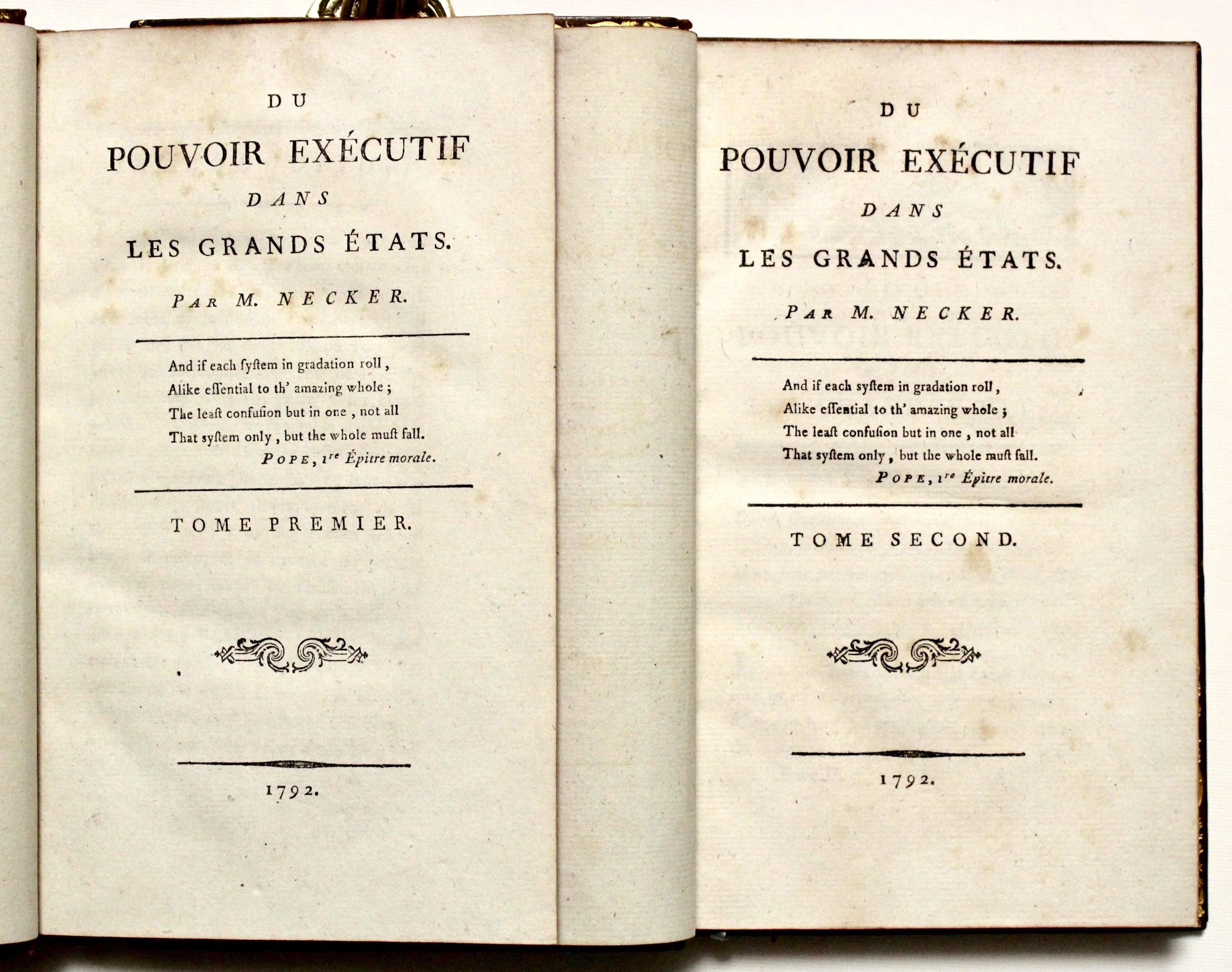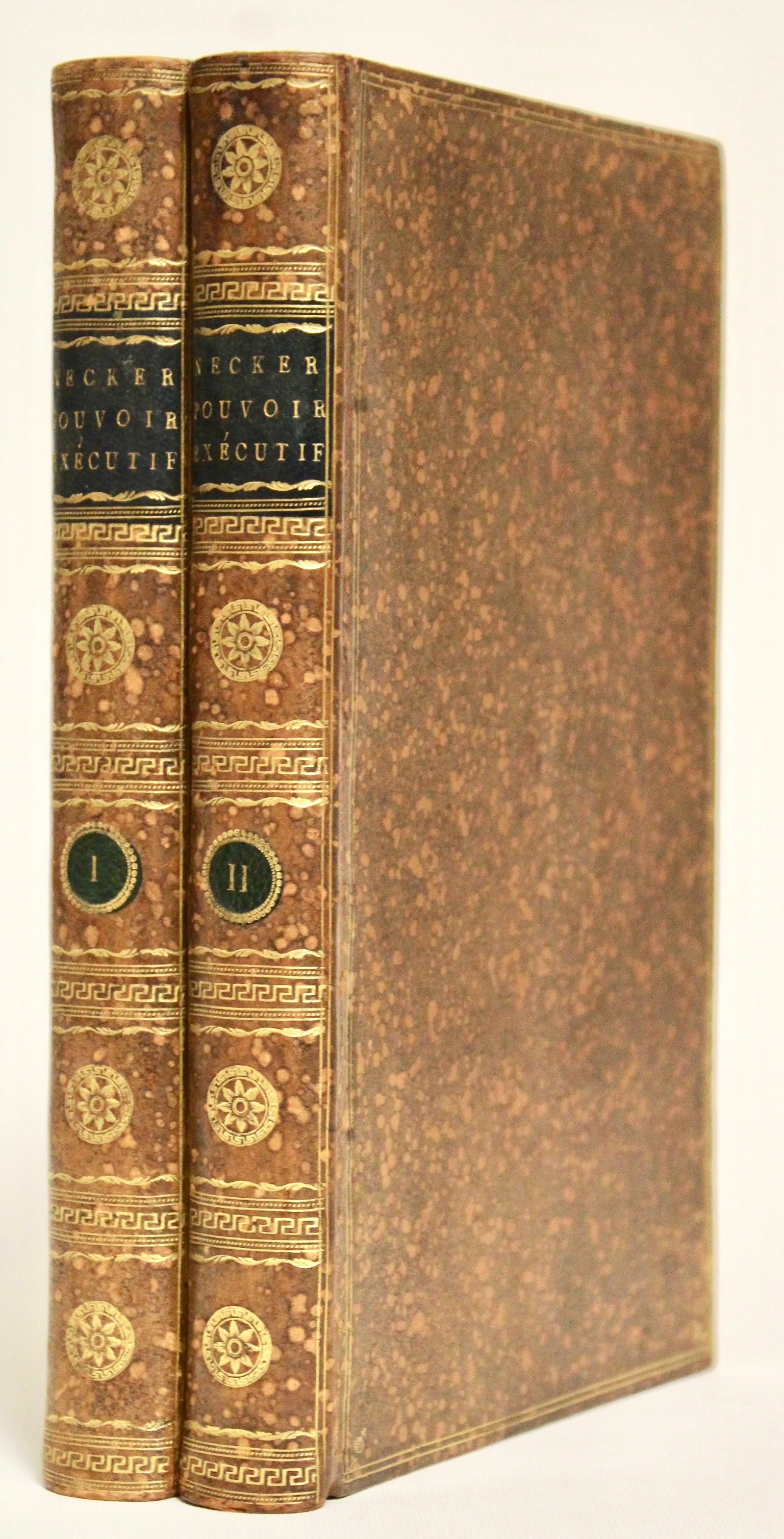 Rare original edition of this important political work by Necker, in which he celebrates executive power 'Le pouvoir exécutif est la force motrice d'un gouvernement; il représente, dans un système politique, cette puissance mystérieuse qui, dans l'homme moral, réunit l'action à la volonté' (p.15 ) and compares it to the various modern nation states, criticising the new French constitution 'Que la liberté françoise a introduit les plus grandes inégalités'; the first four chapters of the second volume are devoted to the American constitution. (Henri Grange, Les Idées de Necker, p. 63): 'Cette œuvre mériterait une place dans l'histoire des doctrines politiques, en tant que théorie du pouvoir dans les sociétés bourgeoises'