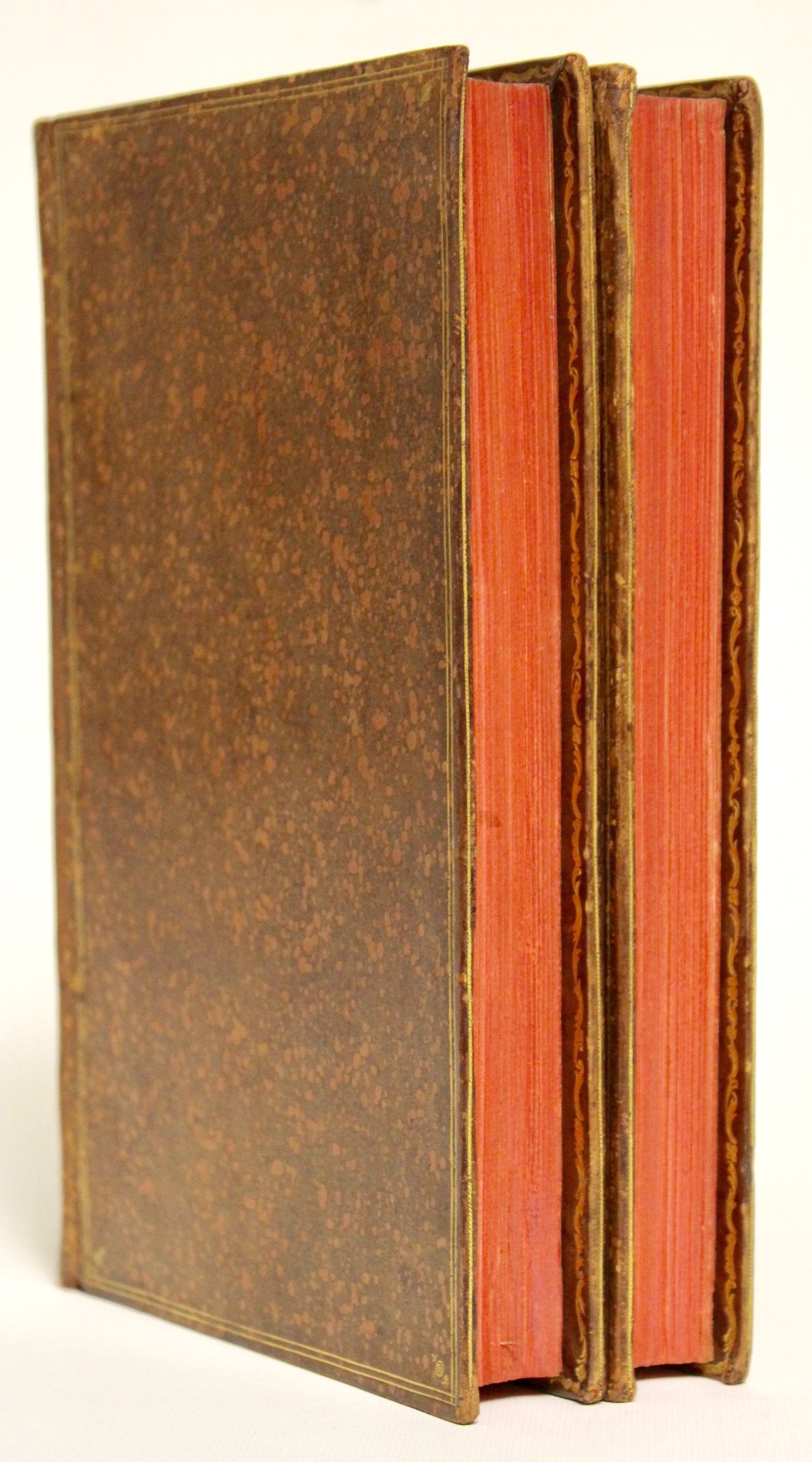 Elegant contemporary marbled full leather, spine in neoclassical style with compartments and rich gilt friezes, executed with rollers and small irons, internal dentelles with gilt frieze, titles and volume number on green morocco tassel. Red cuts and marbled decorated title pages. Beautiful, virtually perfect copy.