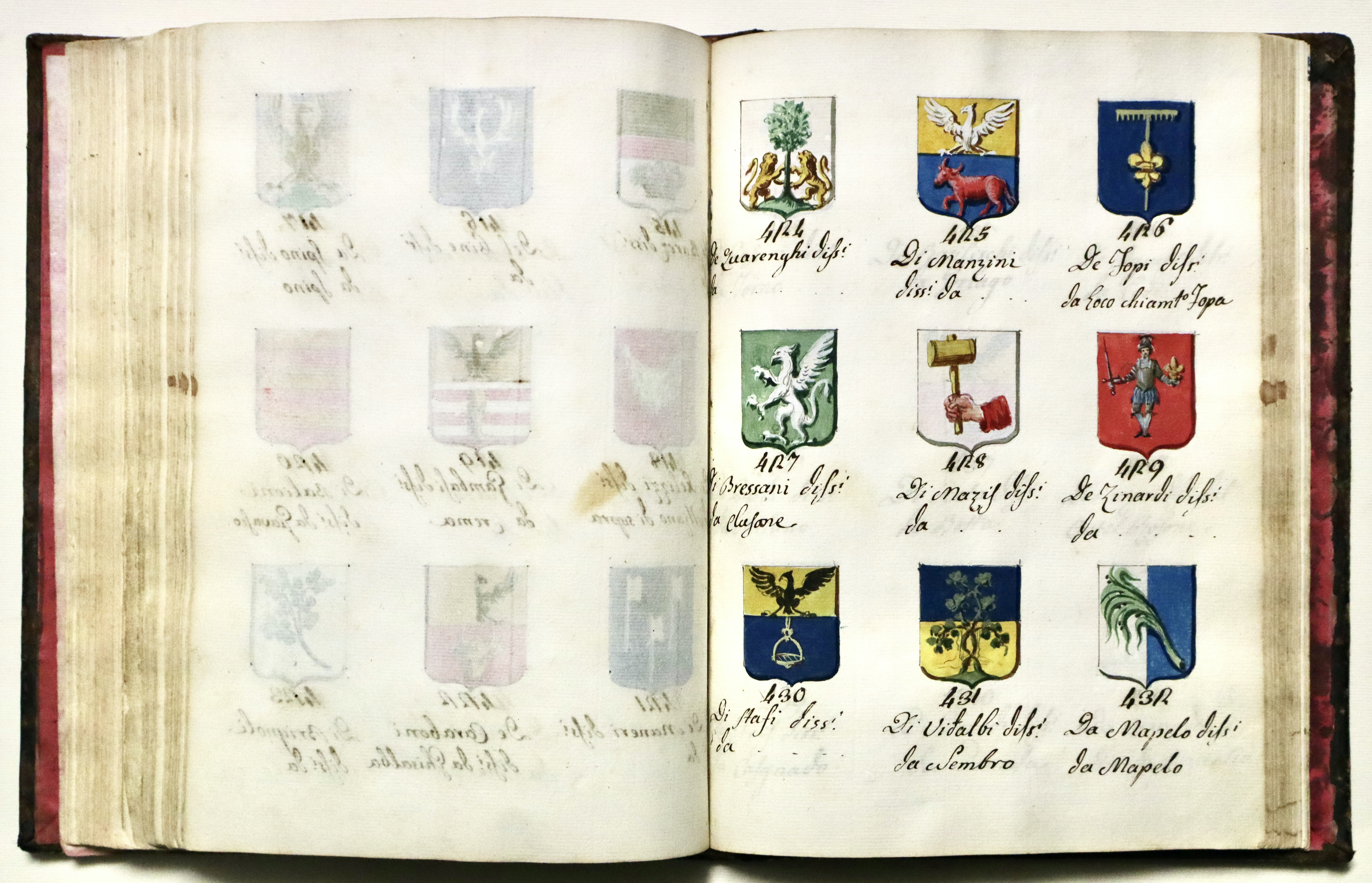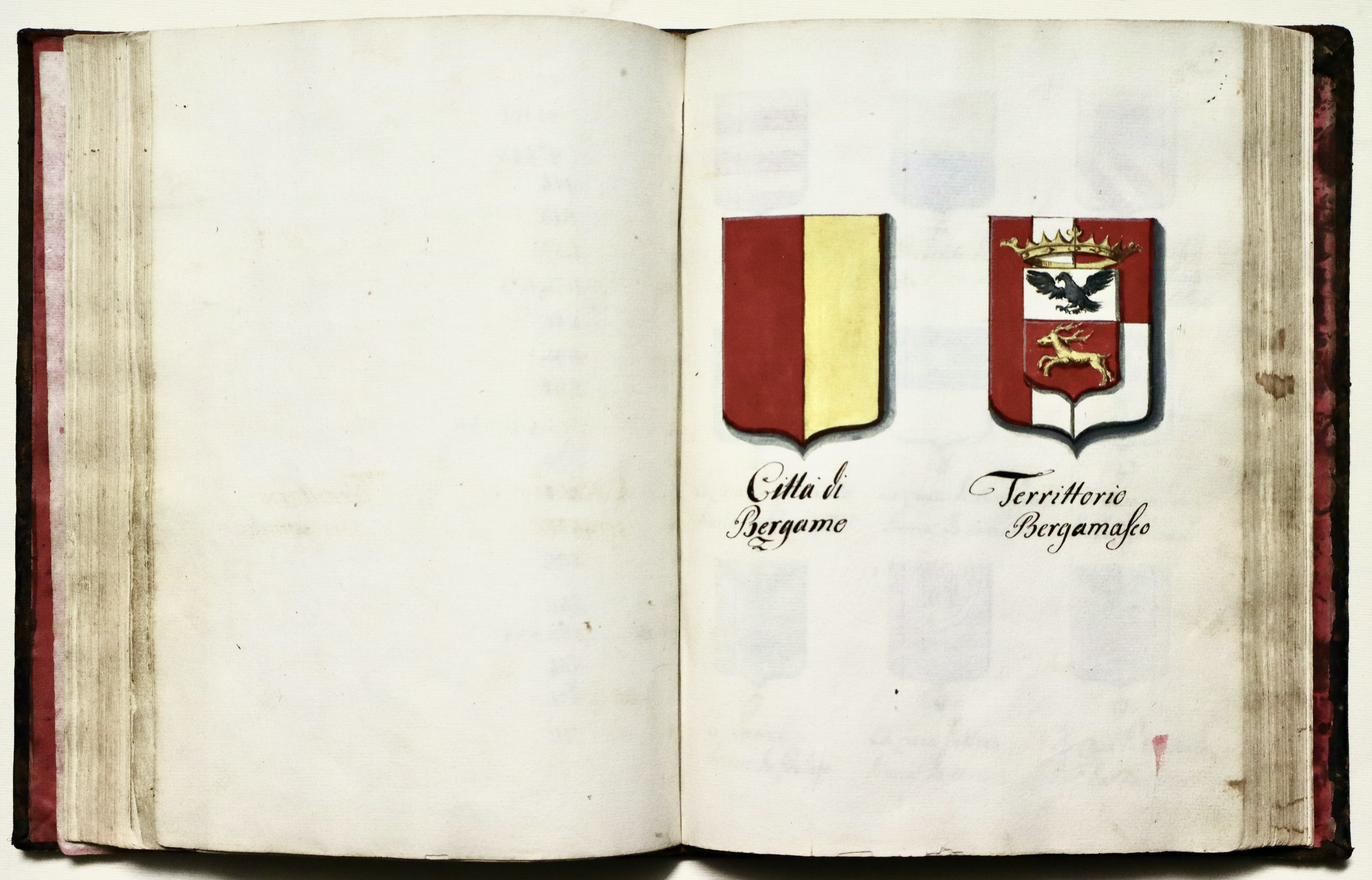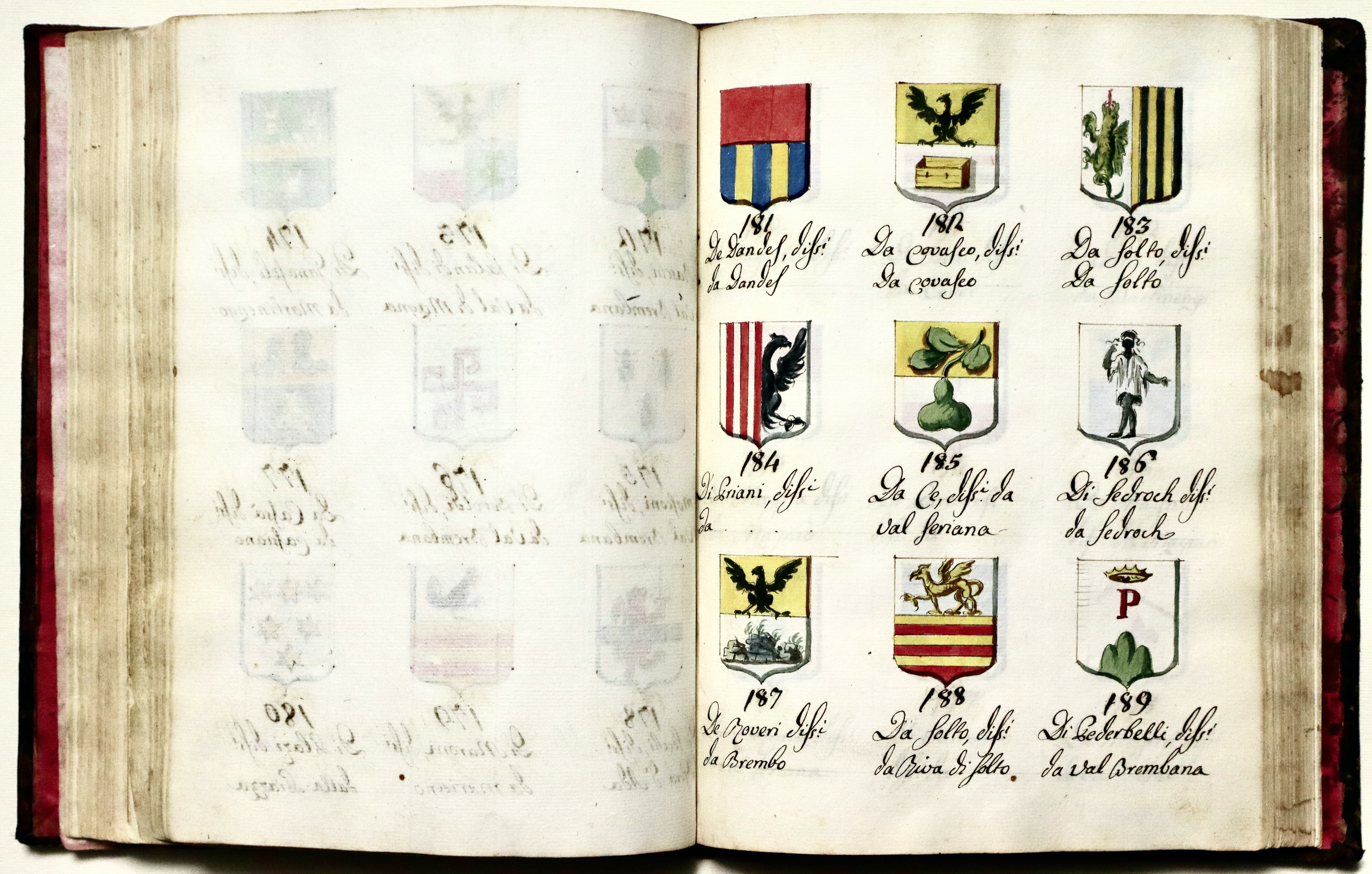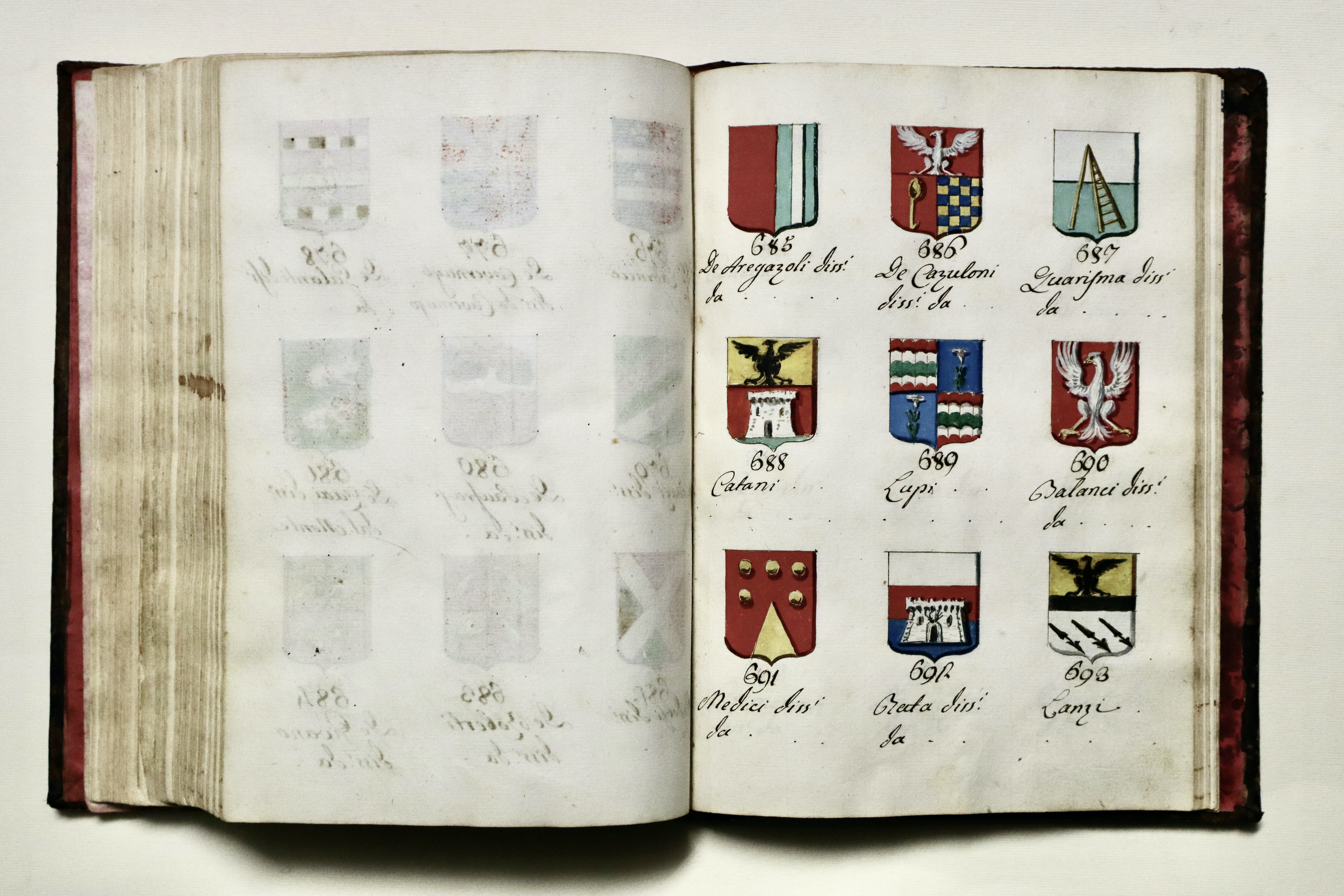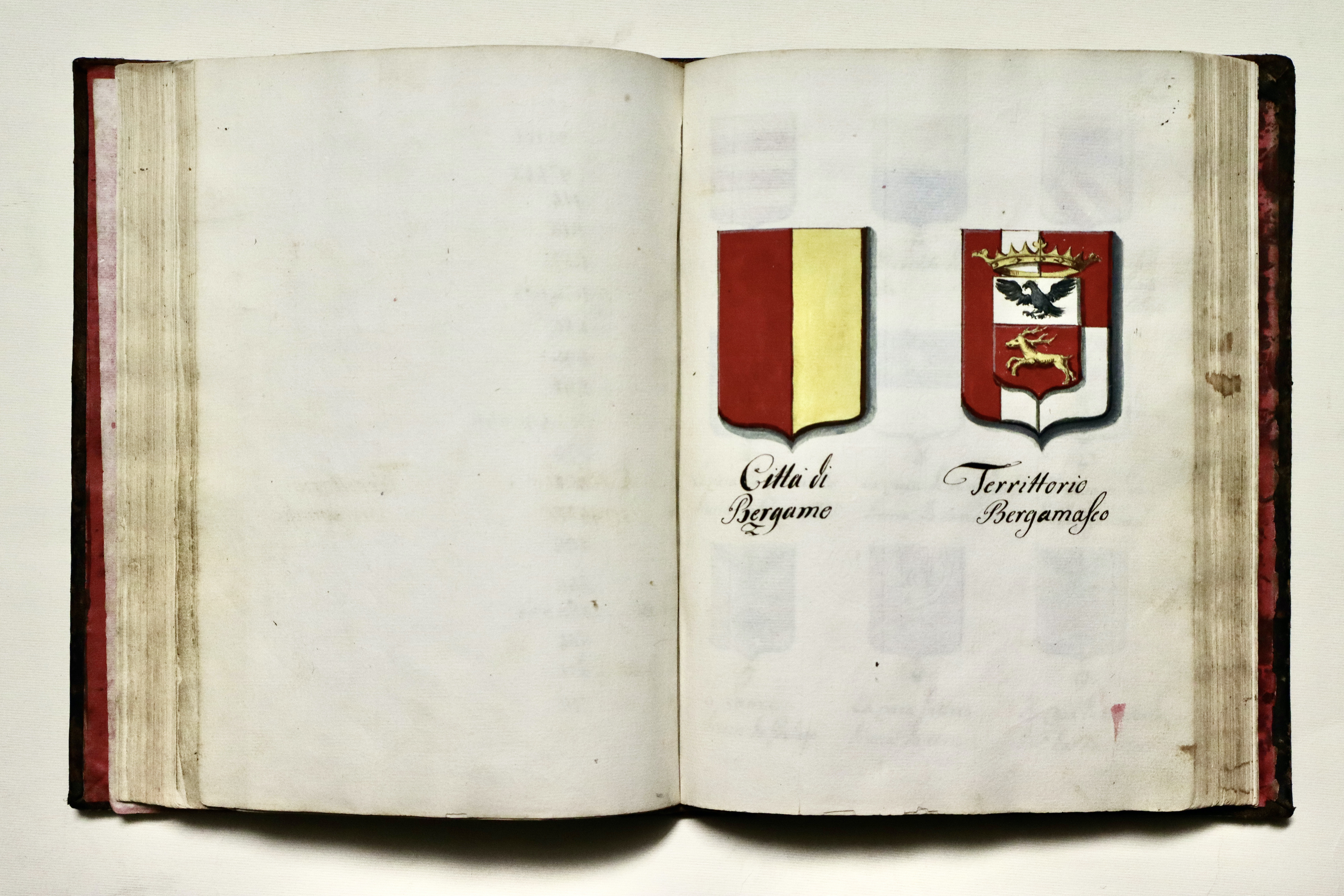 In 4°(mm 250x190). Splendido frontespizio disegnato ad acquerello raffigurante il Leone di San Marco che regge il libro aperto, simbolo di pace, sotto tralci di ulivo e di vite in alto sovrastati dal Corno Ducale. Piena pelle coeva marezzata, dorso a cinque nervi e fregi dorati, dentelle in oro. Segue una spiegazione al lettore: “Tutte quelle famiglie quali godere vogliono nello Stato della Serenissima Repubblica di Venezia Giurisdizioni Feudali, Titoli di Conte, Marchese, o di Cavagliere devono fare suplica al Magistrato E.mō sopra Feudi, presentando li documenti &c. Ivi vengono fatte le determinazioni, e l’E.mo Senato deve approvarle nel libro d’oro essistente in detto Emō Mag.to sopra feudi. Si descrivono queste famiglie, e nel presente libro si sono riportate quelle d’origine Bergamasca. Pagg. (16), 4 carte bianche, 89 pagine numerate di testo entro riquadro con le storie famigliari, 16 carte bianche, pagg. 42 di inventario con la rubrica delle armi esistenti nel presente, una carta bianca, 81 carte non numerate di blasoni nobiliari manoscritti e dipinti di mano d’epoca. Ex libris manoscritto all’interno del piatto. Prezioso documento manoscritto su carta vergellata con marca d’acqua “Scudo con monogramma G A S”. Descrive la storia di circa 729 famiglie nobili bergamasche e del territorio dal 1656 al 1774, riccamente illustrato dai rispettivi stemmi araldici. Ne racconta brevemente la storia, loro origini e dettagli sui loro stemmi araldici, elegantemente disegnati e dipinti con colori coevi. I registri ufficiali chiamati “Libro d'Oro" (o simili) furono tenuti dall’Avogadoria de Comun, la magistratura che aveva il compito di tutela degli interessi del Comune Veneciarum e della legalità costituzionale dello Stato; registrava l’insieme delle famiglie costituenti il patriziato veneziano e le loro genealogie. Gli Avogadori ebbero da subito notevoli poteri di controllo e di ispezione. Queste opere furono documenti di precisione archivistica, fondamentali per la storia della nobiltà veneta, per il patriziato veneziano e il patriziato di terraferma, che detenevano i diritti di governo nella Repubblica. Bellissimo esemplare che presenta restauri alle cuffie.