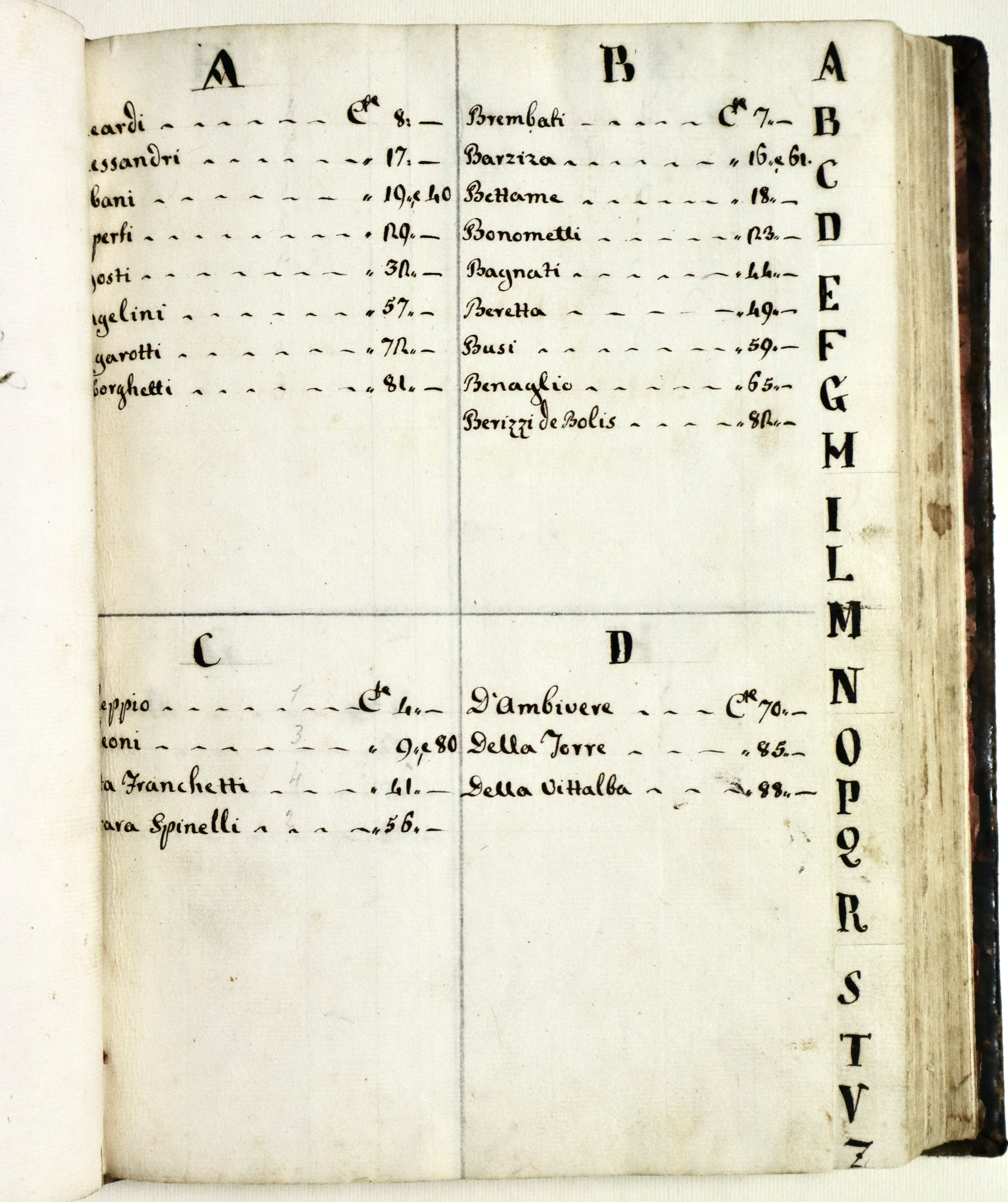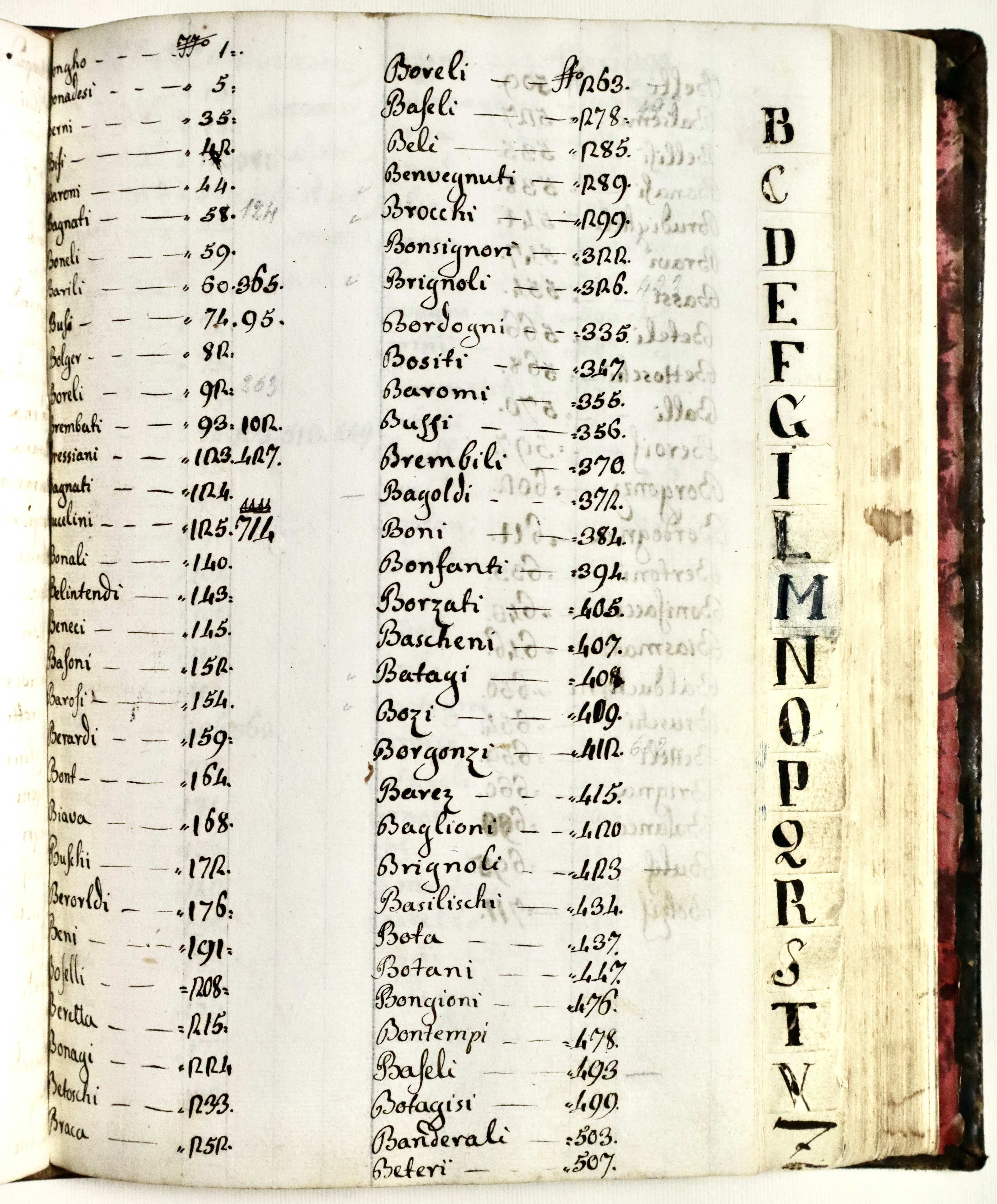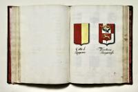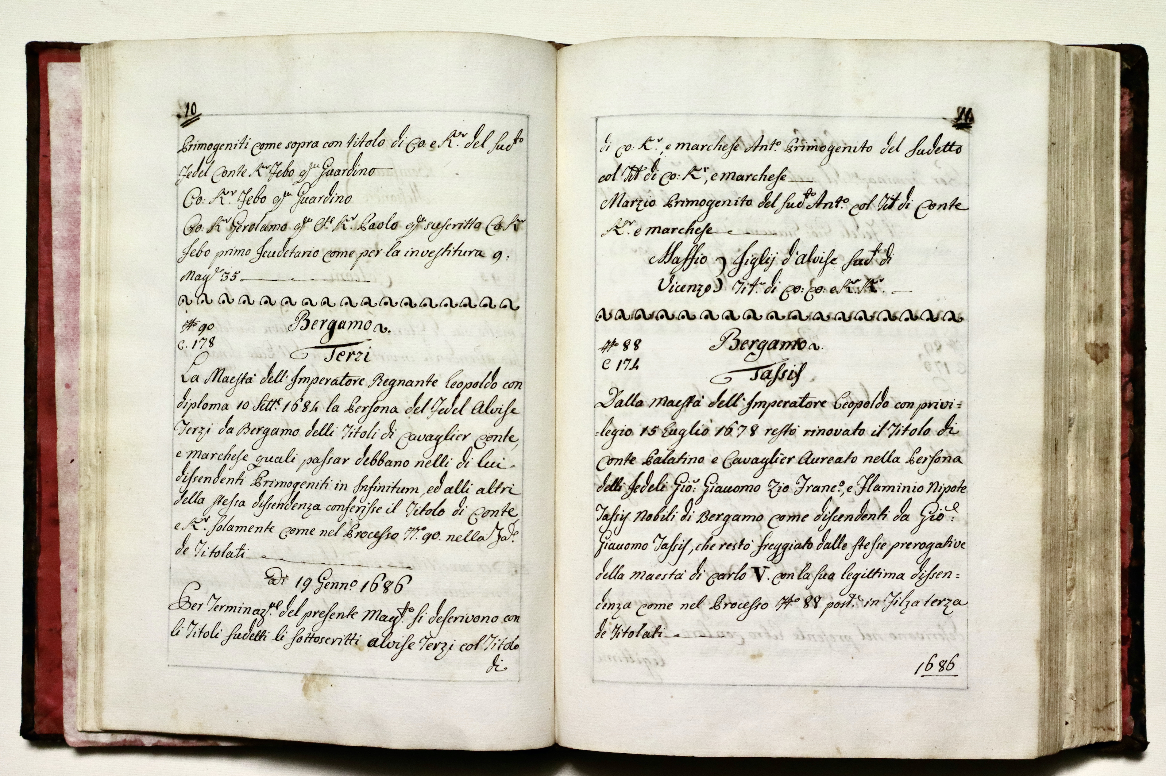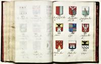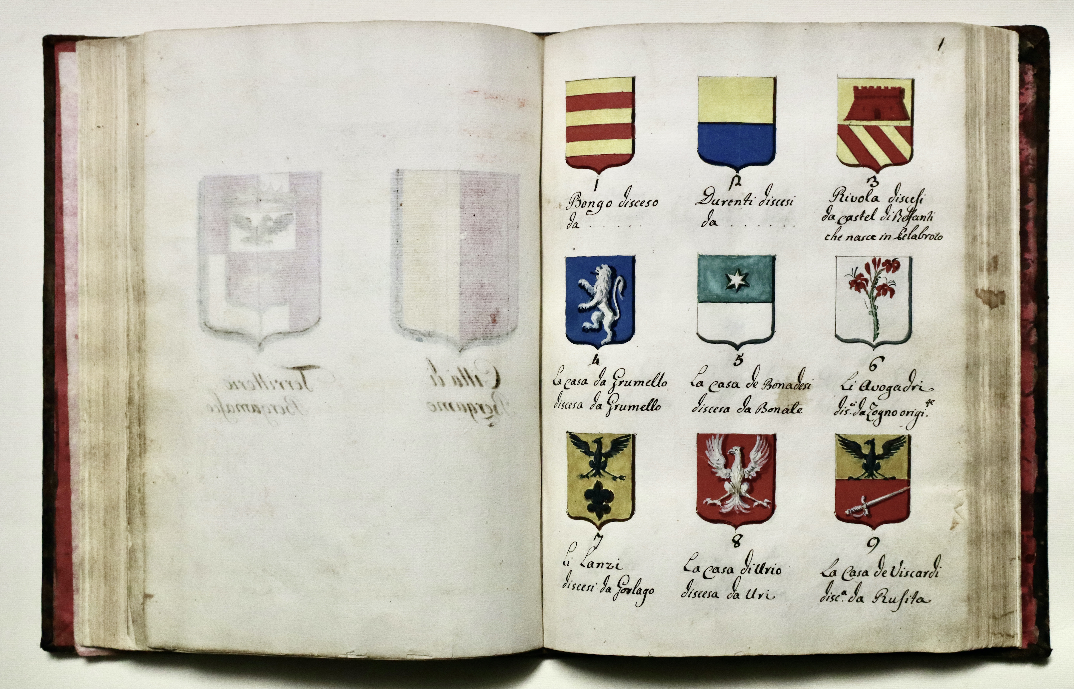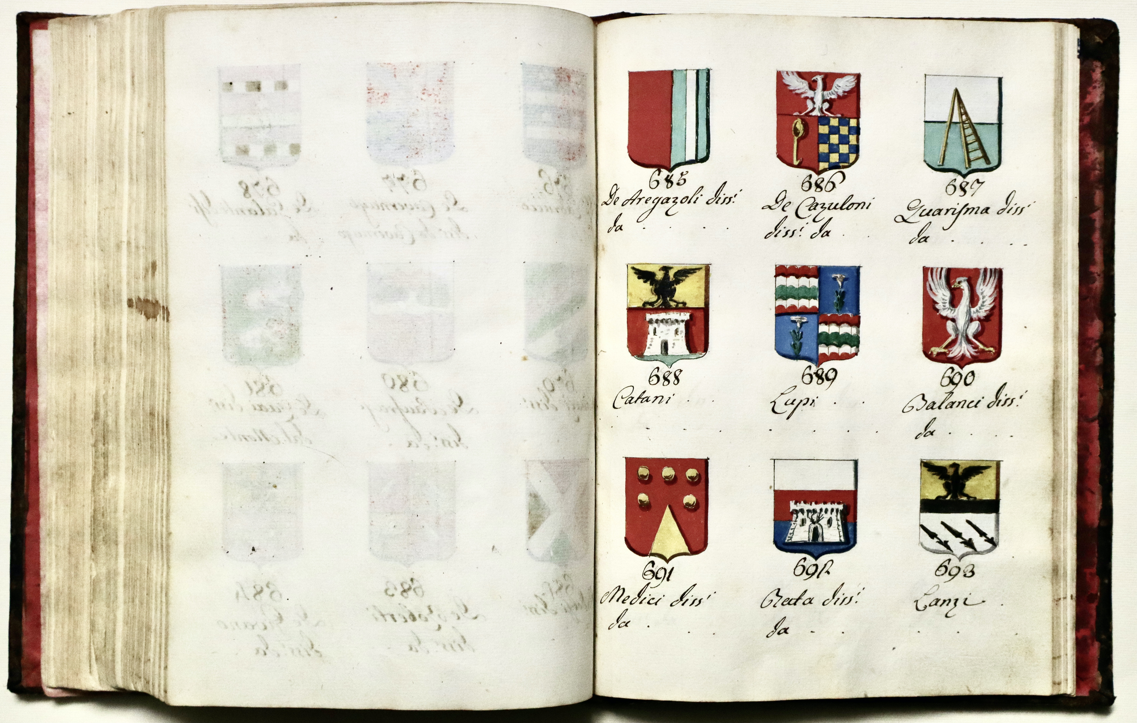 In 4°(mm 250x190). Splendido frontespizio disegnato ad acquerello raffigurante il Leone di San Marco che regge il libro aperto, simbolo di pace, sotto tralci di ulivo e di vite in alto sovrastati dal Corno Ducale. Piena pelle coeva marezzata, dorso a cinque nervi e fregi dorati, dentelle in oro. Segue una spiegazione al lettore: “Tutte quelle famiglie quali godere vogliono nello Stato della Serenissima Repubblica di Venezia Giurisdizioni Feudali, Titoli di Conte, Marchese, o di Cavagliere devono fare suplica al Magistrato E.mō sopra Feudi, presentando li documenti &c. Ivi vengono fatte le determinazioni, e l’E.mo Senato deve approvarle nel libro d’oro essistente in detto Emō Mag.to sopra feudi. Si descrivono queste famiglie, e nel presente libro si sono riportate quelle d’origine Bergamasca. Pagg. (16), 4 carte bianche, 89 pagine numerate di testo entro riquadro con le storie famigliari, 16 carte bianche, pagg. 42 di inventario con la rubrica delle armi esistenti nel presente, una carta bianca, 81 carte non numerate di blasoni nobiliari manoscritti e dipinti di mano d’epoca. Ex libris manoscritto all’interno del piatto. Prezioso documento manoscritto su carta vergellata con marca d’acqua “Scudo con monogramma G A S”. Descrive la storia di circa 729 famiglie nobili bergamasche e del territorio dal 1656 al 1774, riccamente illustrato dai rispettivi stemmi araldici. Ne racconta brevemente la storia, loro origini e dettagli sui loro stemmi araldici, elegantemente disegnati e dipinti con colori coevi. I registri ufficiali chiamati “Libro d'Oro" (o simili) furono tenuti dall’Avogadoria de Comun, la magistratura che aveva il compito di tutela degli interessi del Comune Veneciarum e della legalità costituzionale dello Stato; registrava l’insieme delle famiglie costituenti il patriziato veneziano e le loro genealogie. Gli Avogadori ebbero da subito notevoli poteri di controllo e di ispezione. Queste opere furono documenti di precisione archivistica, fondamentali per la storia della nobiltà veneta, per il patriziato veneziano e il patriziato di terraferma, che detenevano i diritti di governo nella Repubblica. Bellissimo esemplare che presenta restauri alle cuffie.