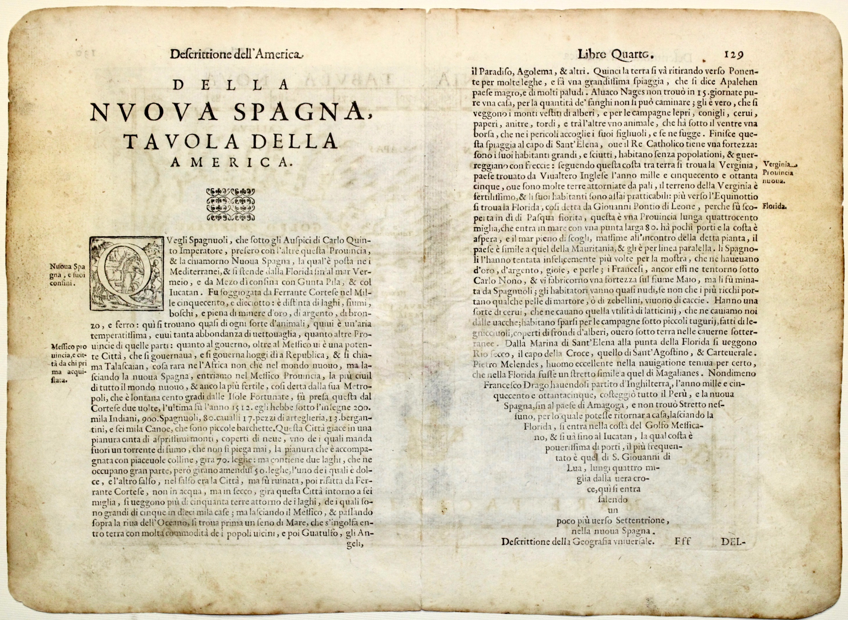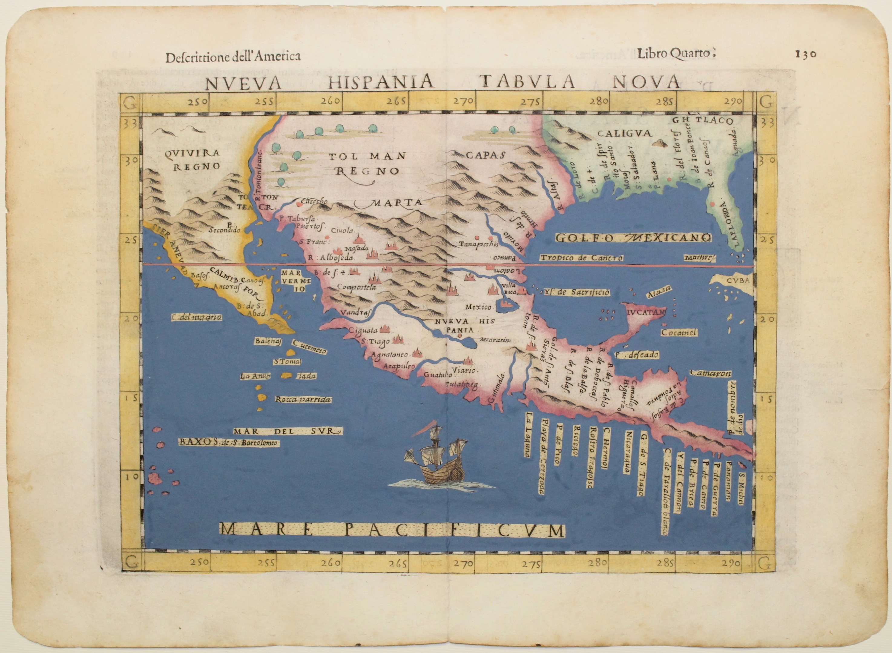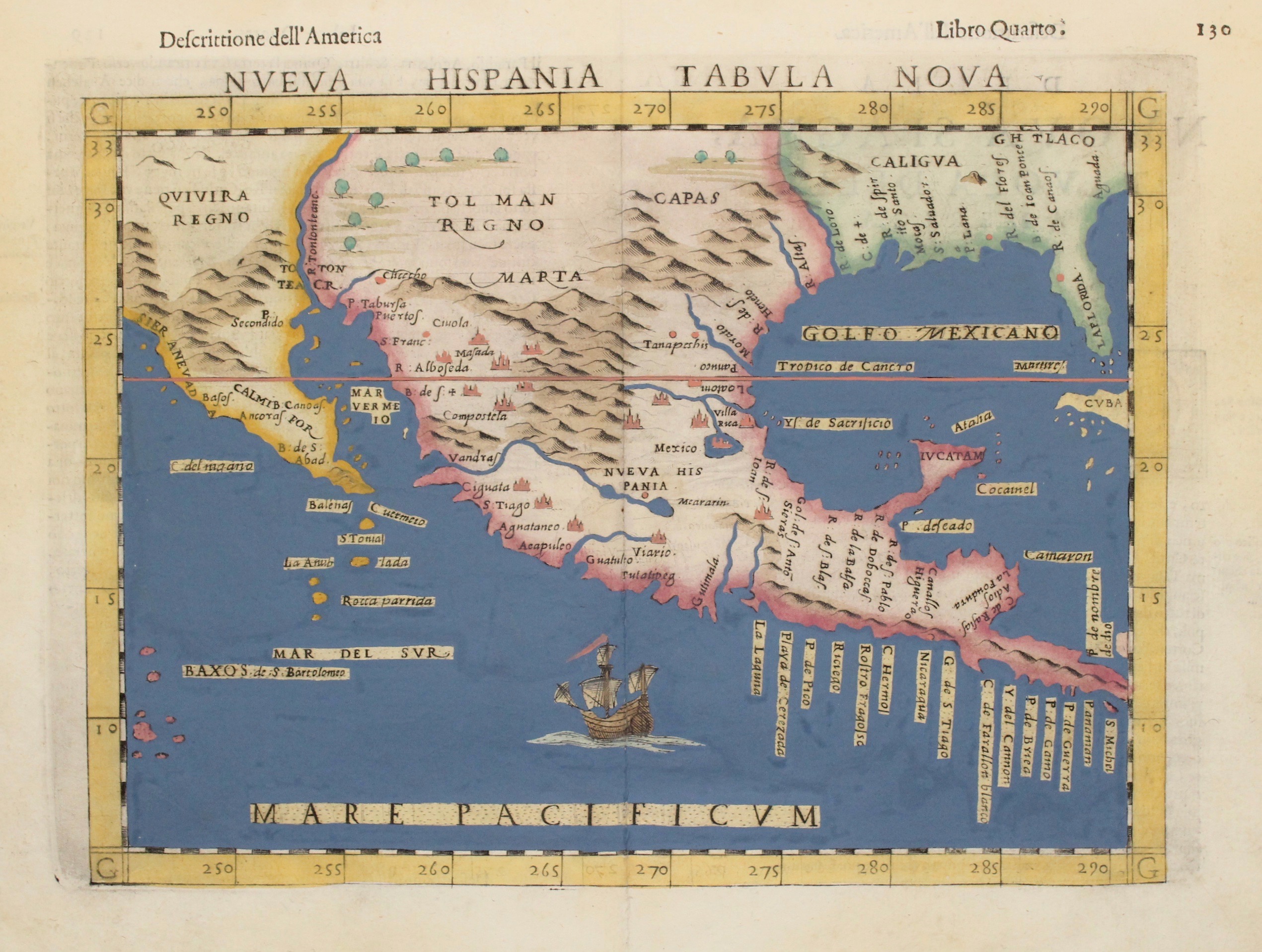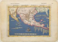 Copperplate engraving, hand-painted mm 187x255. Good copy. Taken from the edition of Ptolemy's "Geography", edited by Moleto and published by the Sessa heirs, third edition in Ruscelli's translation. The map is based on Gastaldi's map of 1548 published in his edition of 'Geography' that was one of the two first regional maps of North America (together with Tierra Nueva Tabula). This third edition, 3rd State, is the rarest of the three, is significantly revised and includes numerous embellishments and additions of place names and a revised topography, including many new islands. As a decorative element, a ship in the Mare Pacificum. New labels are added, including Calmifor (California), Sierra Nevad (Sierra Nevada) and Golfo Mexicano (Gulf of Mexico). This is perhaps the most influential map of the Southwest during the 16th century. It is also one of the earliest maps of the region and represents an important contribution to our knowledge of the geography of New Spain. Fine specimen, minimal one-centimetre tear to the right margin. Girolamo Ruscelli (1500-1566) was born in Viterbo and was an important writer and publisher, who after studying in Padua spent his career between Rome and Naples, where he died. Burden 31.