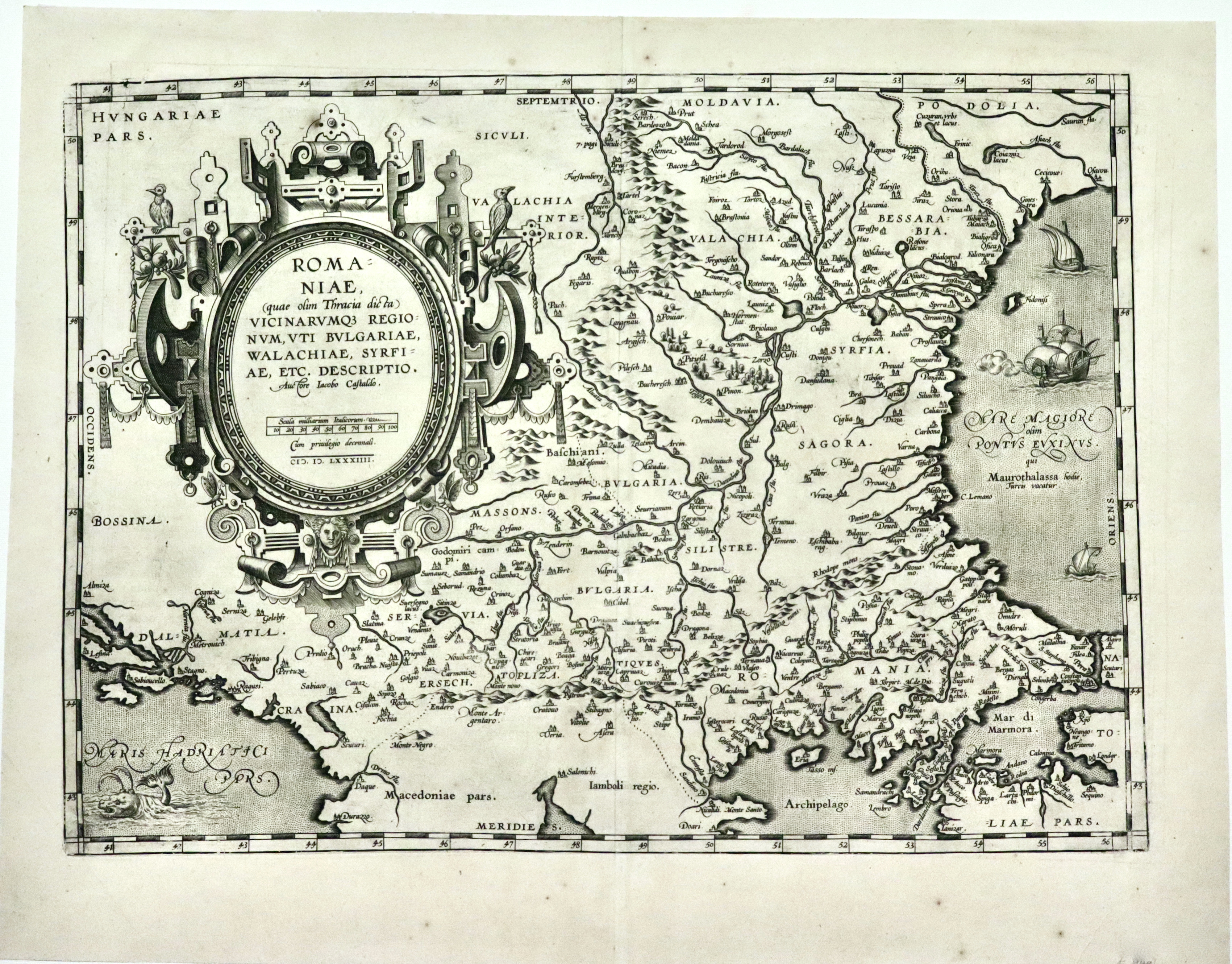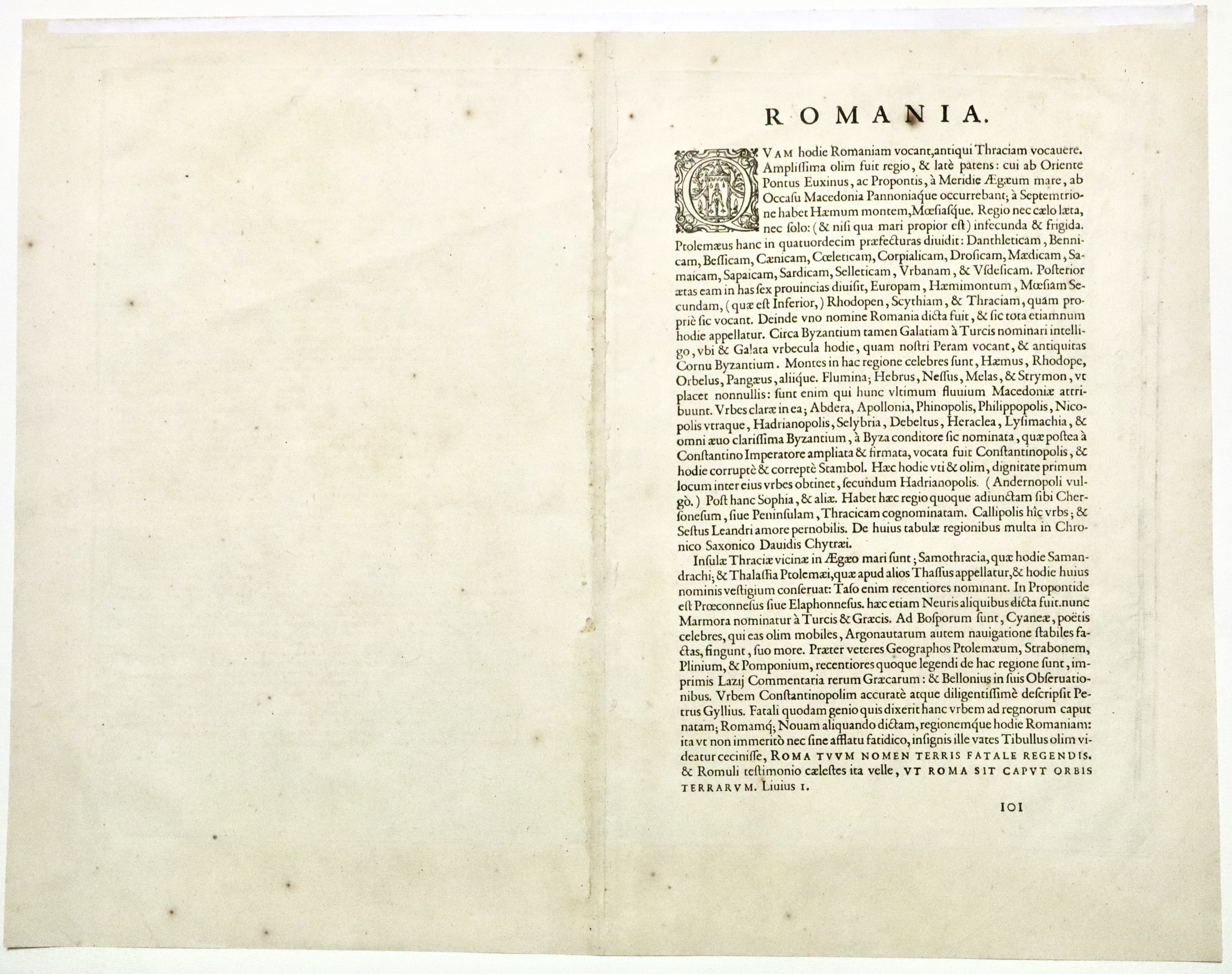 Incisione in rame di mm 355x500 tratta da “Theatrum Orbis Terrarum”, opera che ebbe un successo immediato e numerosissime riedizioni. Il “Theatrum” è considerato il primo atlante moderno, comprendente carte di tutte le zone del mondo; la geniale intuizione di Abraham Ortel (1528-1598), che latinizzò il proprio nome in Ortelius, fu quella di riunire in un unico corpus la produzione cartografica eterogenea del periodo, costituendo la base per un'impresa editoriale di enorme successo, pubblicata dal 1570 al 1612. Prima d'allora, infatti, la produzione cartografica era stata irregolare e di produzione locale, ed i pochi atlanti, i cosiddetti "Atlanti Lafreriani", erano costituiti su richiesta del committente, raccogliendo unicamente carte di alcune zone. Ottime condizioni. Al verso, v’è il testo in latino di descrizione della Romania.