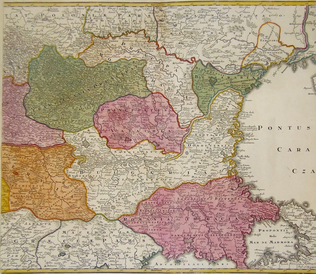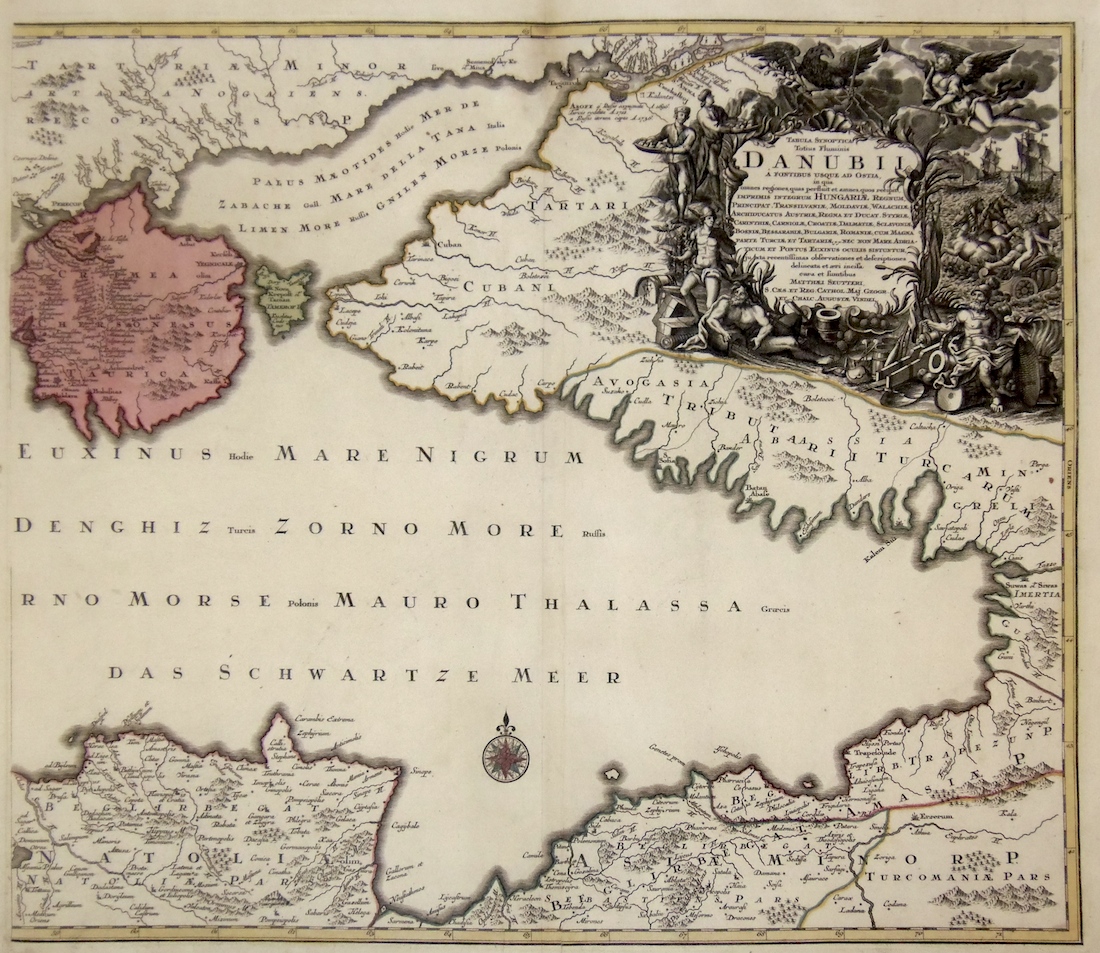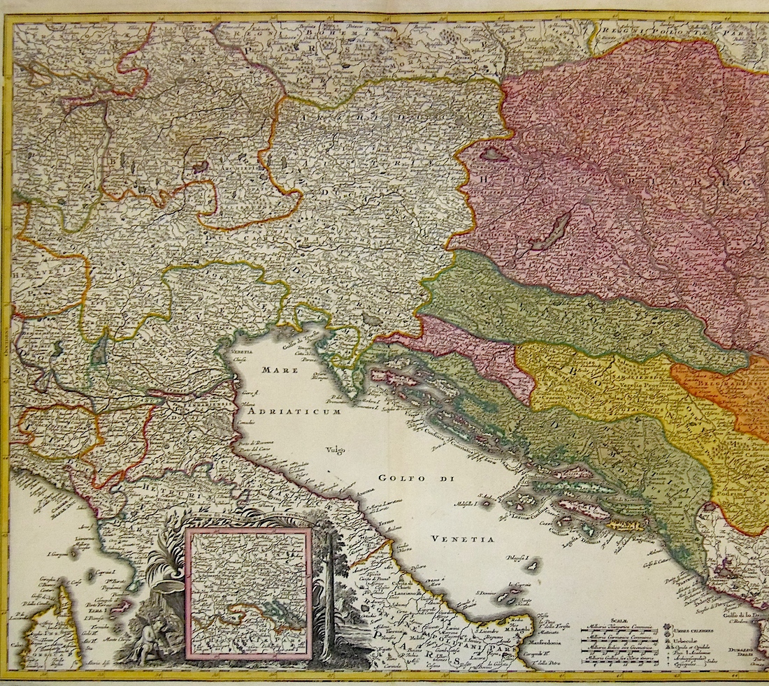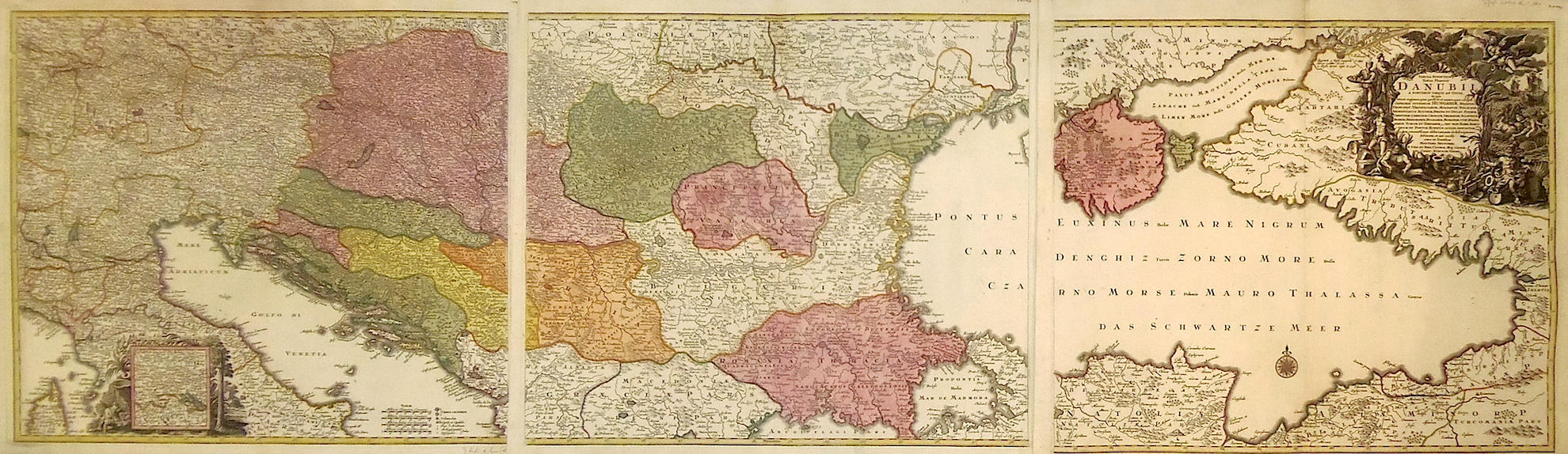Copperplate, original colour, mm 493x568 for total mm 493x1704. Very good example in fine colour. Some light stains. Seutter, after having worked with Homann in Nuremberg, opened his own activity in Augsburg around 1720. His maps always have elaborate cartouches and are very decorative and printed on good paper.