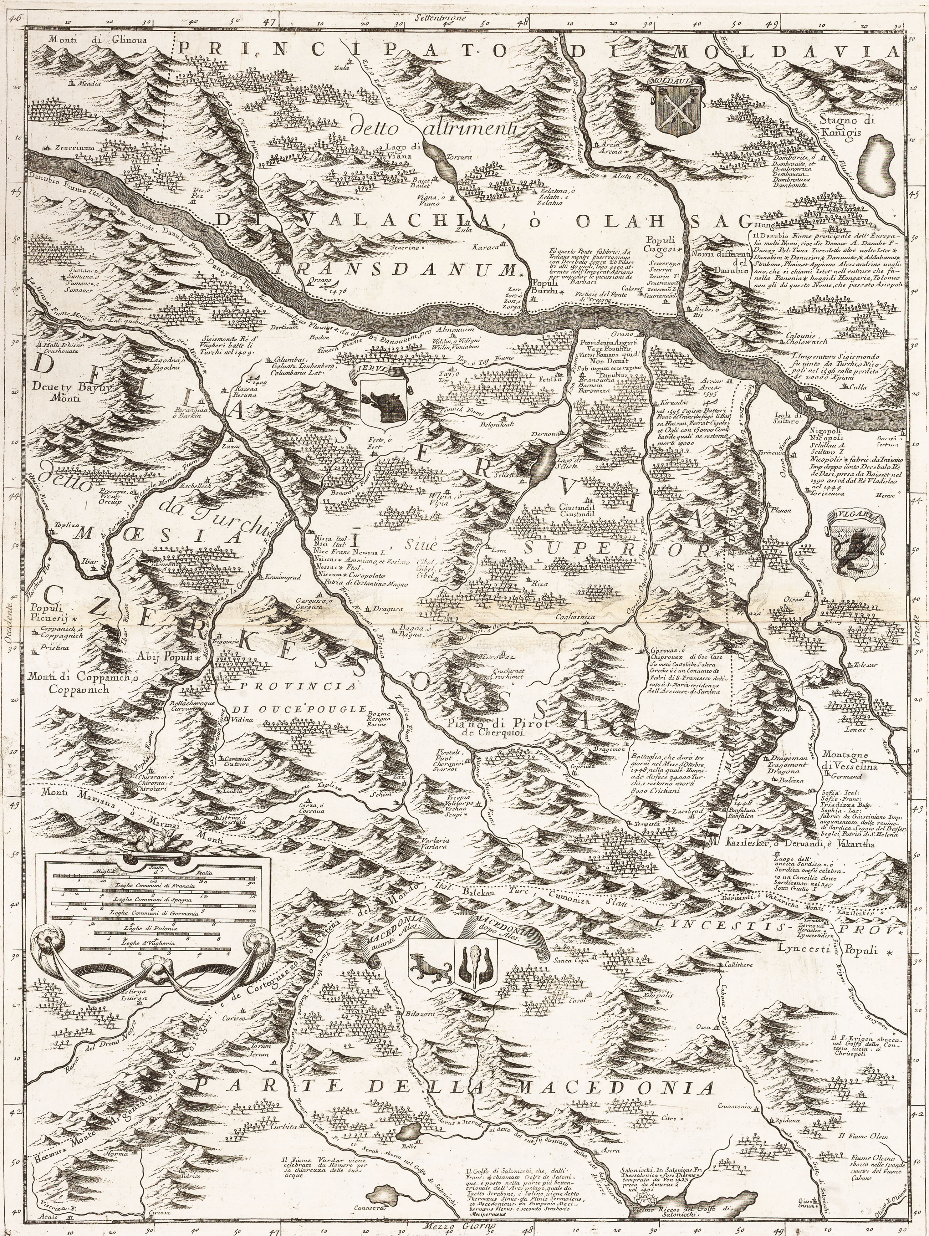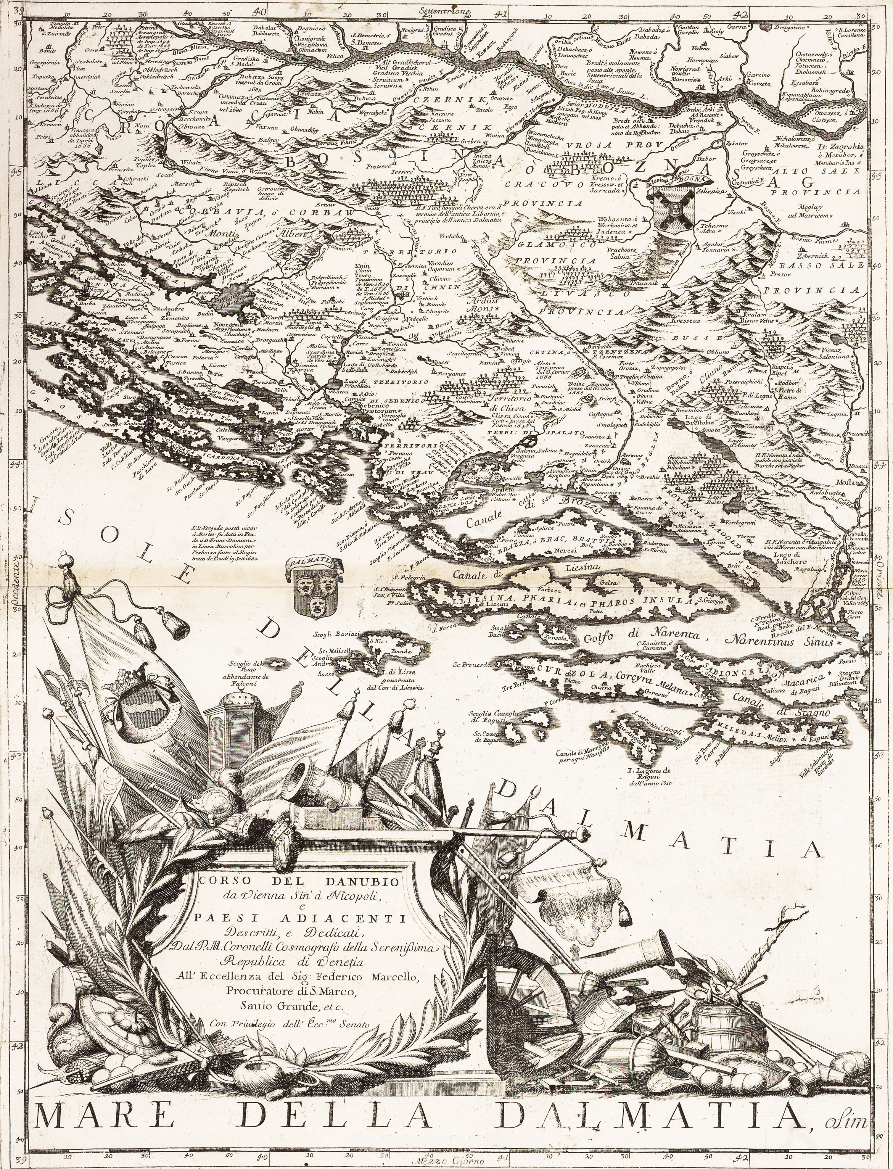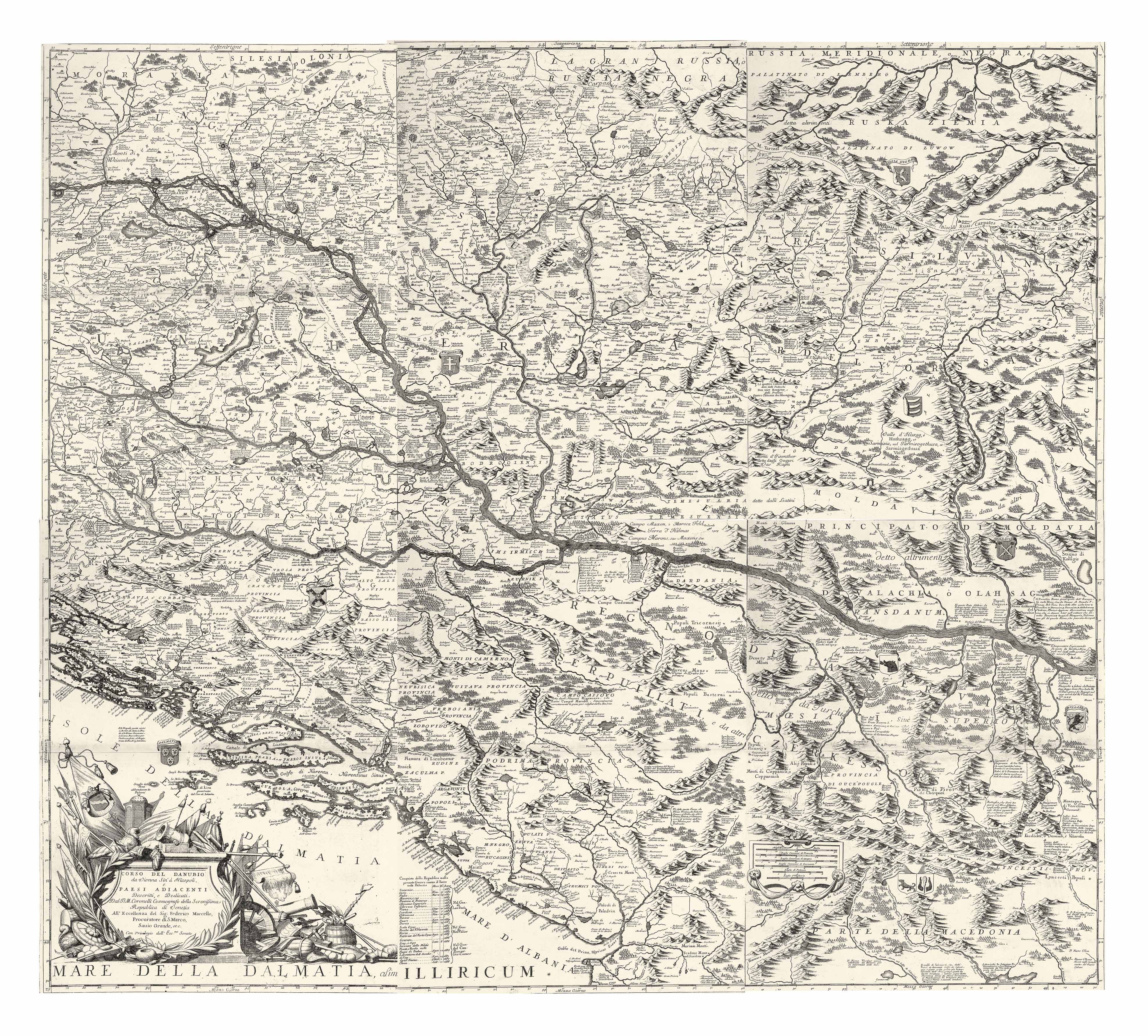 Copper engraving on six unjoined sheets, 1200x1350 mm. This large wall map of the course of the River Danube from Vienna to the town of present day Nikopol in Bulgaria. The six sheets comprise a very large-scale map with detailed coverage of the region. It takes in modern day Hungary, southern Romania, much of Bulgaria, former Yugoslavia and the Dalmatian coast. Numerous regional coats of arms appear on the map which has a large decorative title cartouche with the imprint of the renowned Venetian mapmaker Coronelli. Although the title of the map relates to the course of the Danube River, Coronelli's intention was to show the theatre of the War of the Holy League (or Great Turkish War), 1683-99. Besides geographical features Coronelli includes historical data: many towns and cities have a list of the dates they were captured by the Turks or the Europeans. These give clues to the dates of the engraving: for example it notes Belgrade's capture by Duke Maximilian of Bavaria in September 1688 but not its recapture by the Turks in October 1690. A contemporary hand has added two more imperial victories in 1693, at 'Giulia' and 'Desno' in Hungary. Typically Coronelli is expecially proud of his home city's victories: next to the martial title cartouche is a list of Venice's conquests in Dalmatia, 1682-88. Vincenzo Maria Coronelli is considered one of the greatest, most industrious, and most eclectic Italian cartographers. Born in 1650 of modest origins, he received an ecclesiastical education in the Order of the Friars Minor Conventual of Saint Francis; he later became their Grand General and subsequently obtained the title of cosmographer of the Republic. He was also a public lecturer in geography at the University of Venice and the founder, at the same site of the Friars Minor convent, of the first geographical association: the Cosmographic Academy of the Argonauts. Having become famous as a mathematician and cosmographer, in 1681 he was called to the court of Louis XIV to construct two extraordinary and highly refined globes, one terrestrial and one celestial, 4 meters in diameter. His cartographic production consists of approximately 500 maps, all based on multiple sources, which allowed him to enrich the maps with a wealth of information (his toponymic precision is renowned) and occasionally to include curiosities and historical events. We owe him many famous geographical works: in addition to the Theatre of War, of notable importance are the Venetian Atlas, the Isolario, the Universal Course, the Singularities of Venice, the Book of Globes, etc.