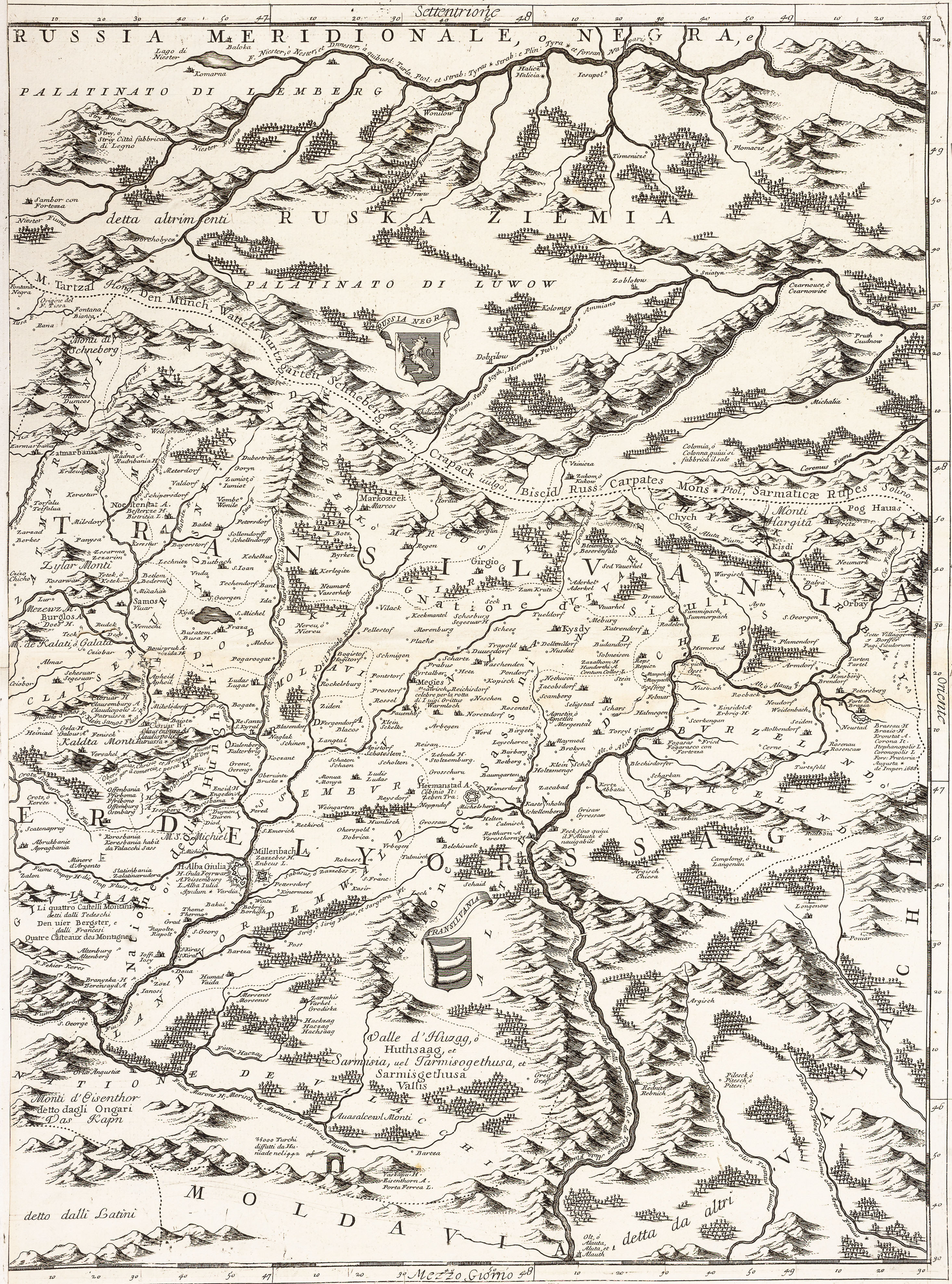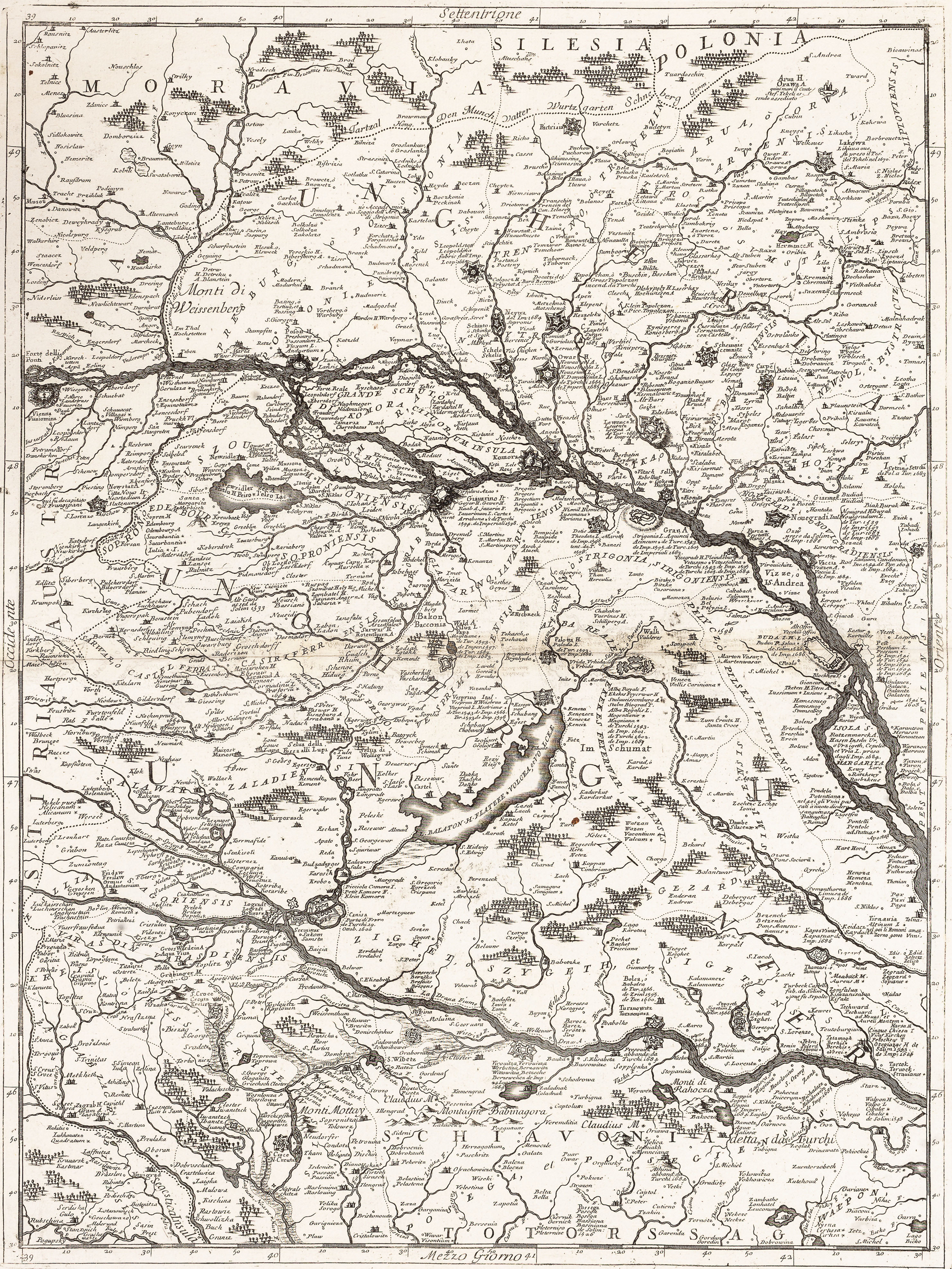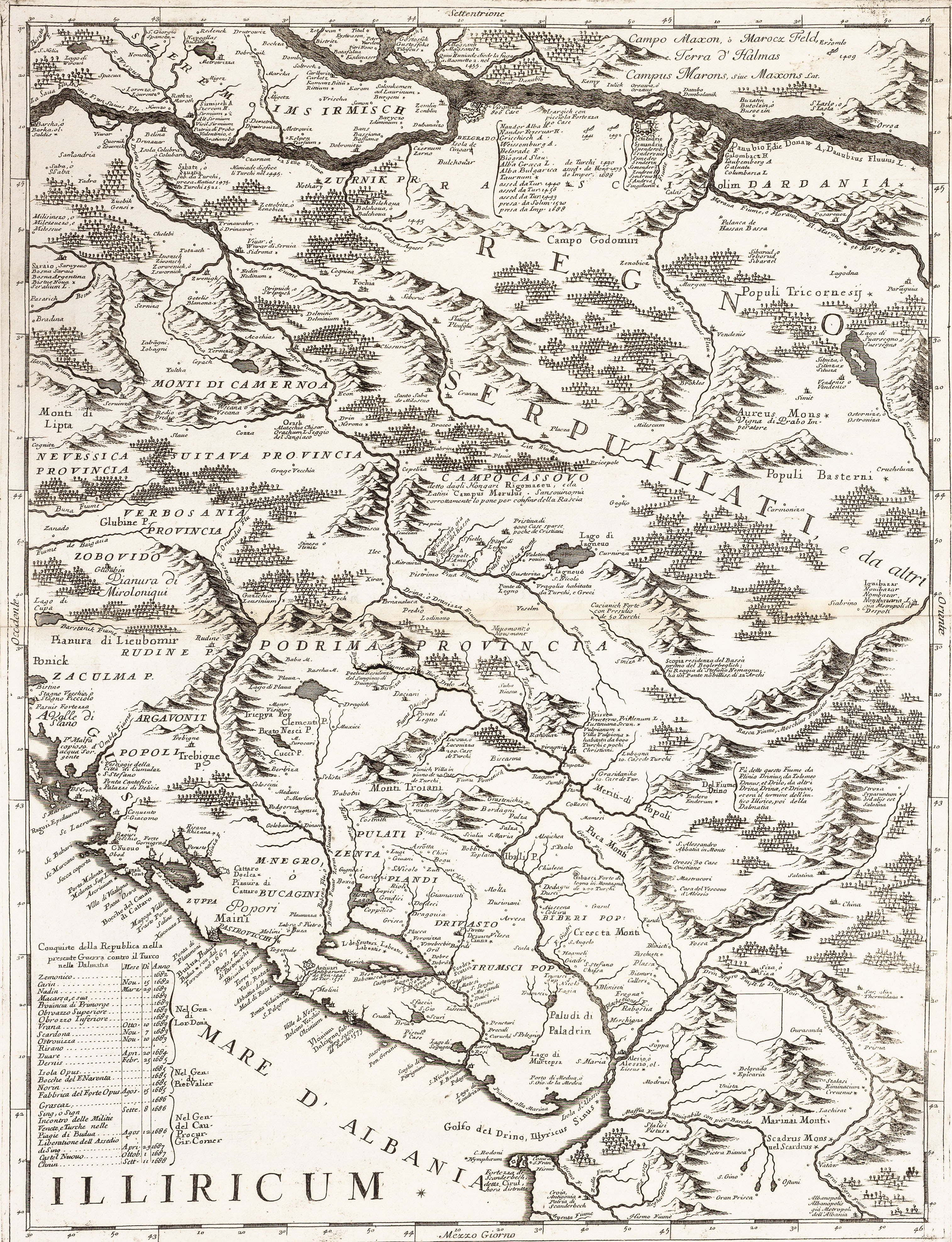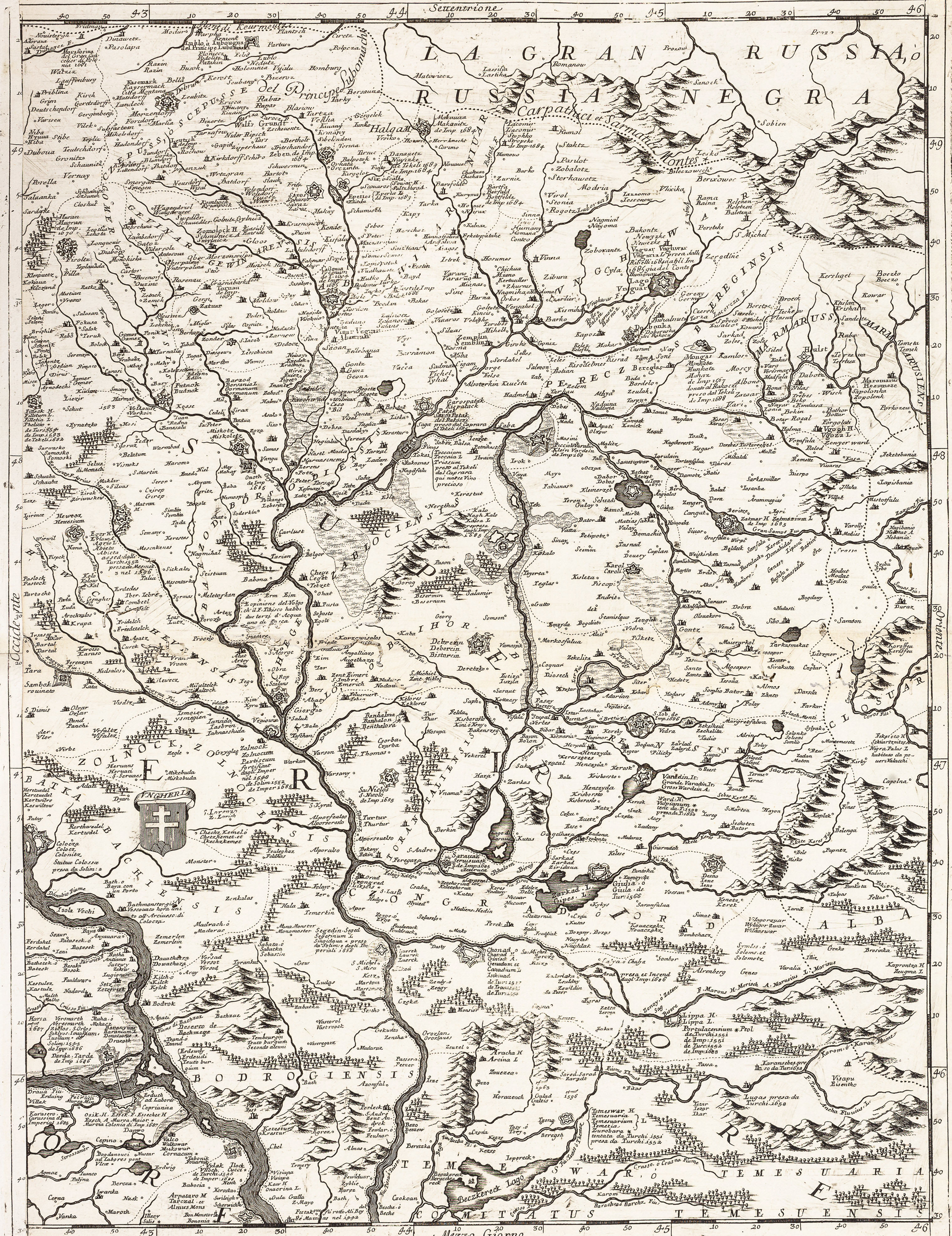 Copper engraving on six unjoined sheets, 1200x1350 mm. This large wall map of the course of the River Danube from Vienna to the town of present day Nikopol in Bulgaria. The six sheets comprise a very large-scale map with detailed coverage of the region. It takes in modern day Hungary, southern Romania, much of Bulgaria, former Yugoslavia and the Dalmatian coast. Numerous regional coats of arms appear on the map which has a large decorative title cartouche with the imprint of the renowned Venetian mapmaker Coronelli. Although the title of the map relates to the course of the Danube River, Coronelli's intention was to show the theatre of the War of the Holy League (or Great Turkish War), 1683-99. Besides geographical features Coronelli includes historical data: many towns and cities have a list of the dates they were captured by the Turks or the Europeans. These give clues to the dates of the engraving: for example it notes Belgrade's capture by Duke Maximilian of Bavaria in September 1688 but not its recapture by the Turks in October 1690. A contemporary hand has added two more imperial victories in 1693, at 'Giulia' and 'Desno' in Hungary. Typically Coronelli is expecially proud of his home city's victories: next to the martial title cartouche is a list of Venice's conquests in Dalmatia, 1682-88. Vincenzo Maria Coronelli is considered one of the greatest, most industrious, and most eclectic Italian cartographers. Born in 1650 of modest origins, he received an ecclesiastical education in the Order of the Friars Minor Conventual of Saint Francis; he later became their Grand General and subsequently obtained the title of cosmographer of the Republic. He was also a public lecturer in geography at the University of Venice and the founder, at the same site of the Friars Minor convent, of the first geographical association: the Cosmographic Academy of the Argonauts. Having become famous as a mathematician and cosmographer, in 1681 he was called to the court of Louis XIV to construct two extraordinary and highly refined globes, one terrestrial and one celestial, 4 meters in diameter. His cartographic production consists of approximately 500 maps, all based on multiple sources, which allowed him to enrich the maps with a wealth of information (his toponymic precision is renowned) and occasionally to include curiosities and historical events. We owe him many famous geographical works: in addition to the Theatre of War, of notable importance are the Venetian Atlas, the Isolario, the Universal Course, the Singularities of Venice, the Book of Globes, etc.