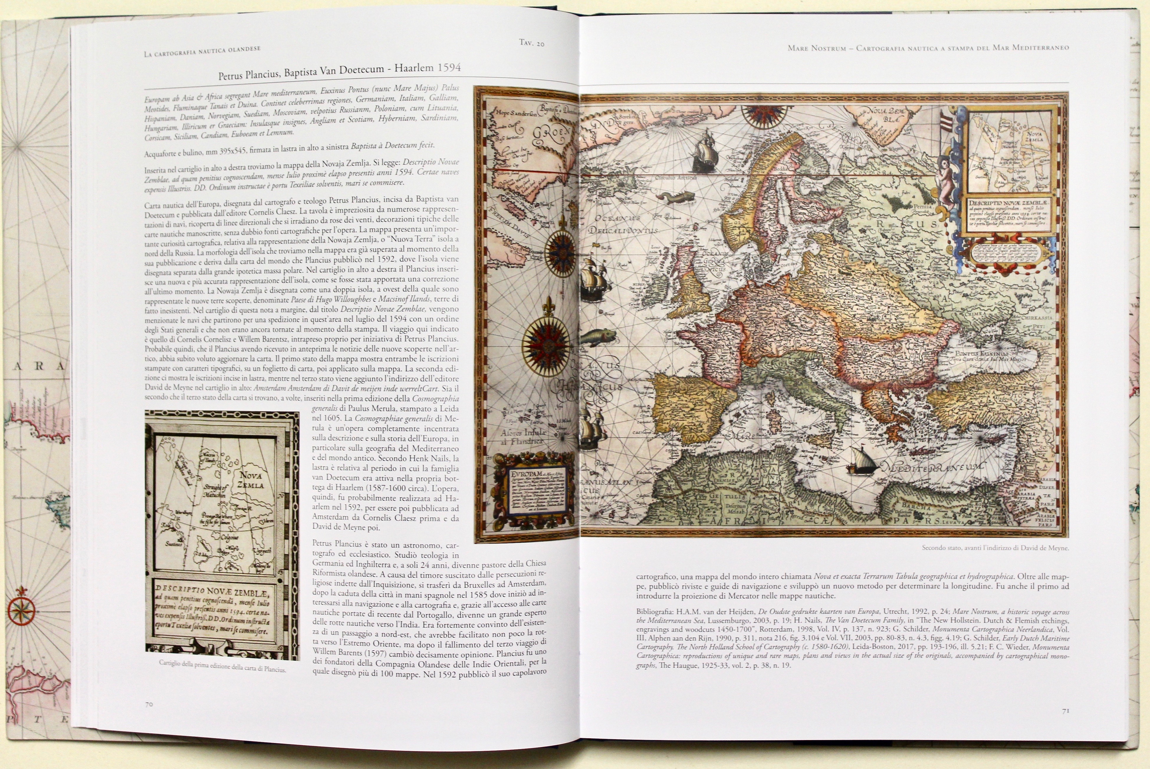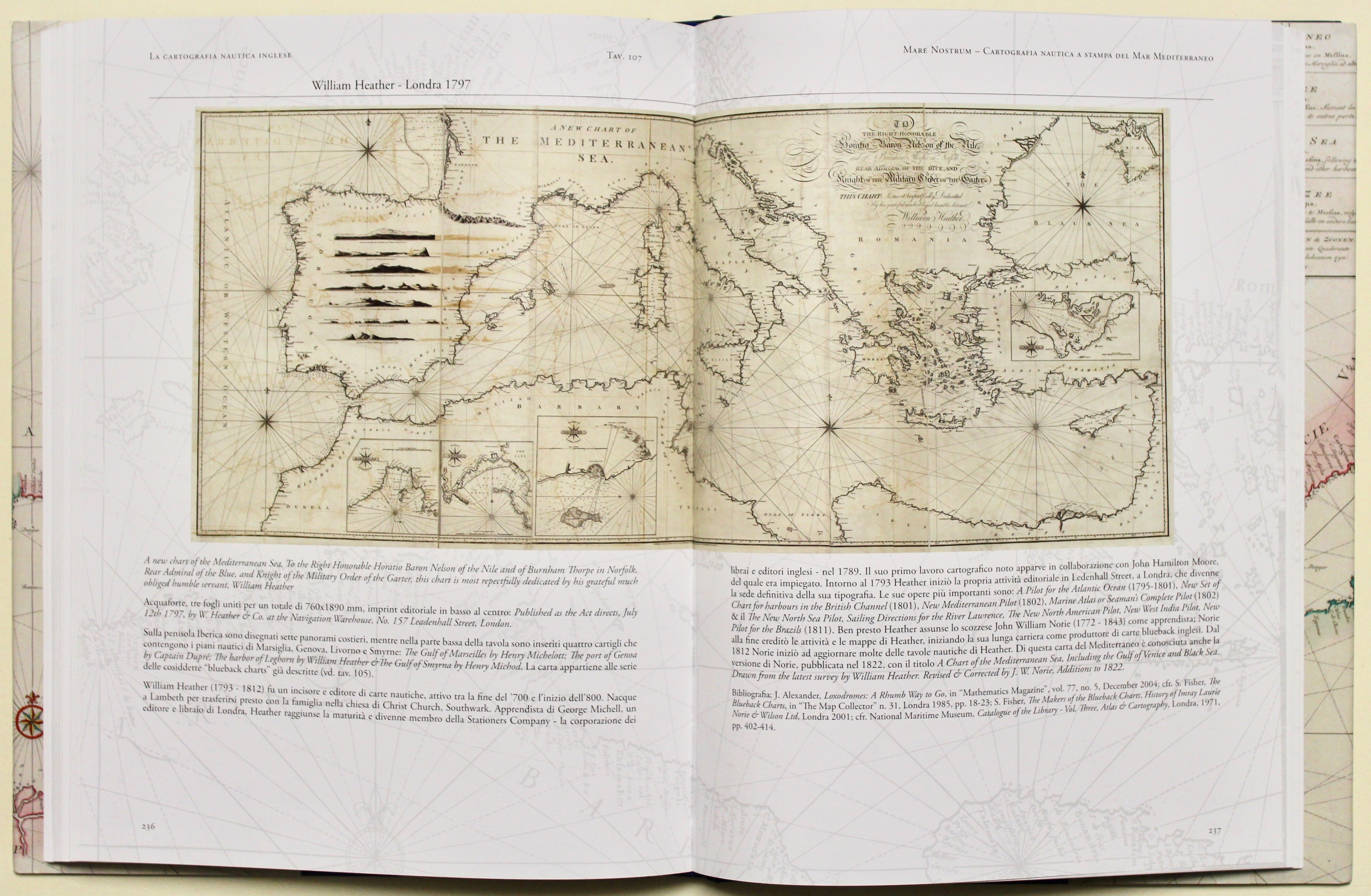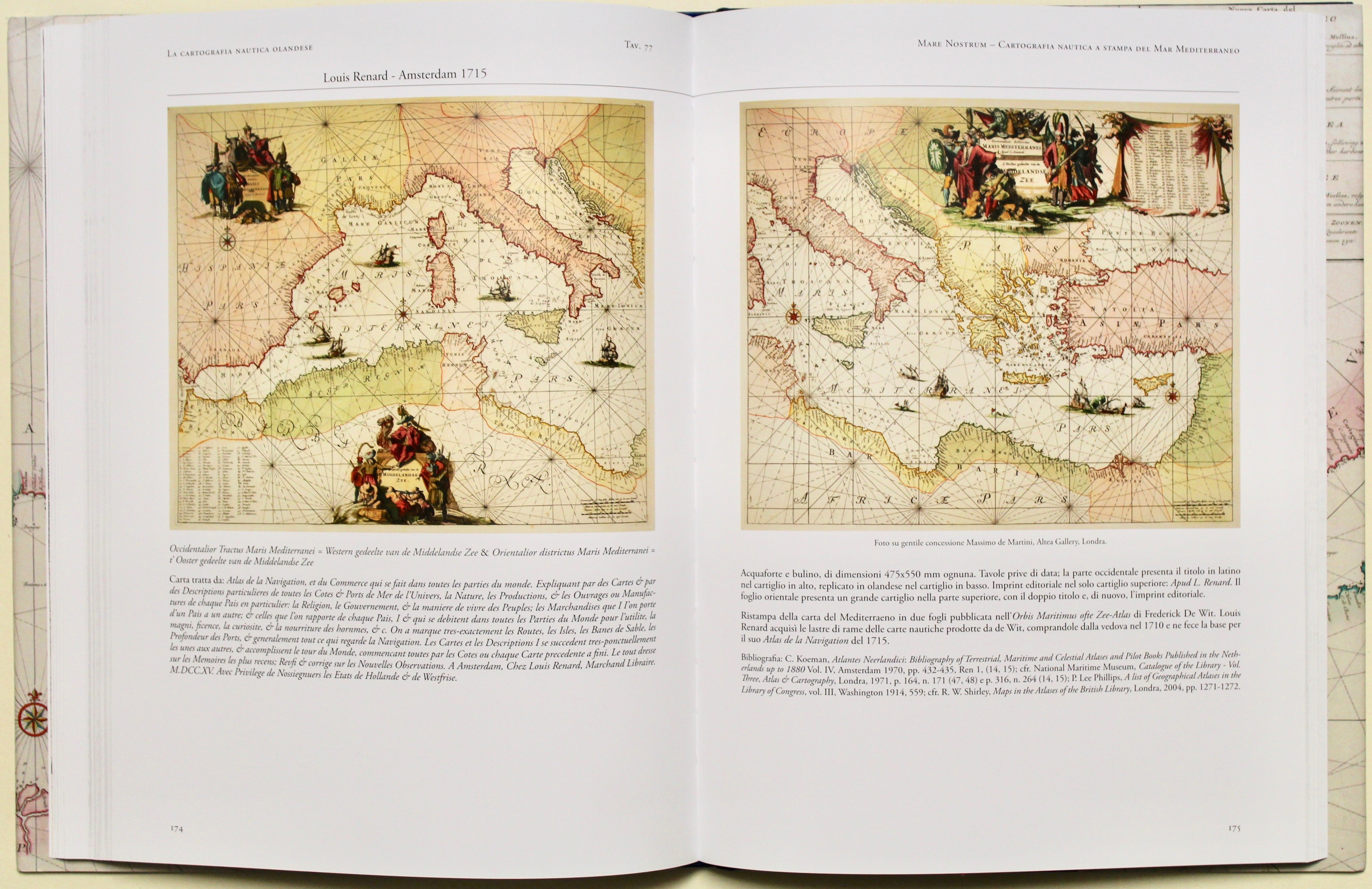 Printed in 250 copies. 304 pagine stampate a colori su carta R4 Next Satin 150 g delle Cartiere Burgo, formato cm 32x24, copertina rigida con sovraccoperta. La cartografia nautica del Mediterraneo è un argomento estremamente affascinante, ma al contempo complesso. Affonda le sue radici nel XIII sec., epoca a cui risalgono le prime carte manoscritte del bacino mediterraneo, le cosiddette carte-portolano la cui origine è tuttora misteriosa: sorprendentemente originali e accurate, segnano una rottura completa con la tradizione delle mappaemundi, le cosmografie medievali.Del resto, la carta nautica aveva anzitutto una funzione pratica, quella di strumento per la navigazione, accanto alla quale progressivamente si svilupparono funzioni secondarie, quali quella informativa-geografica, didattica e, non ultima, quella decorativa. I primi documenti manoscritti sono di fattura italiana, la Carta Pisana e Lo Compasso de Navigare, così come è italiana la prima opera nautica a stampa, L’Isolario di Bartolomeo dalli Sonetti, edito a Venezia nel 1485. Accanto ai centri italiani, erano attivi nella produzione di carte-portolano anche i Maiorchini e i Portoghesi. Con l’avvento della stampa, la carta manoscritta non fu abbandonata, anzi sopravvisse fino al XVII secolo. Italia, Olanda, Inghilterra e Francia furono i Paesi in cui la produzione a stampa, evidentemente legata ai commerci come anche alle esplorazioni, si sviluppò in maniera più consistente.Tanto per le carte manoscritte quanto per quelle a stampa esistono numerosi studi incentrati, però, o sui singoli centri o “scuole”, oppure su un periodo cronologico determinato. Manca, ad oggi, uno studio complessivo che ripercorra la storia della cartonautica a stampa attraverso i secoli. Di questa lacuna ho personalmente preso atto quando mi è stata sottoposta un’imponente collezione di circa cento splendide carte del bacino mediterraneo, pubblicate tra XVI e XVIII secolo.L’idea di questa pubblicazione, quindi, nasce dall’esigenza di fornire un catalogo e una visione complessiva della produzione cartografia nautica a stampa del Mediterraneo. Naturalmente, data la vastità dell’argomento, ho dovuto stabilire dei termini cronologici e, all’interno di questi, operare una selezione in merito all’area rappresentate sulle carte. Ho scelto, quindi, di inserire nel catalogo solo le carte generali, ovvero quelle che rappresentano l’intero bacino mediterraneo e non anche quelle parziali del Mar Adriatico, Mar Tirreno e Mar Egeo. È doveroso, però, precisare che alcune carte, soprattutto olandesi, sono spesso tagliate ad oriente. Il catalogo inizia quindi, con la carta di Benedetto Bordone del 1528 e termina con quella di Giovanni Fileti del 1802. In quest’arco temporale, 1528 - 1802, sono oltre 134 le carte a stampa che vengono qui esaminate e descritte.Il nucleo di partenza, la collezione menzionata, è stato così allargato per includere le carte note in uno o pochi esemplari, conservati nelle biblioteche e nei musei di tutto il mondo. Le opere esaminate sono state divise per “scuola” di produzione: a quella italiana segue la scuola olandese, poi quella inglese e, infine, la scuola francese. All’interno di ogni scuola, le carte sono presentate in ordine cronologico e non per modello cartografico, come inizialmente ipotizzato, soprattutto per le carte olandesi, che costituiscono il corpus principale del catalogo.Per ogni carta viene fornita una descrizione fisica con l’indicazione – ove note – dei diversi stati e edizioni; una nota biografica dell’incisore, dell’editore o di entrambe le figure, e – ove trattasi di carte pubblicate in atlanti o guide nautiche, un riferimento all’opera generale che la contiene.