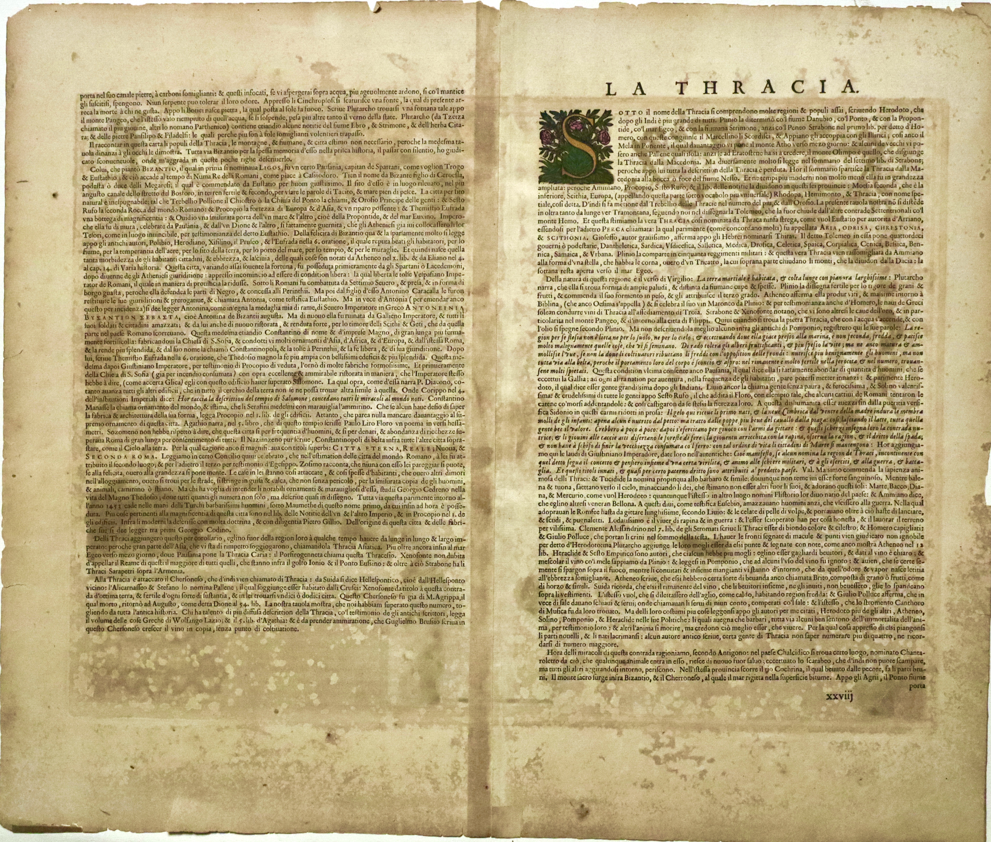 Copper engraving, hand-painted, period, 360 x 840 mm. A highly decorative map of ancient Thrace, that is, the territories of northern Greece and modern Bulgaria, belonging to the historical section of the "Theatrum Orbis Terrarum," the first modern atlas, including maps of all the regions of the world. The brilliant intuition of Ortels, later Latinized, was to bring together the heterogeneous cartographic production of the period into a single corpus, forming the basis for a hugely successful publishing enterprise, published from 1570 to 1612. Before then, in fact, cartographic production had been irregular, local in scale, and the few atlases, the so-called "Lafrerian Atlases," were created on request by collecting maps of some areas, ignoring others. A fine example on slightly browned paper. Traces of offset.
