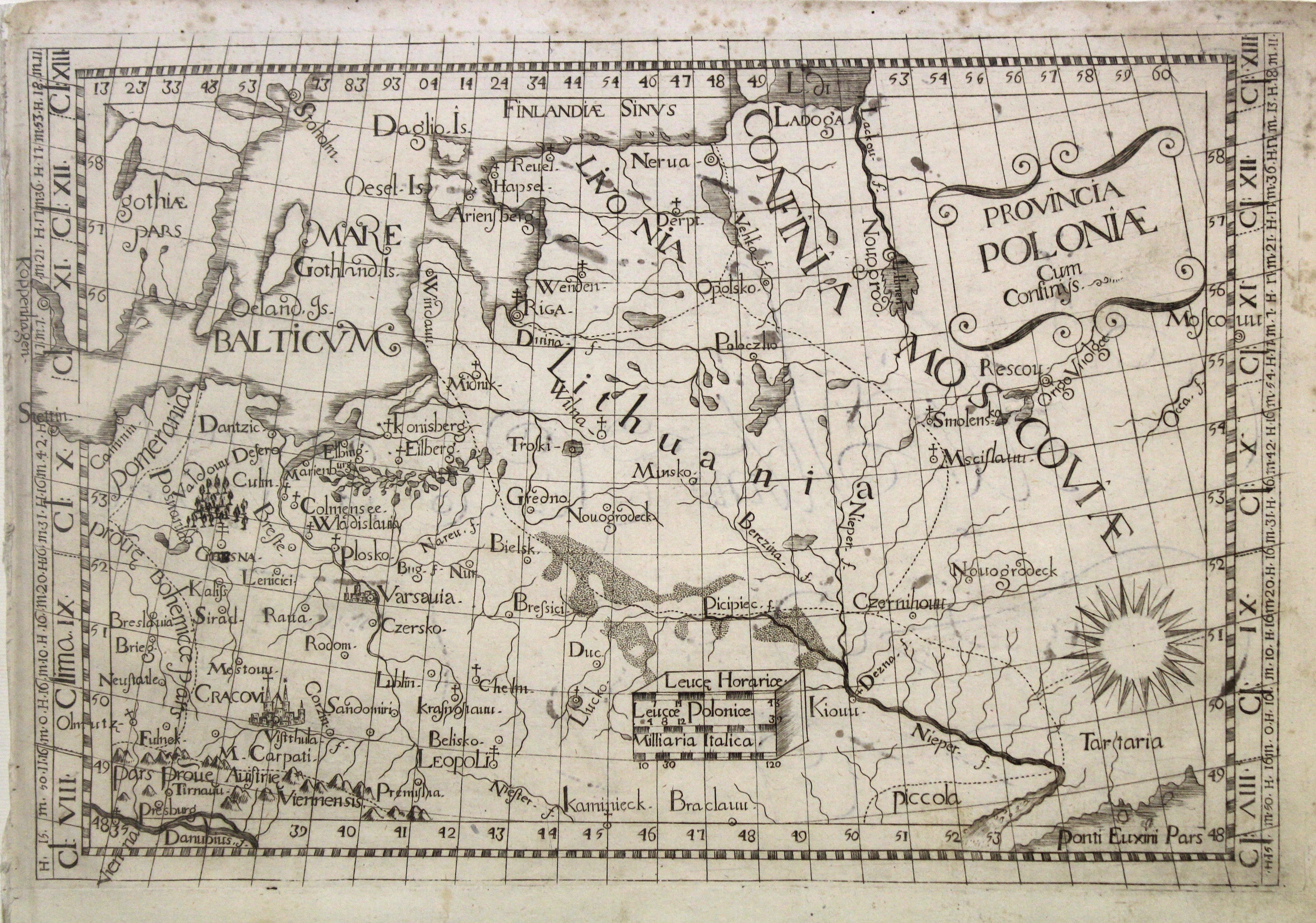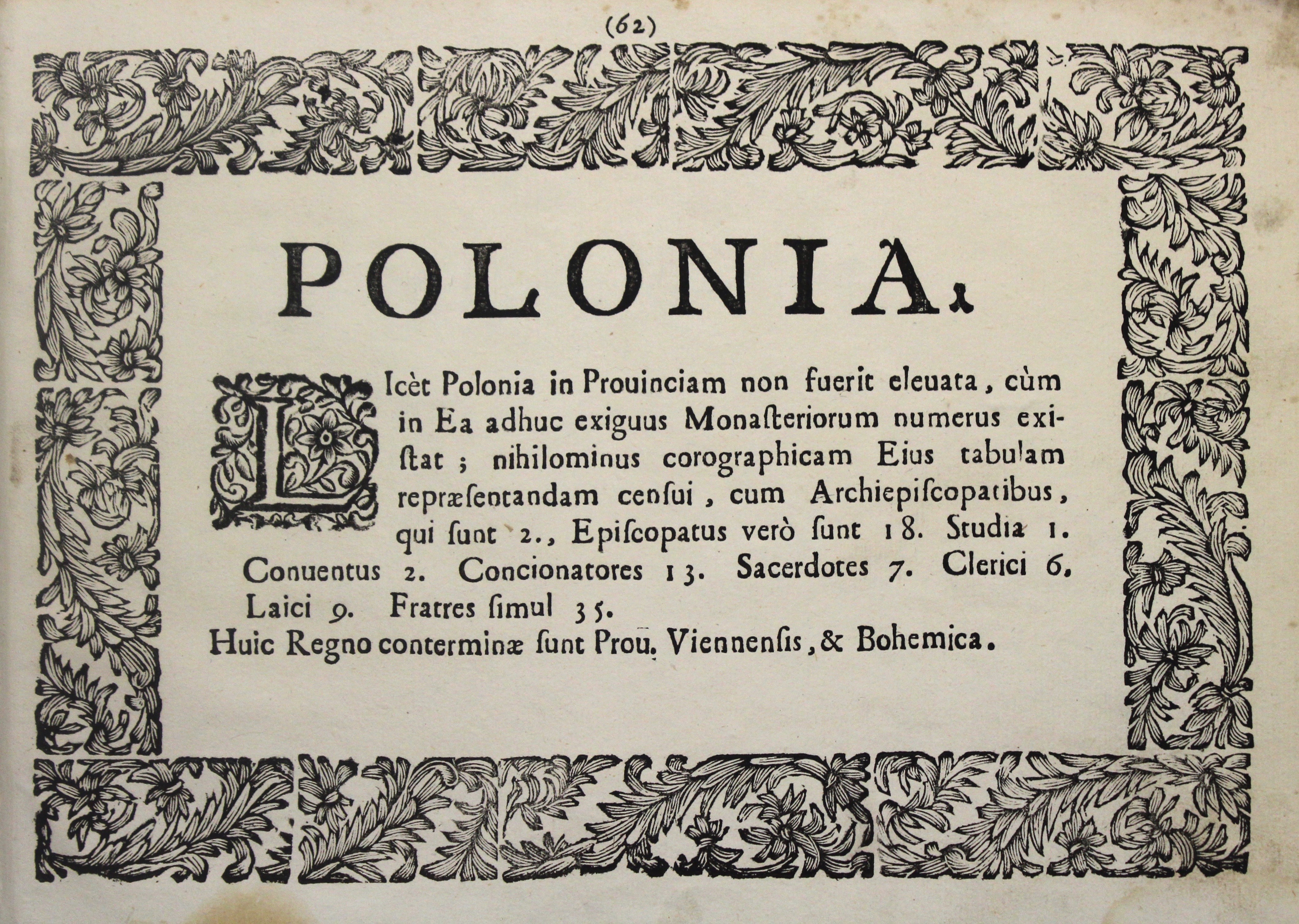Scarce finely engraved map of Poland, showing the Capuchin monasteries around the country, published in “Chorographica descriptio Provinciarum et Conventum minorum S. Francisci Capucinorum” first published in 1643 in Turin by Jahannes a Montecalerio and republished and updated by Giovanni Battista da Cassino. Mm 220x330