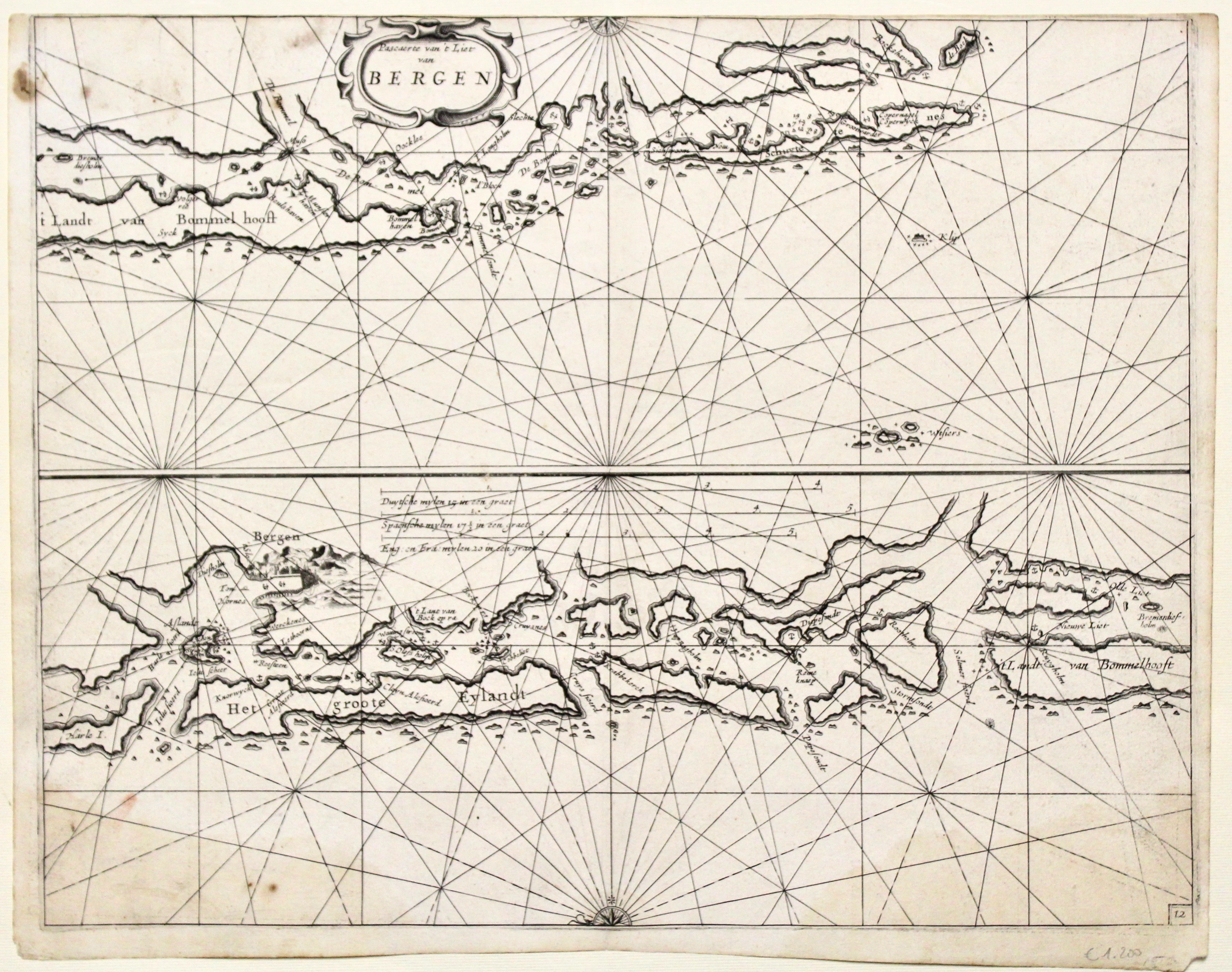 Copper engraving, mm 290x380 on a sheet mm 310x395. From the very rare atlas "t nieuwe en vergroote Zee-Boeck" Good example withthe upper margin trimmed on the late mark, some stains at bottom. Theunis (o Anthonie) Jacobs, nato nel 1606, fu il fondatore della dinastia di editori specializzati in carte nautiche. Dopo Jacob Colom fu il secondo a pubblicare un portolano illustrato nel 1644. Morì nel 1650 ma l'attività venne continuata dalla vedova e dai figli Caspar e Jacob finché fu ceduta nel 1711 dopo la morte di Caspar. Numerosi atlanti furono pubblicati dalla famiglia nella seconda metà del secolo. Koeman, Jac 59.