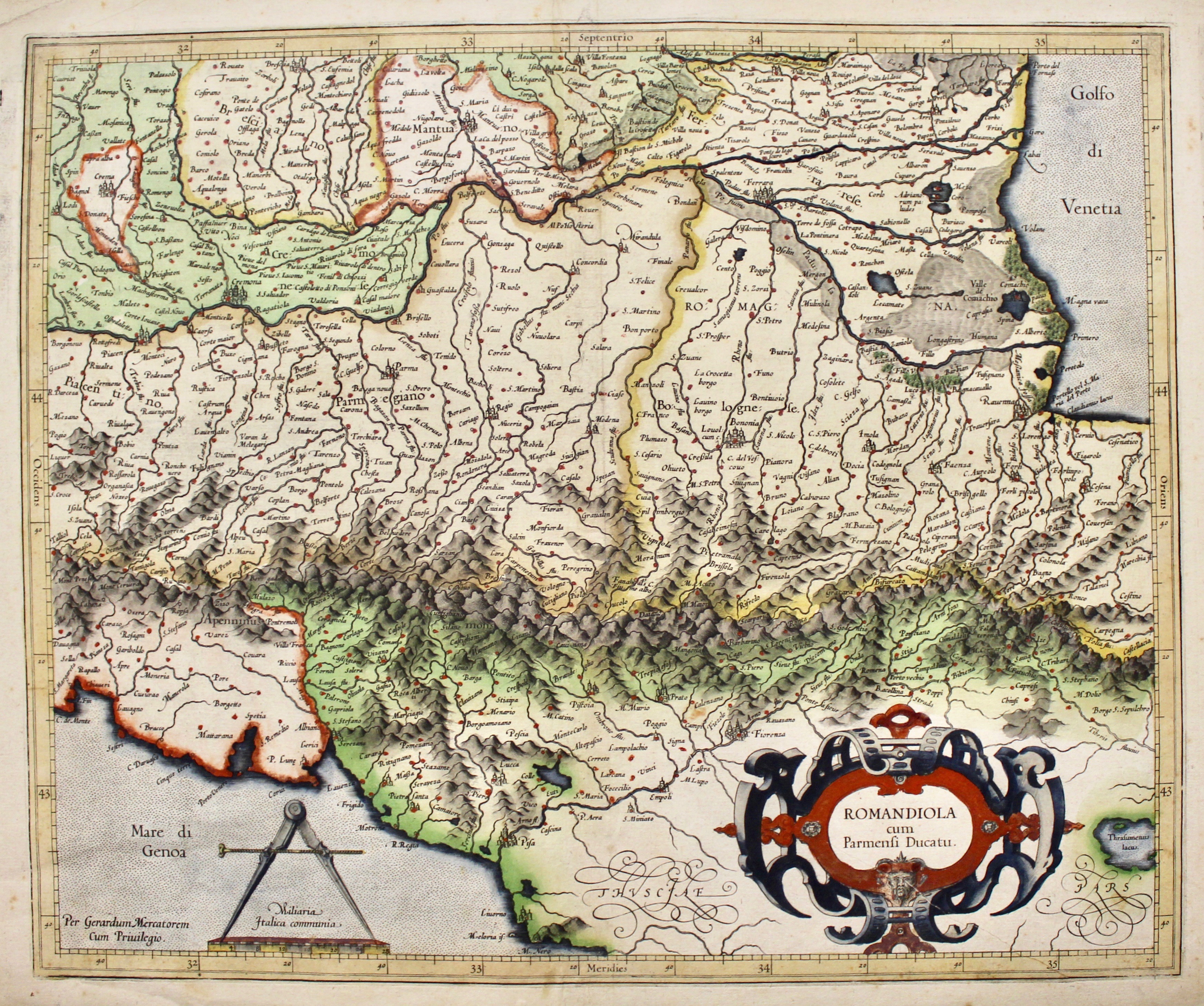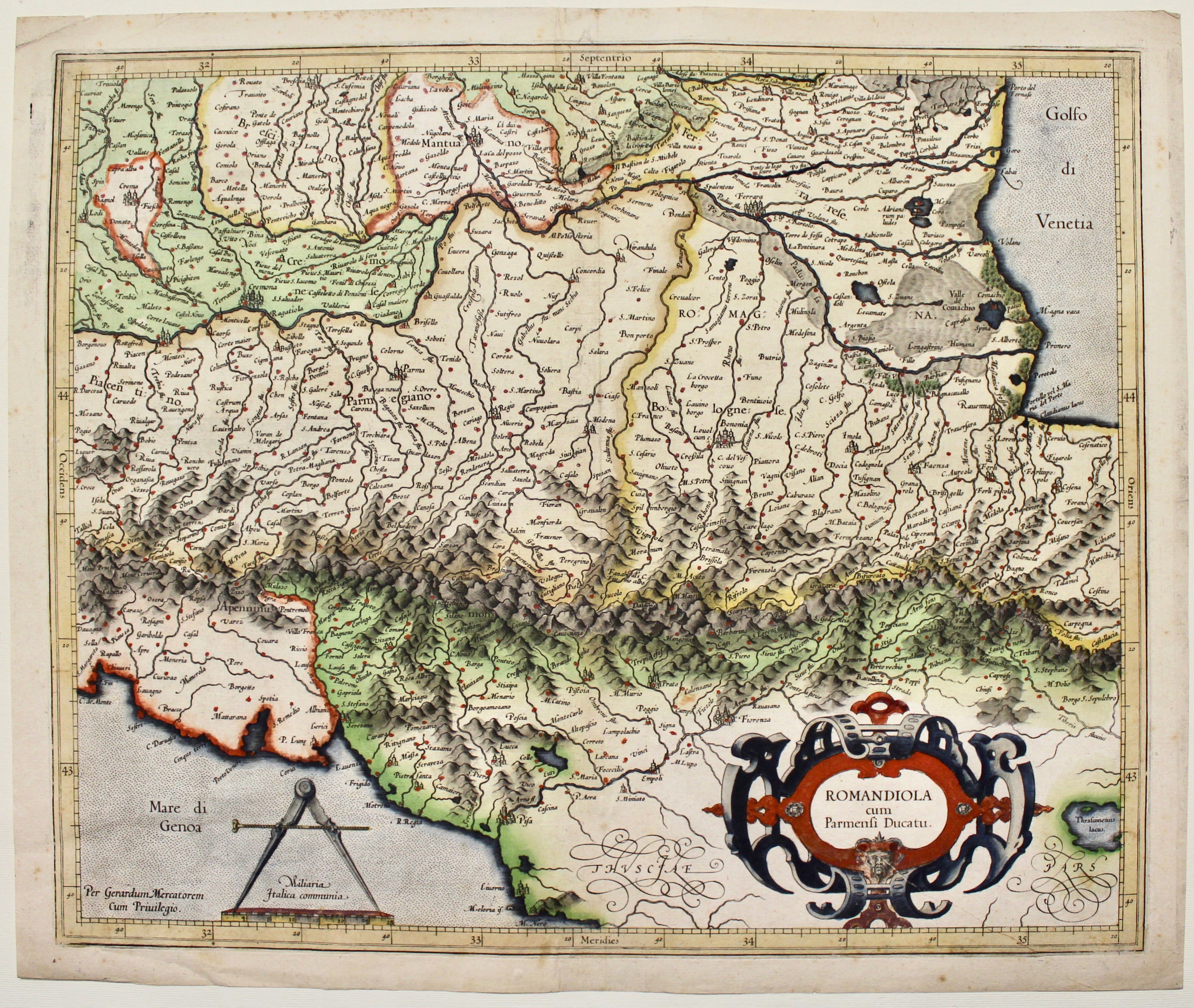 Incisione in rame, splendida coloritura coeva possibilmente in parte rinforzata, mm 340x460. Rara edizione cinquecentesca. La carta dell’Emilia di Mercator viene per la prima volta pubblicata a Duisburg nella seconda parte dell'atlant, dal titolo "Italia, Sclavoniae et Graeciae tabula geographicae" nel 1589. Successivamente viene ristampata spesso nelle edizioni di Hondius nel XVII secolo. Ottimo esemplare con una quasi invisibile pieghetta di stampa nel cartiglio, qualche pieghetta marginale, rinforzo al dorso alla piega centrale, margini un poco rifilati, essendo il testo verso troncato nelle estremità esterna. Koeman ME 35°.