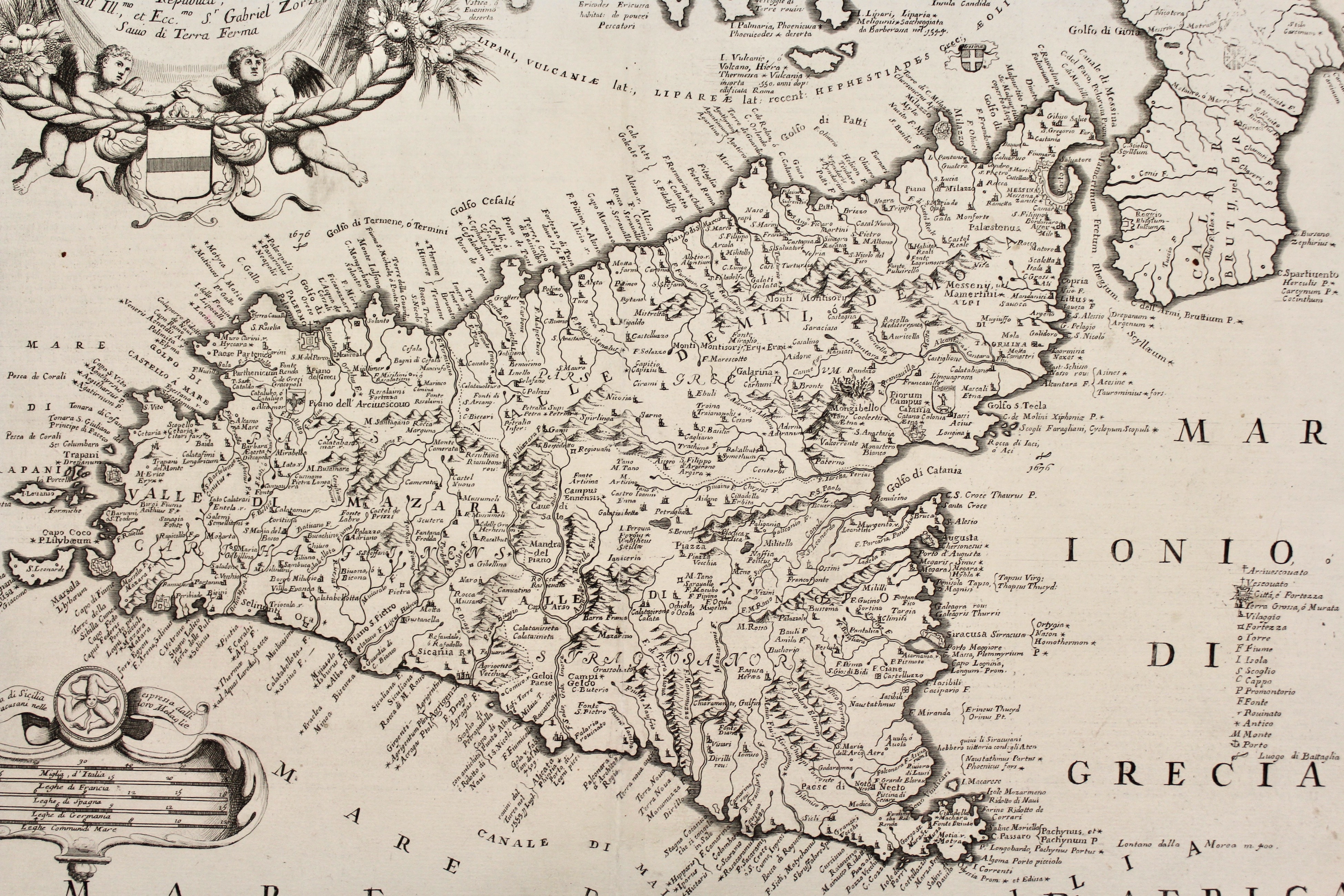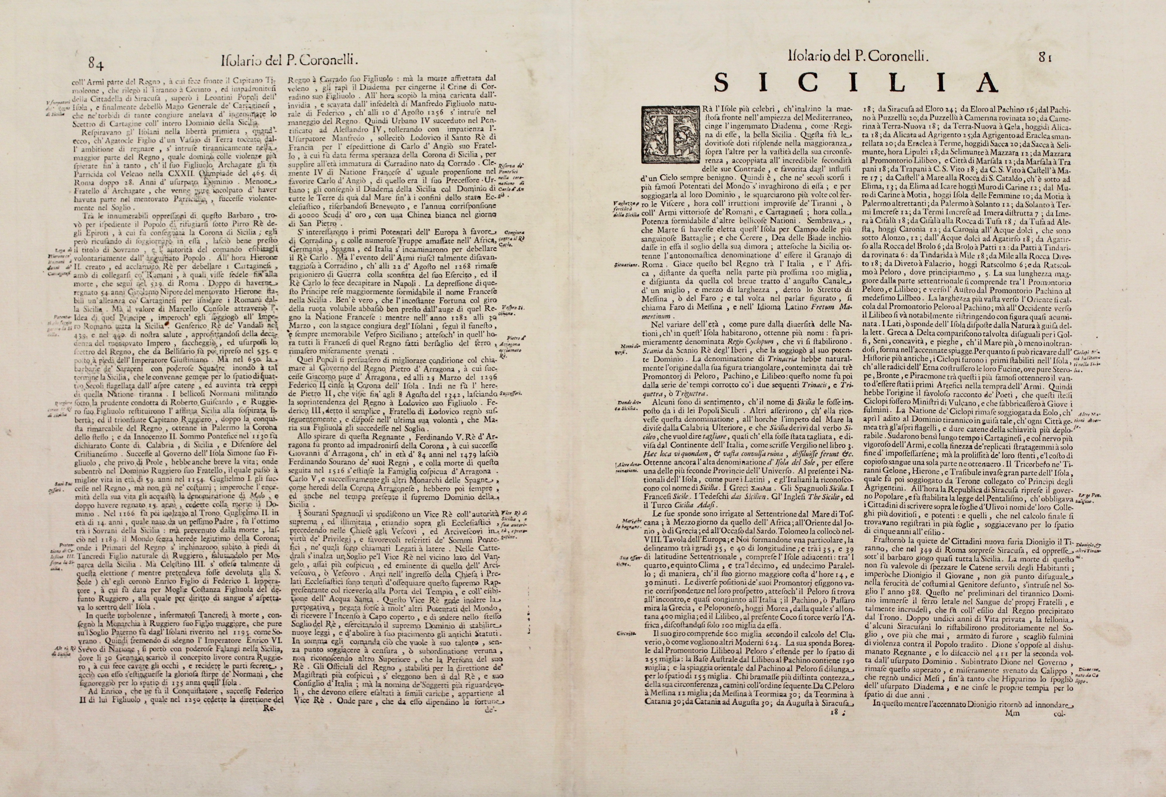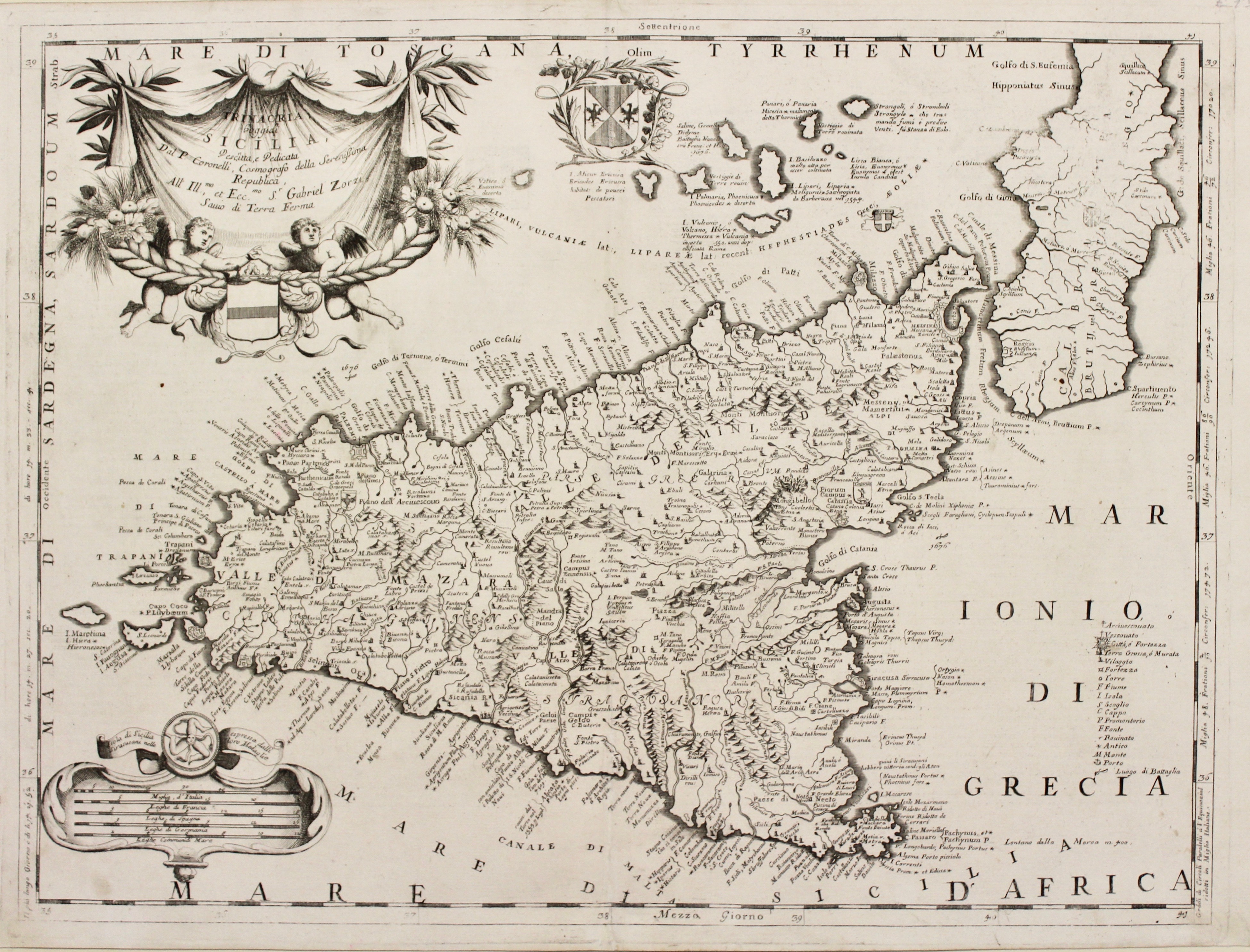 Copper engraving, mm 470x620. From “Isolario”. Decoratve map embellished by cartouches. Vincenzo Maria Coronelli was one of the most important and influential map makers of the late 17th Century. His maps are among the nicest and most decorative of their time. Good condition with minor restored defects at bottom central fold and two restorations in bottom margin.
