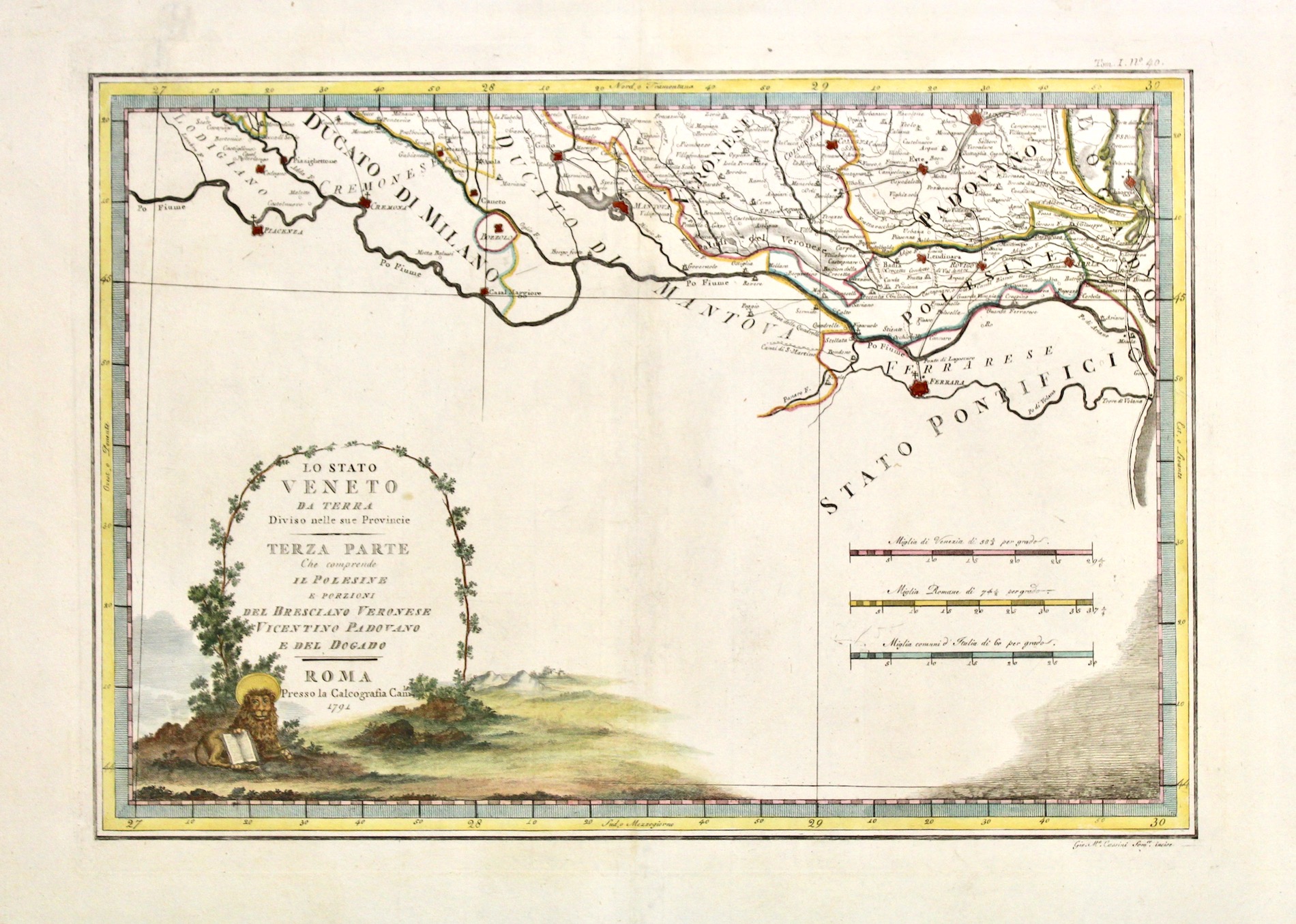 Incisione in rame dipinta a mano. 4 fogli, ognuno mm 354x485 ancora da unire, dei possedimenti veneti così divisi: “Prima parte che comprende il Bergamasco, il Cremasco, il Feltrino, il Bellunese e porzioni del Bresciano, Veronese, Vicentino, Padovano, Dogado Trevisano e Friuli”, il secondo foglio è sottotitolato “Seconda parte che comprende porzioni del Dogado del Trevisano, del Friuli e dell’Istria”, il terzo foglio “Terza parte che comprende il Polesine e porzioni del Bresciano, Veronese, Vicentino, Padovano e del Dogado”, il quarto “Quarta parte che comprende porzioni del Dogado e dell’Istria”.