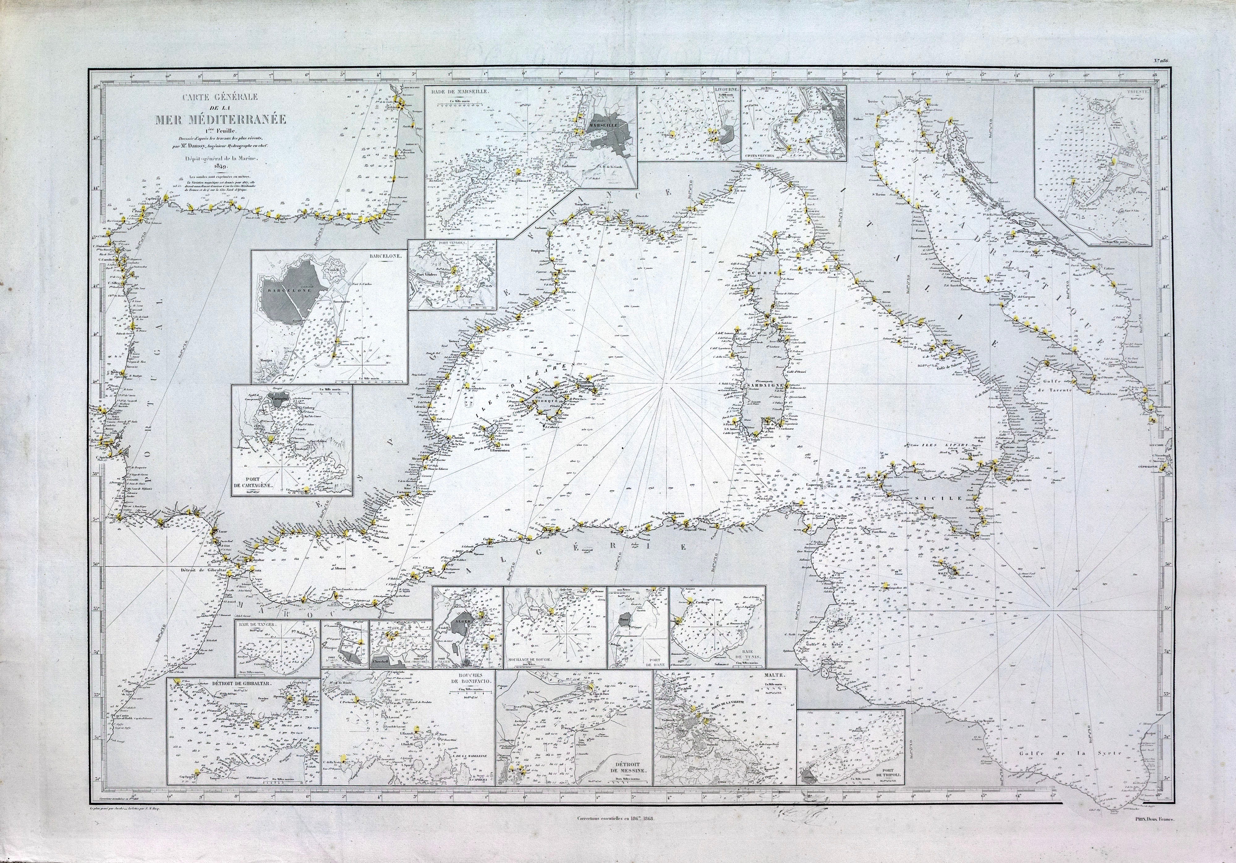 Incisione in rame, due grandi fogli mm 600x900 e 600x920 incisi da Jacobs. Insieme costituiscono l’intero bacino del Mediterraneo e del Mar Nero. In 19 riquadri di varia dimensione nel foglio ovest e 16 nel foglio est sono raffigurati i maggiori porti, stretti e golfi fra cui Gibilterra, Barcellona, Marsiglia, Stretto di Messina, Valletta, Bonifacio, Trieste, Corfù, Rodi, Costantinopoli, Smirne, Sebastopoli, Odessa, Alessandria, Tripoli. Perfettamente conservato e a pieni margini, eccettuati piccoli strappi ai margini stessi.