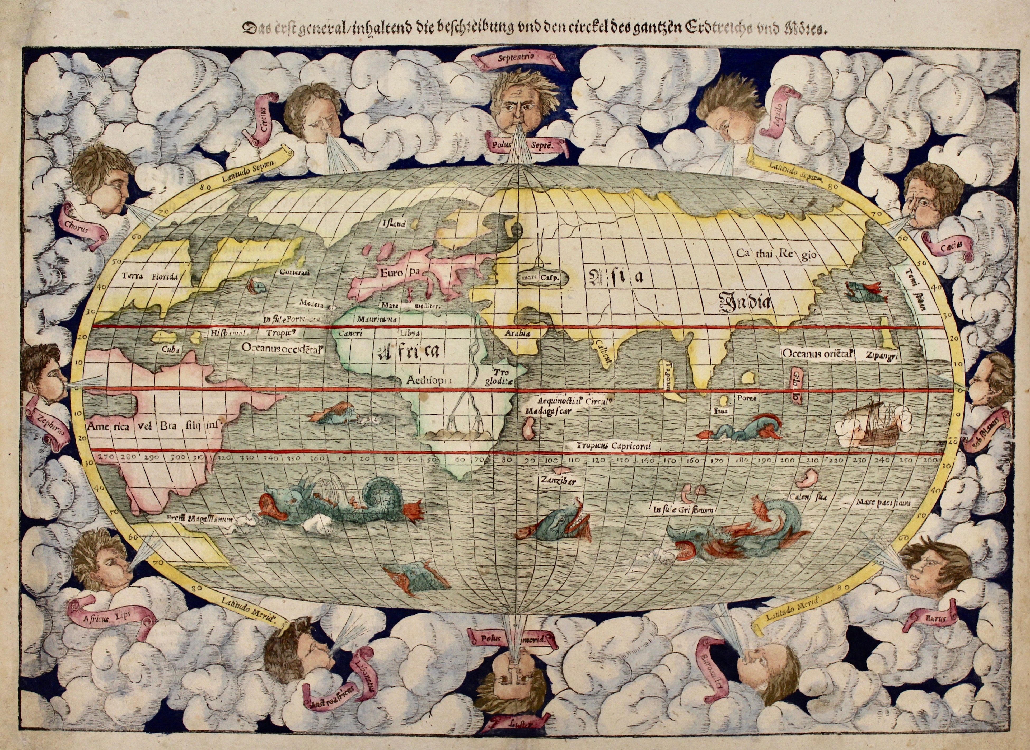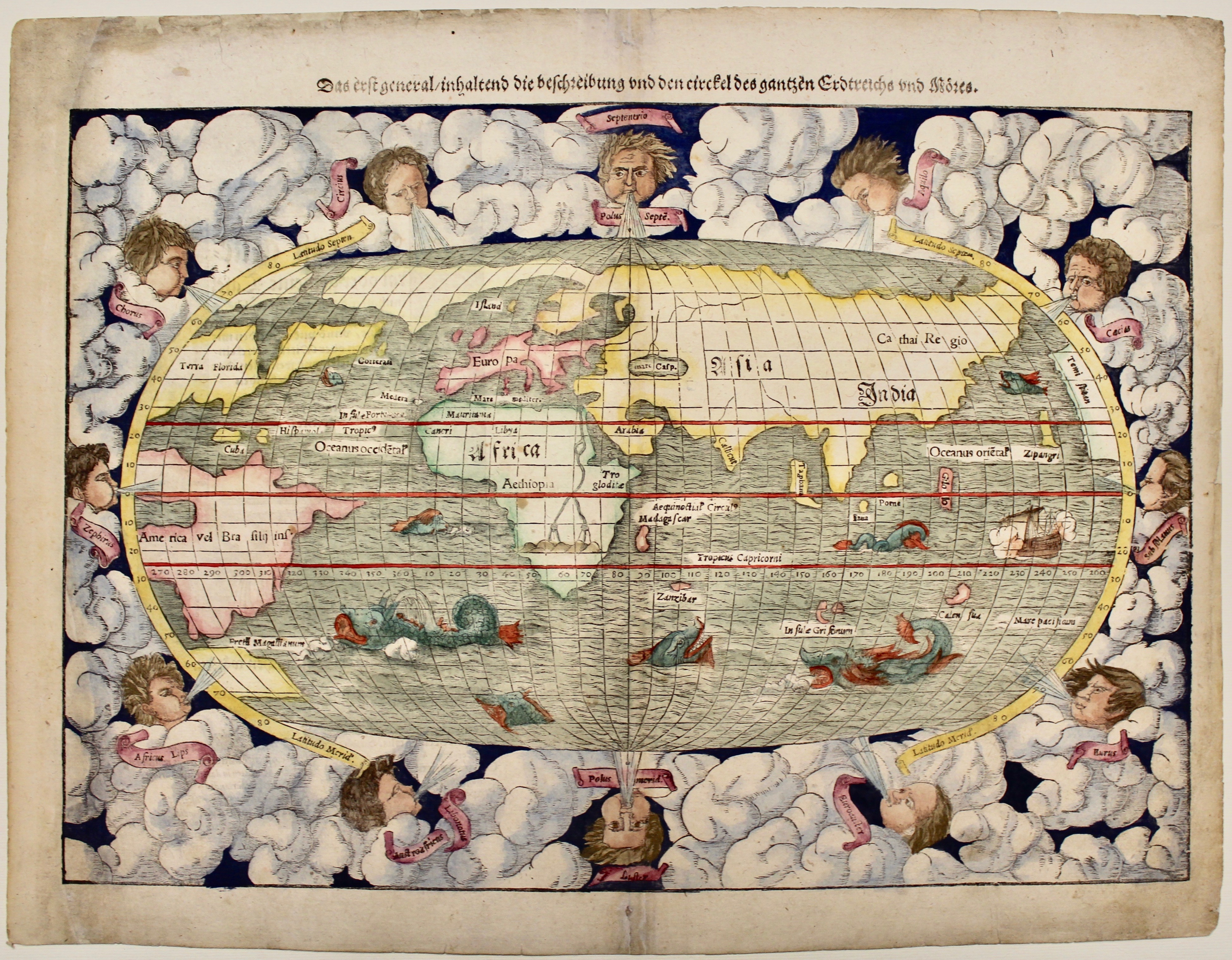 The map is oval in form and surrounded by elaborate vine and leave engraving. German text appears above and below the map proper describing the lands contained. The verso contains German text describing the earth. The title appears over the map in German text of a Gothic ethic. Very good condition apart two insignificant tiny worm holes and some light paper oxidation. Shirley, The mapping of the world, 92.