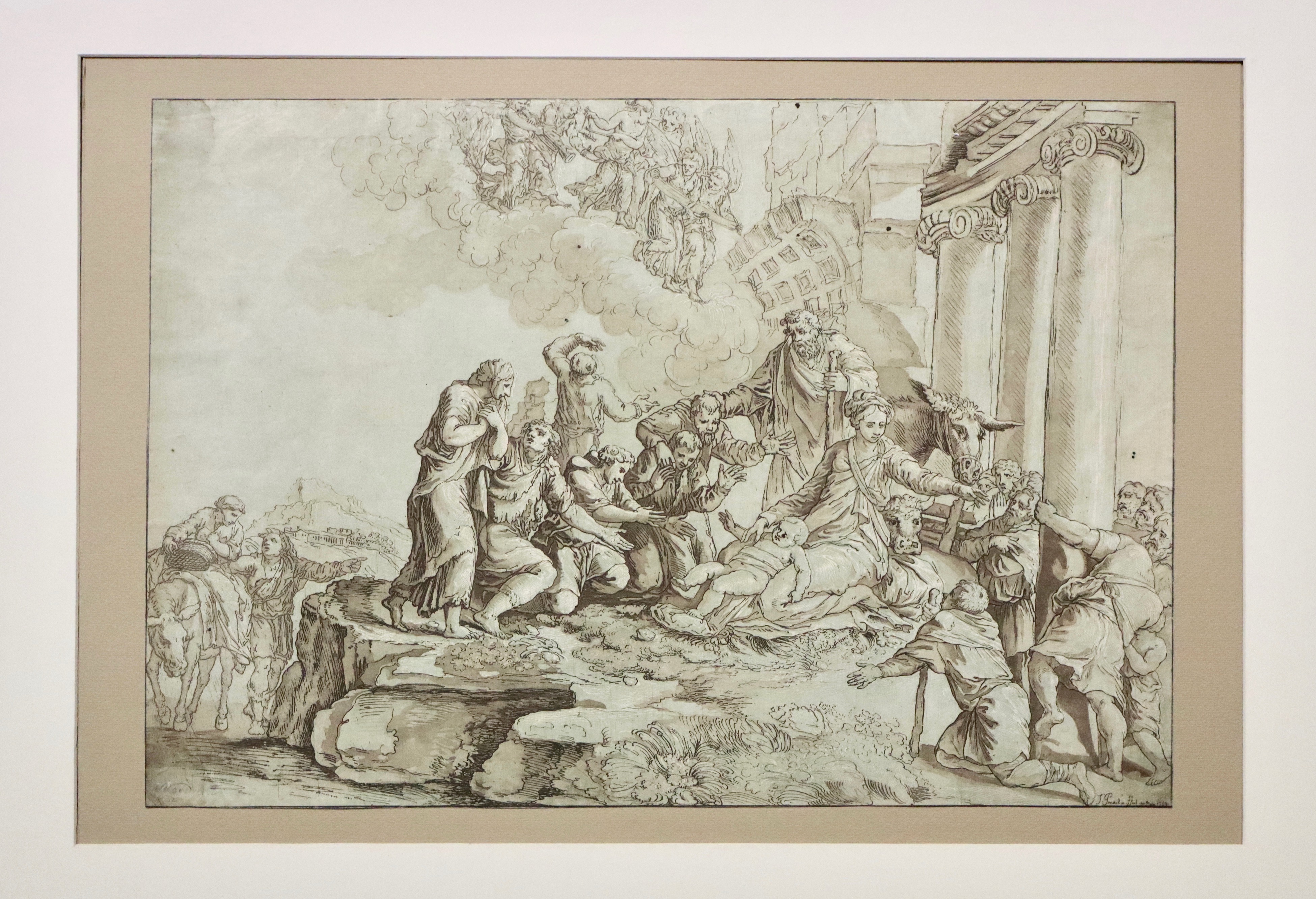 Etching and aquatint in sepia, 320x460 mm. At the bottom right of the plate is the inscription J. Prestel sc. FFort am main; this is the thirty-second plate from Dessins des meilleurs peintres d'Italie, d'Allemagne et des Pays-Bas tirés de divers célèbres cabinets, a series edited by Heinrich Sebastian Hüsgen. A good example, although trimmed to the frame line.The episode of the adoration of the shepherds, here placed in a circle around the Holy Family, who rushed to Bethlehem after the announcement of the angels, placed in the engraving in the central area of the sky, is narrated in the Gospel of Luke. The archaeological ruins, a frequent element in Italian iconography of the Nativity, provide the backdrop. Here we see a row of columns, modeled on Greek temples. The unusual architectural structure symbolizes the overcoming of paganism and the construction of the Christian church, of which the birth of Jesus is the first act of foundation.