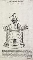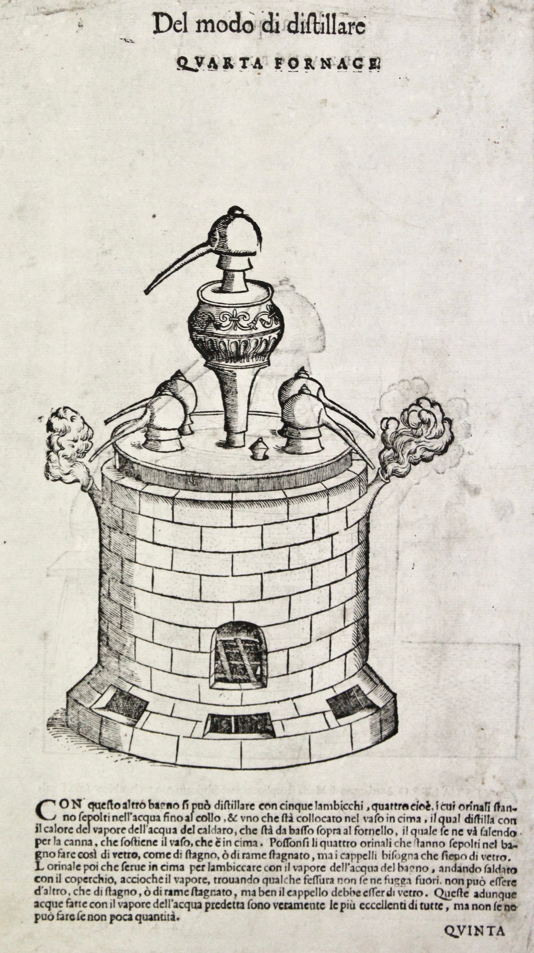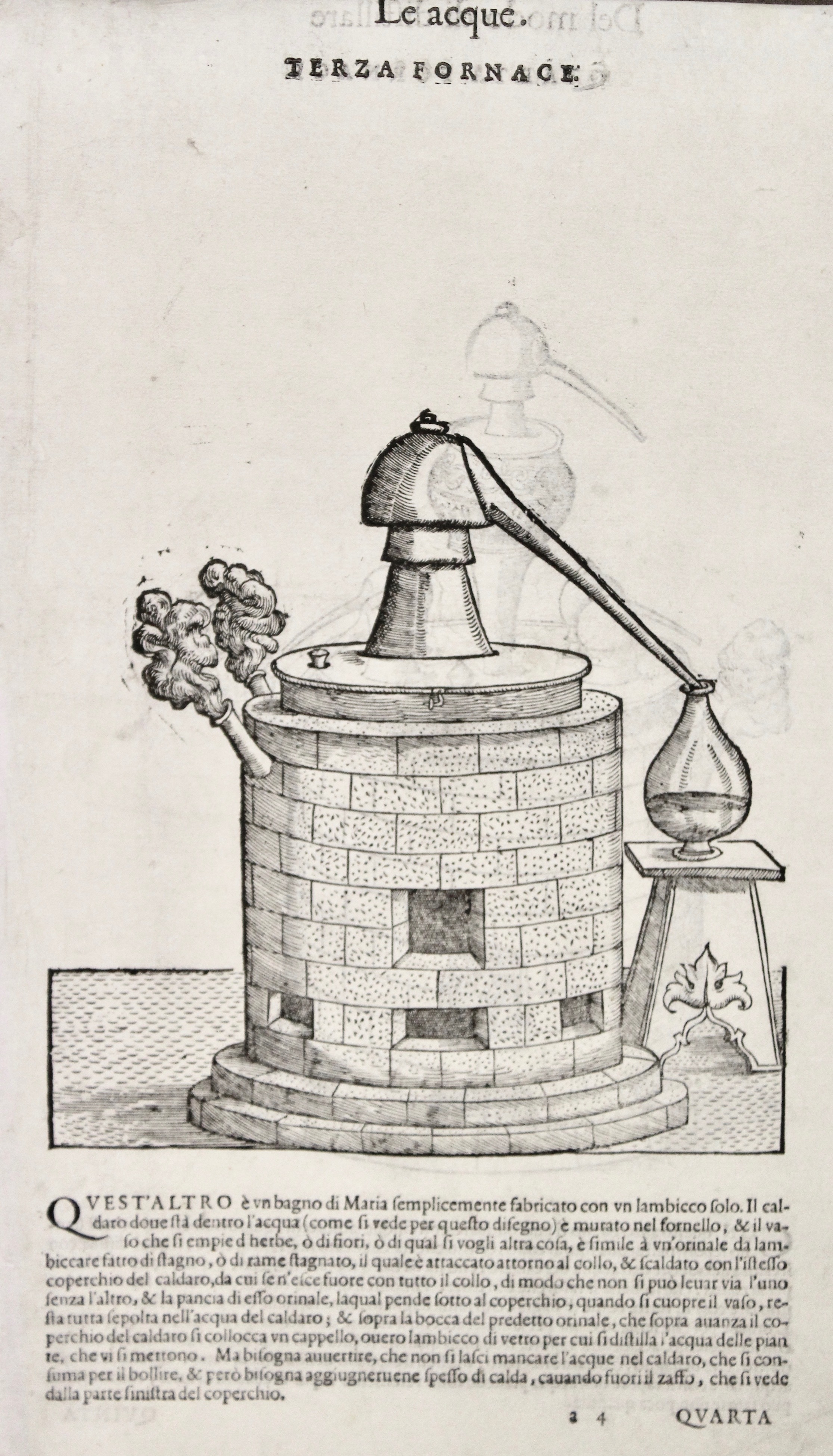 Silografia, mm 160x160 c. (solo la parte incisa). Tratta da “Del modo di distillare le acque” supplemento a “ I discorsi ne i sei libri della materia medicinale…” un commento all’opera del medico greco Dioscoride. Le piacevoli tavole sono apprezzate per il fascino derivante dall’ingenuità dell’incisione silografica ed il testo che interrompe esteticamente l’unità della pagina.Defects and marginal restorations