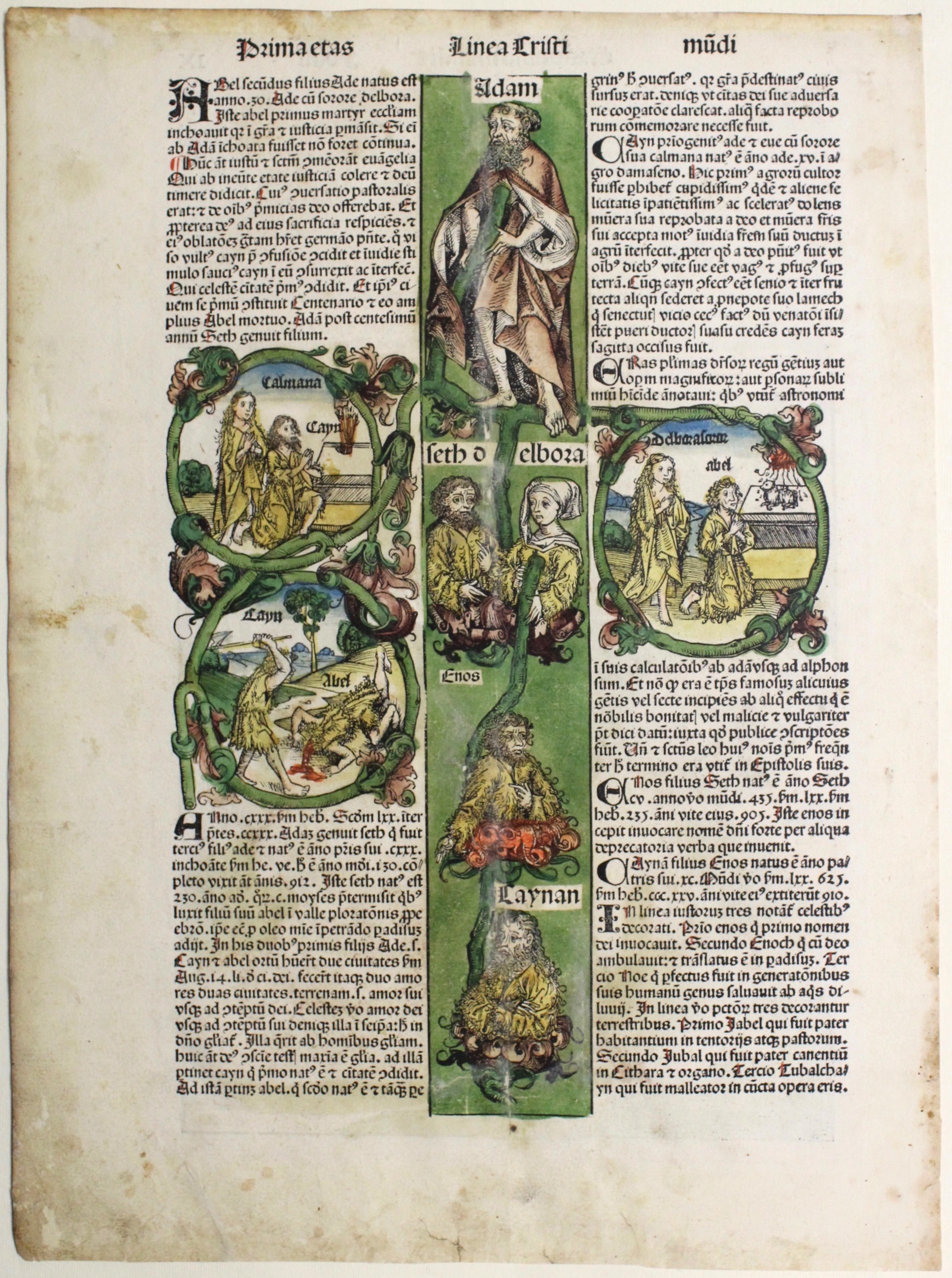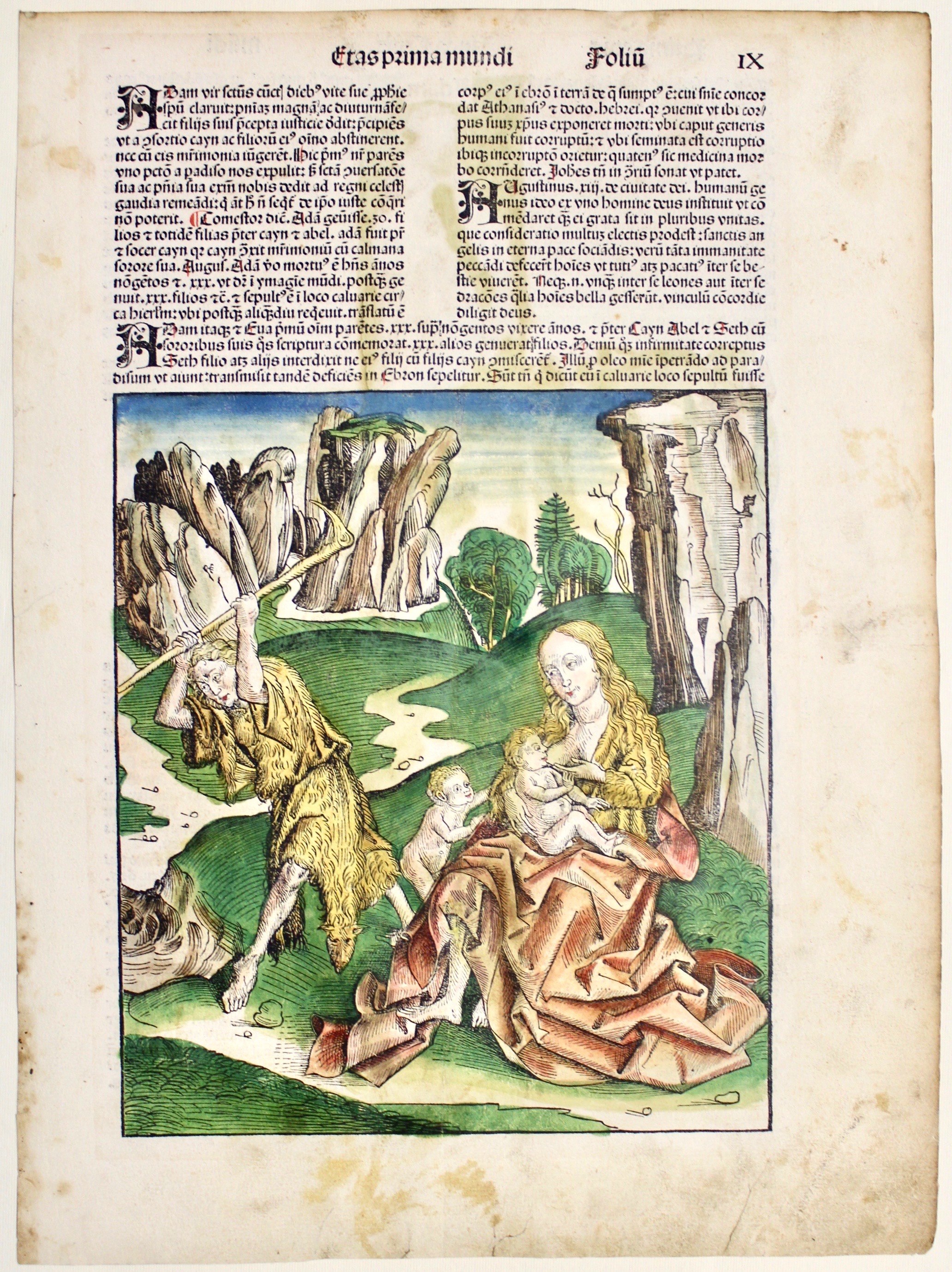 woodcut, mm 255x220, original colour by hand; shows Eve nursing Kain and Abel driven out of the Garden of Eden. Adam dressed in animal skin is hard working the soil. On verso a genealogy of Adam.