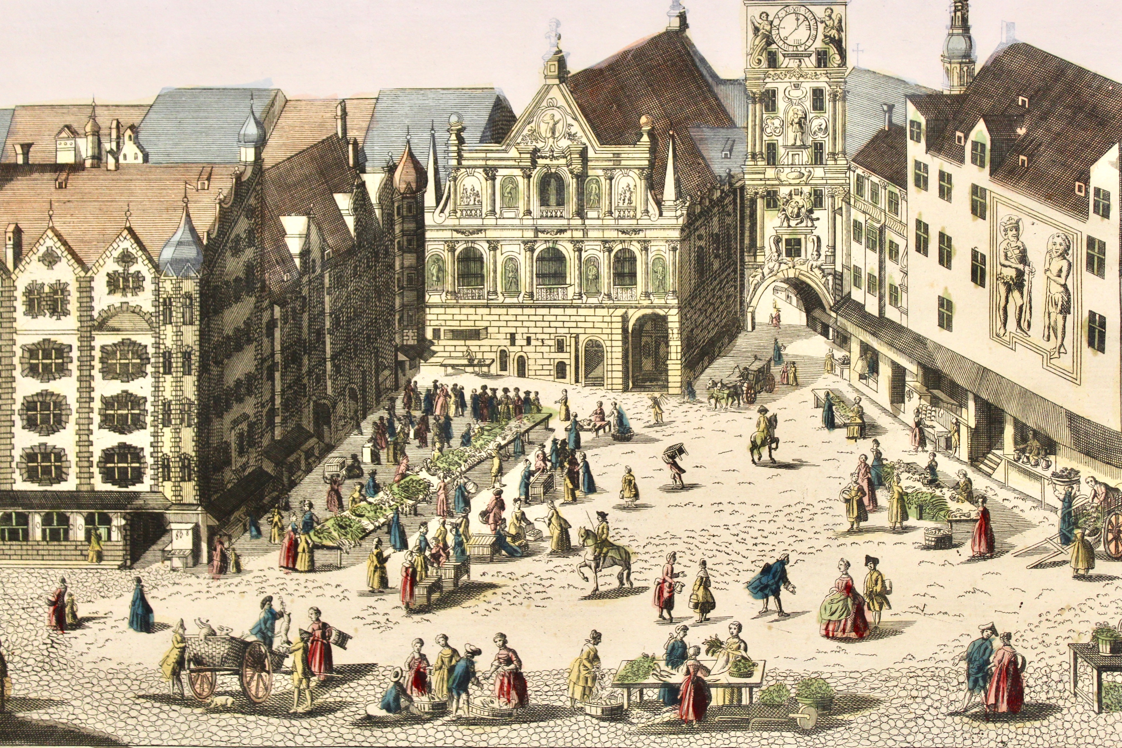 Copper engraving, mm 280x410, original color. Fascinating view of herbs square. The prints by Remondini fully represent italian popular printing history; they are simply engraved, mostly in contemporary hand color they have been object of many exhibitions, books and studies. The views were prepared for being shown in the Mondo Nuovo, inluminated by candles, during markets and fairs. Very good condition with fair margins. With manuscript number 154 in top right corner, small glue stain visible from verso