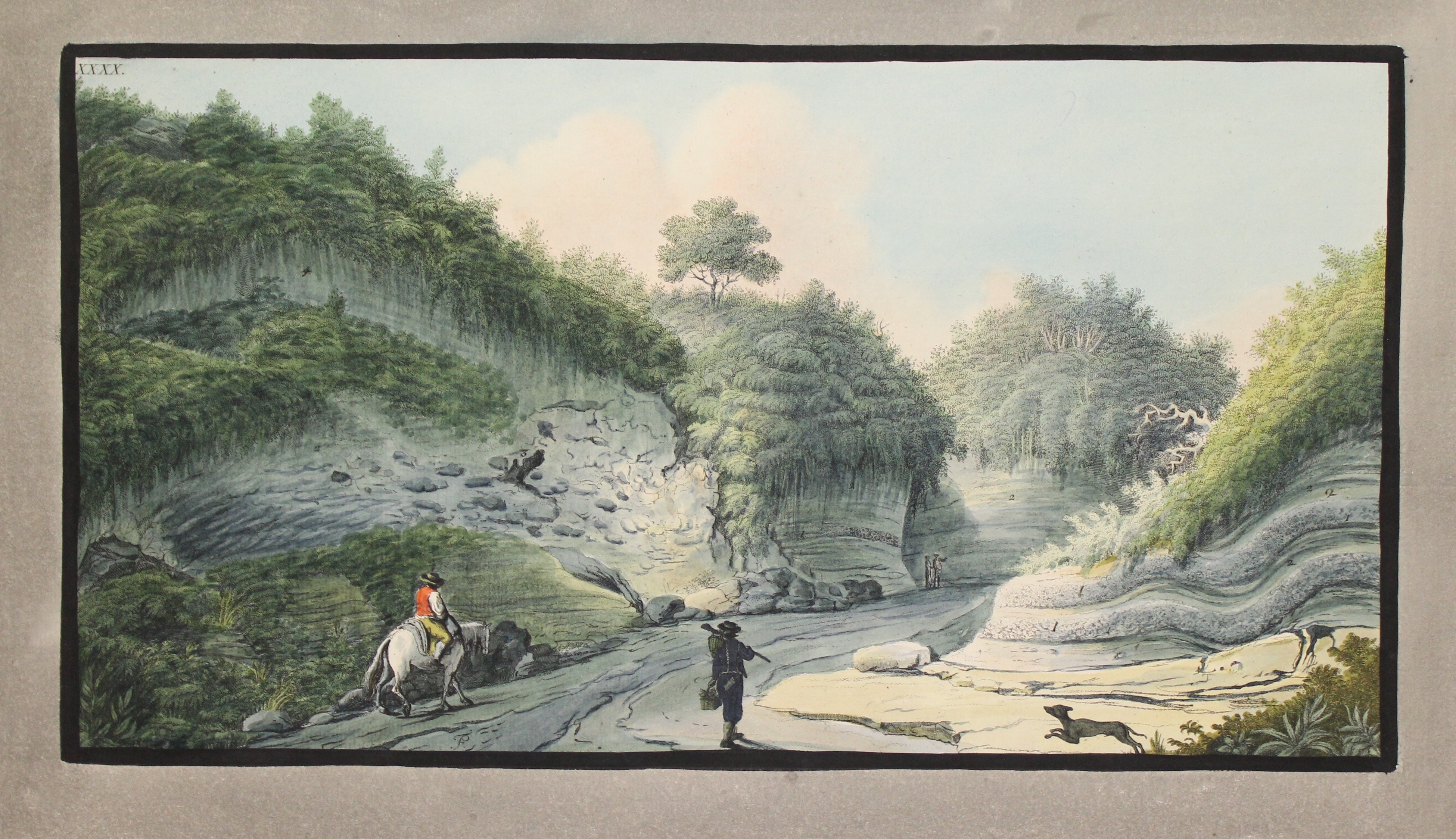 Copper engraving, sheet: mm 330x460, plate mark: mm 215x395. original hand colour. Very good condition. From: HAMILTON WILLIAM. Naples, Pietro Fabris, 1776-1779. Campi phlegraei. Observations on the volcanos of the two Sicilies… Supplement to the Campi Phlegraei being an account to the grat eruption of the mount Vesuvius in the month of August 1779… L’opera costituisce un caso unico nella storia del libro illustrato settecentesco, in quanto riunisce un testo di grande interesse scientifico a una serie di 54 tavole di grande valore artistico disegnate dal vero, eseguite all’acquaforte su lastra di rame e dipinte all’acquerello dal grande vedutista Pietro Fabris (attivo tra 1763 e 1779). Il trattato, fu pubblicato nel 1776 con testo francese e inglese e fu indirizzato alla Royal Society di Londra. L’autore, Sir William Hamilton (1730-1803), fu a Napoli tra il 1764 e il 1800 come ambasciatore d’Inghilterra; durante tale permanenza poté raccogliere molto materiale relativo alla vulcanologia, in particolar modo riguardante il Vesuvio e i Campi Flegrei, ma anche riguardanti l’Etna e altre località siciliane. Di Fabris invece non si sa molto, ma, di certo, con le tavole dei Campi Phlegarei si pose a modello per le vedute al guazzo di tutti i maestri napoletani successivi, da Alessandro D’Anna a Saverio Della Gatta. Le incisioni acquerellate del Fabris, in accordo con il gusto dell’epoca per l’alternanza di idillico e sublime, presentano scenari ameni e terribili eruzioni vulcaniche, ma anche campioni di minerali prelevati nelle varie località descritte da Hamilton, i quali vengono illustrati in maniera assolutamente realistica, pur mantendo sempre un alta qualità artistica. Gouaches napoletane…, cat. Della mostra, Napoli 1985, pagg. 224-225; G. Pane – V. Valerio, La città di Napoli tra vedutismo e cartografia…, cat. Della mostra, Napoli, 1988, pp. 309-311.