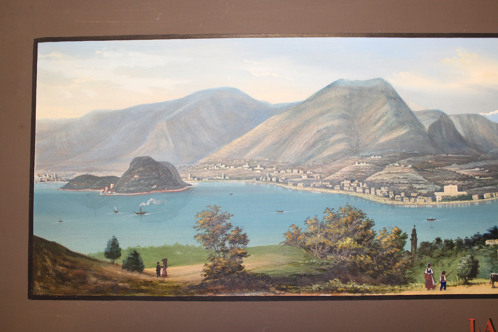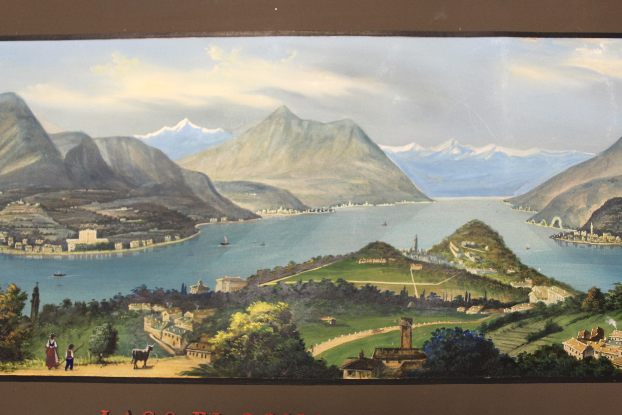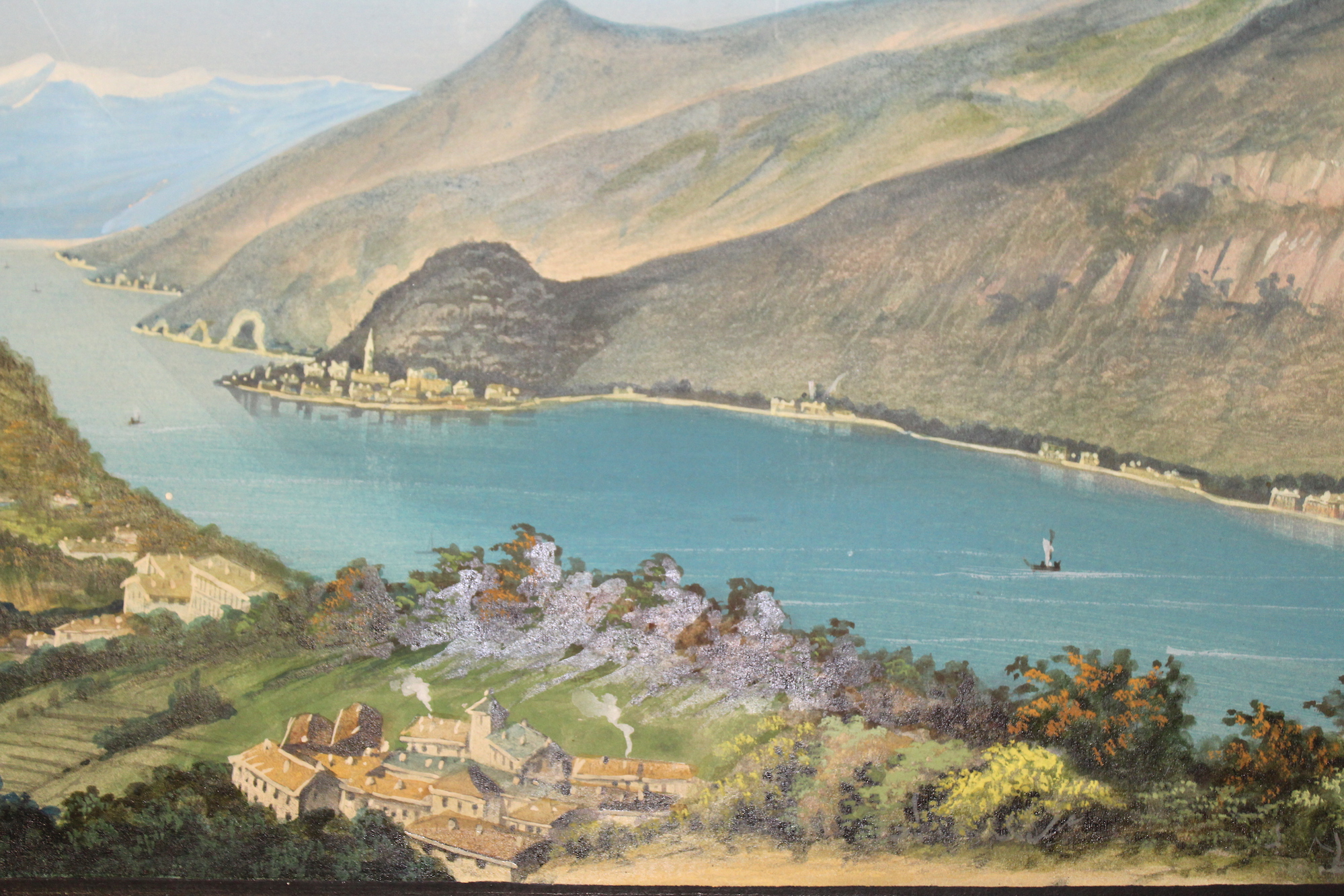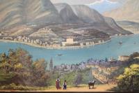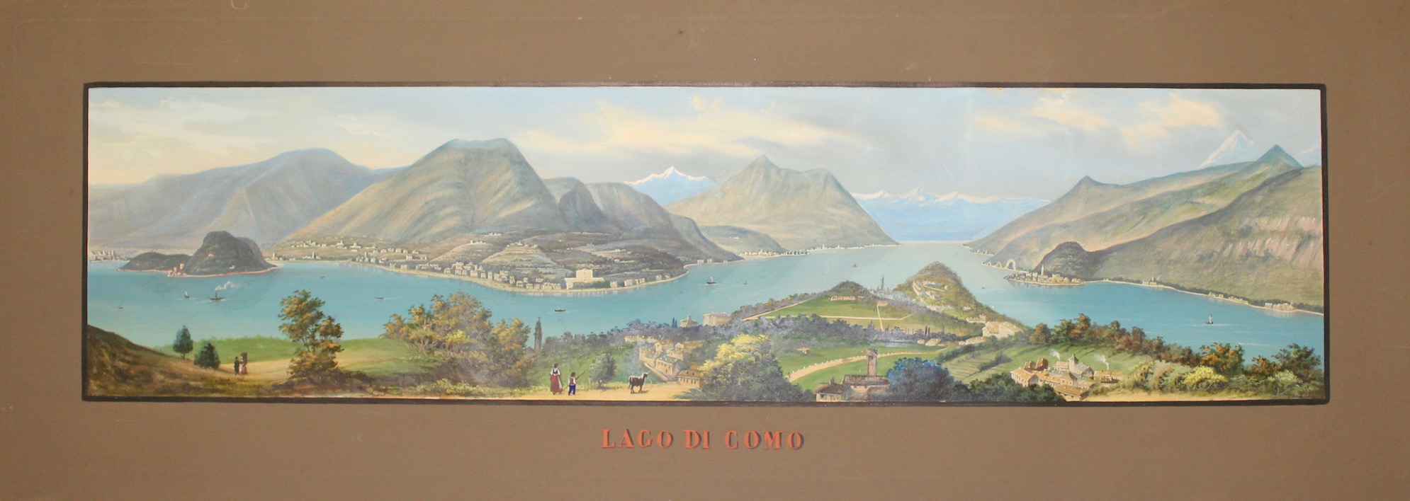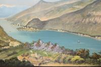 Aquatint, mm 225x880, original gouache colour. Splendid panoramic view of the central part of the lake taken from the hills over Bellagio. On the right Varenna. Very good condition