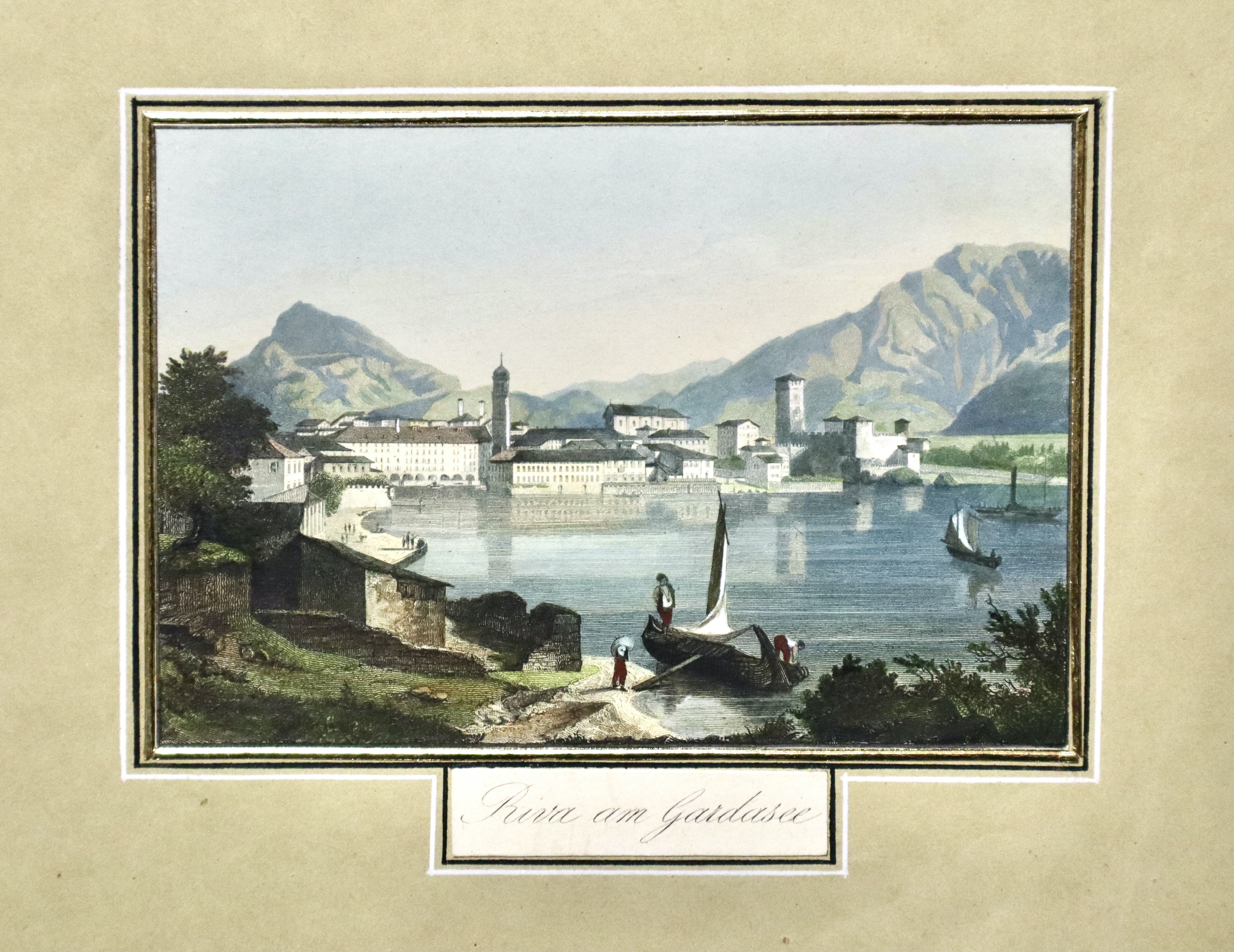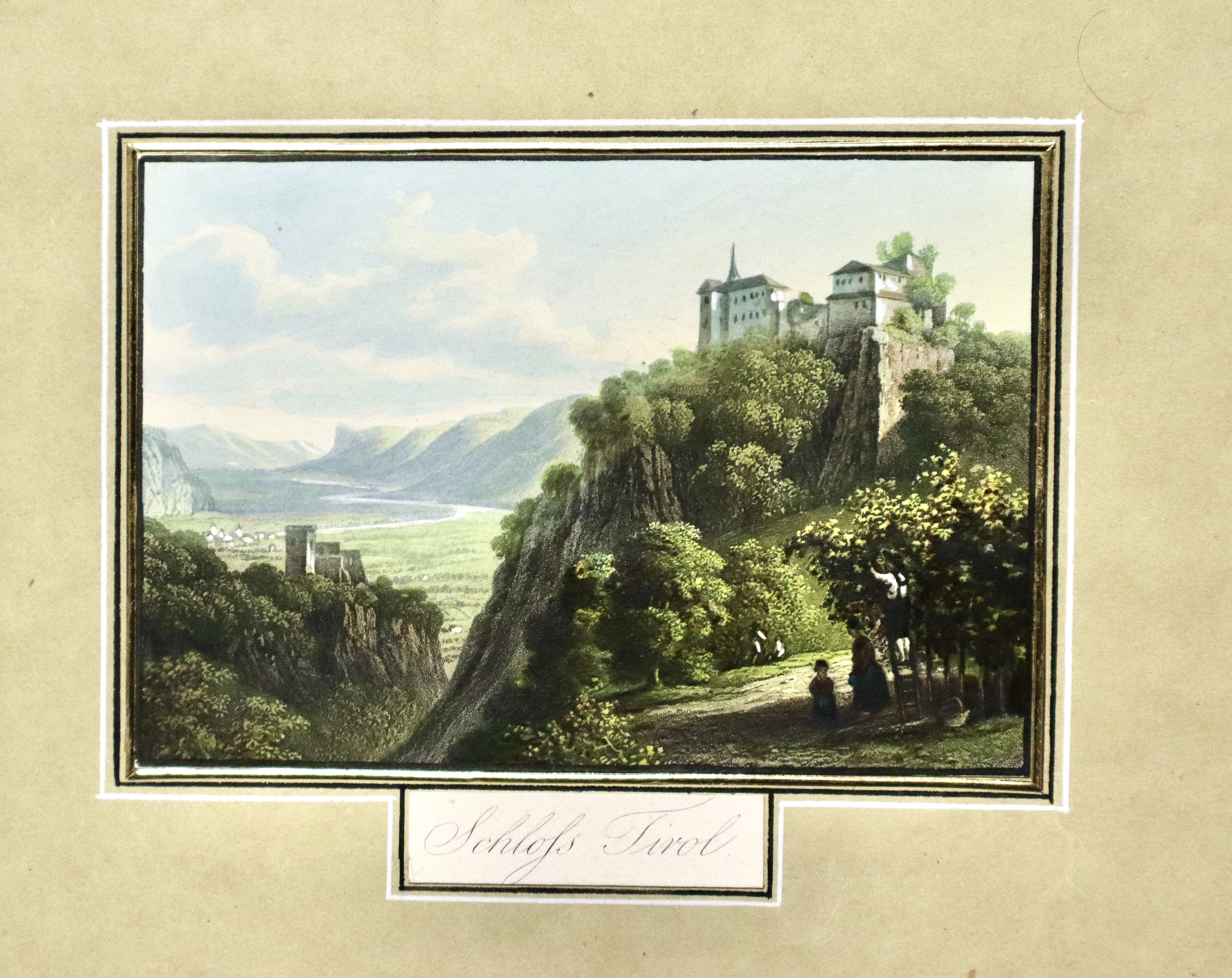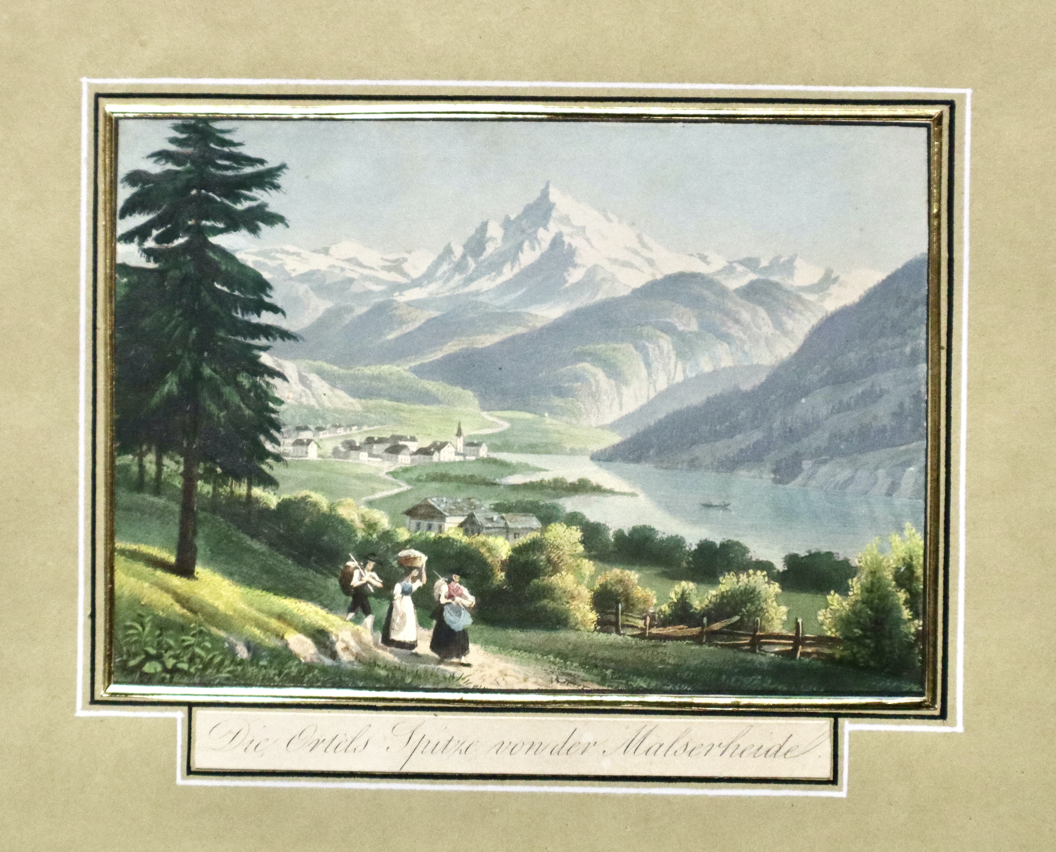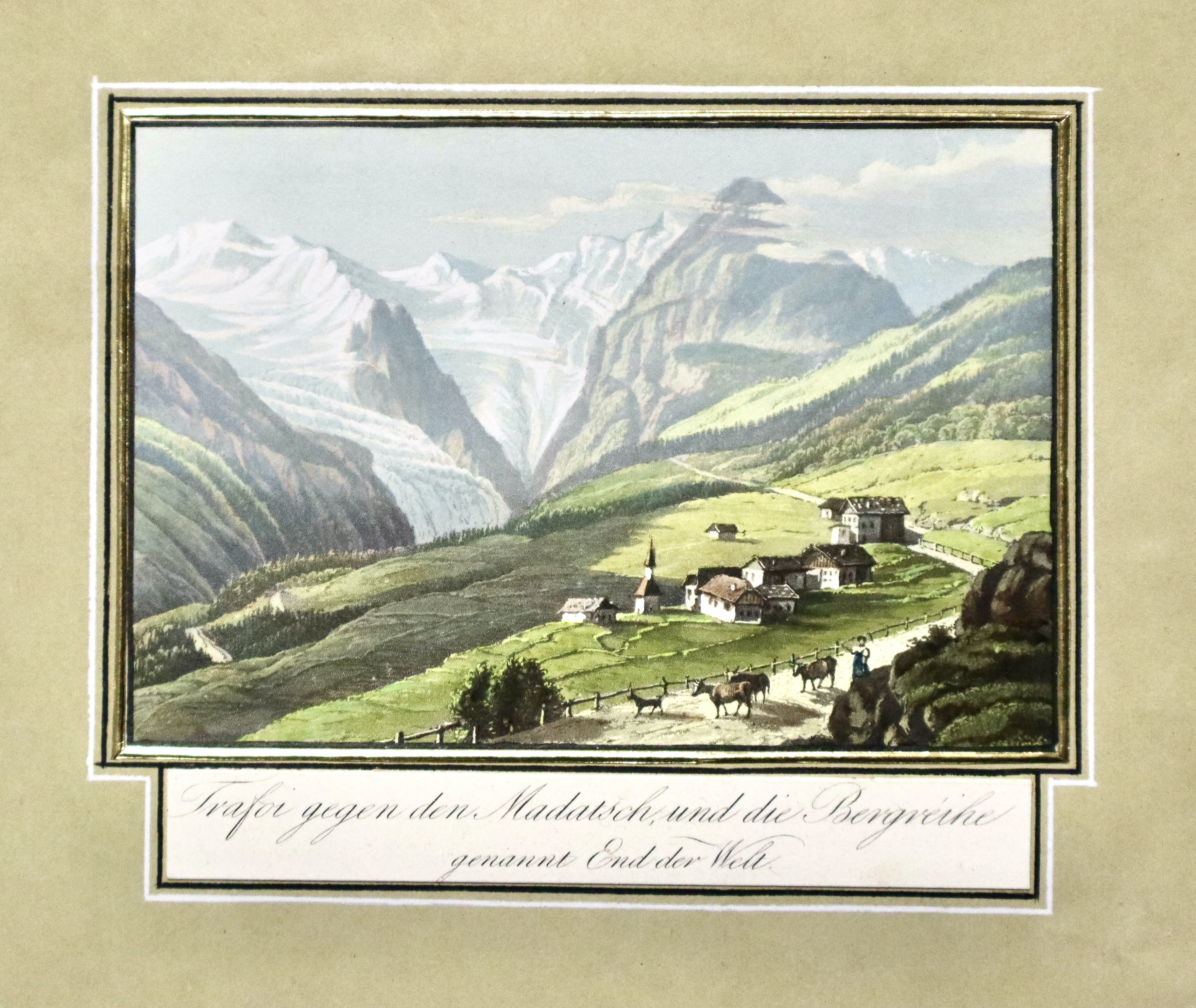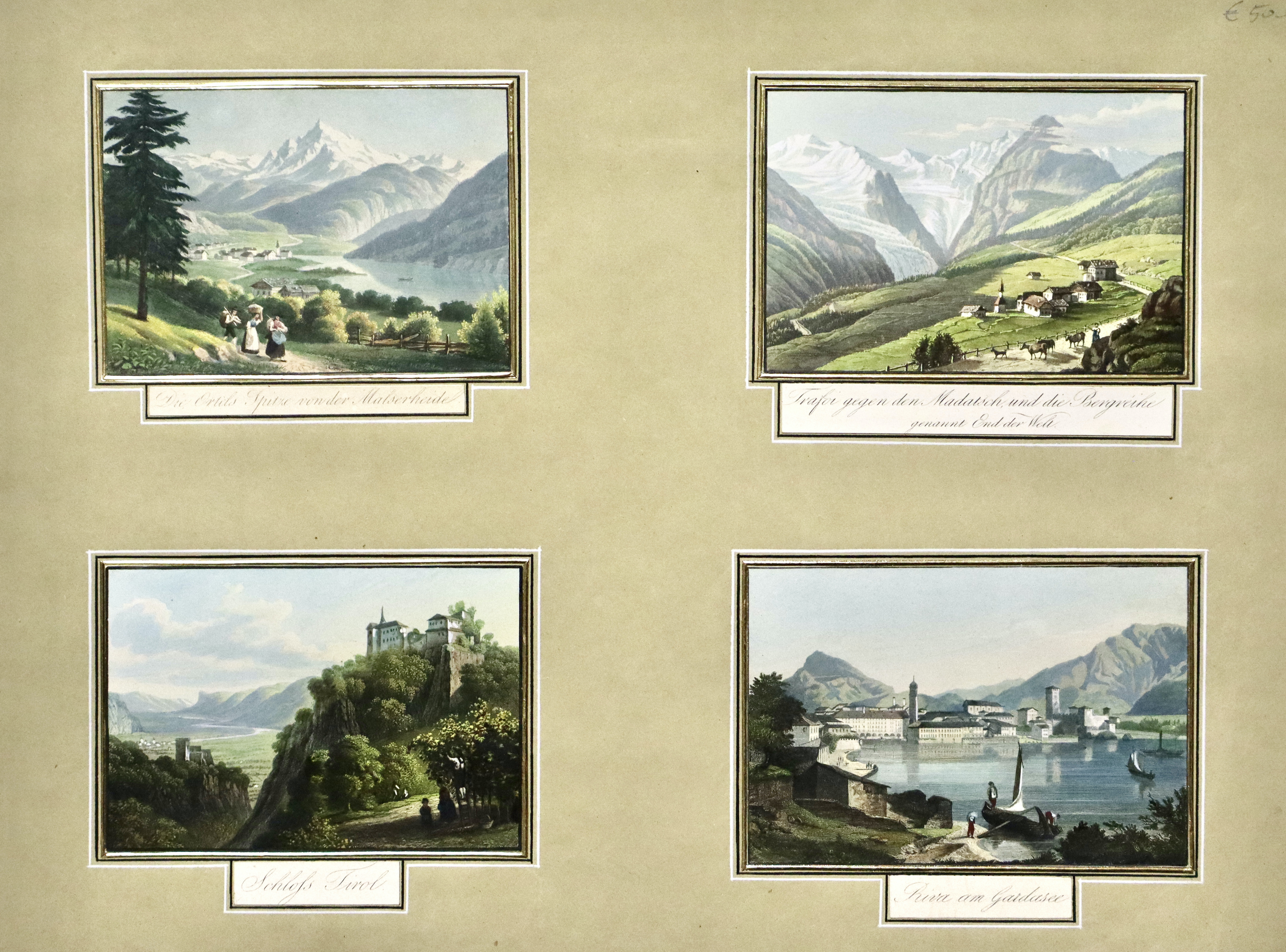 Four stunning hand-painted landscape aquatints (each 7 x 10.5 cm), mounted on a backing sheet (24 x 32.5 cm) and framed in a small gilded frame with the title at the bottom. A beautiful and flawless piece.