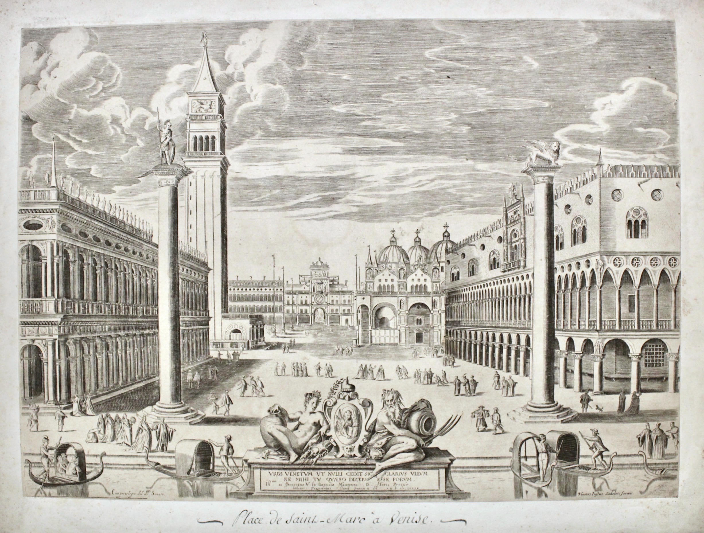 Incisione in rame, eseguita su carta vergellata, mm 310x425. Primo stato su due, prima del nome di Scolari aggiunto (1660 c.). Veduta della piazzetta verso la Basilica tratta dal dipinto di Ludovico Pozzoserrato; al centro ricca scena allegorica con Venezia incoronata con la dea Diana e Mercurio. In basso a destra firma in lastra “Venetus Justus Sadeler formis”. Esemplare ben impresso, rifilato alla battuta del rame e montato anticamente su foglio di supporto non vergellato, che riporta in basso un titolo manoscritto in francese “Place de Saint-Marc à Venise”.