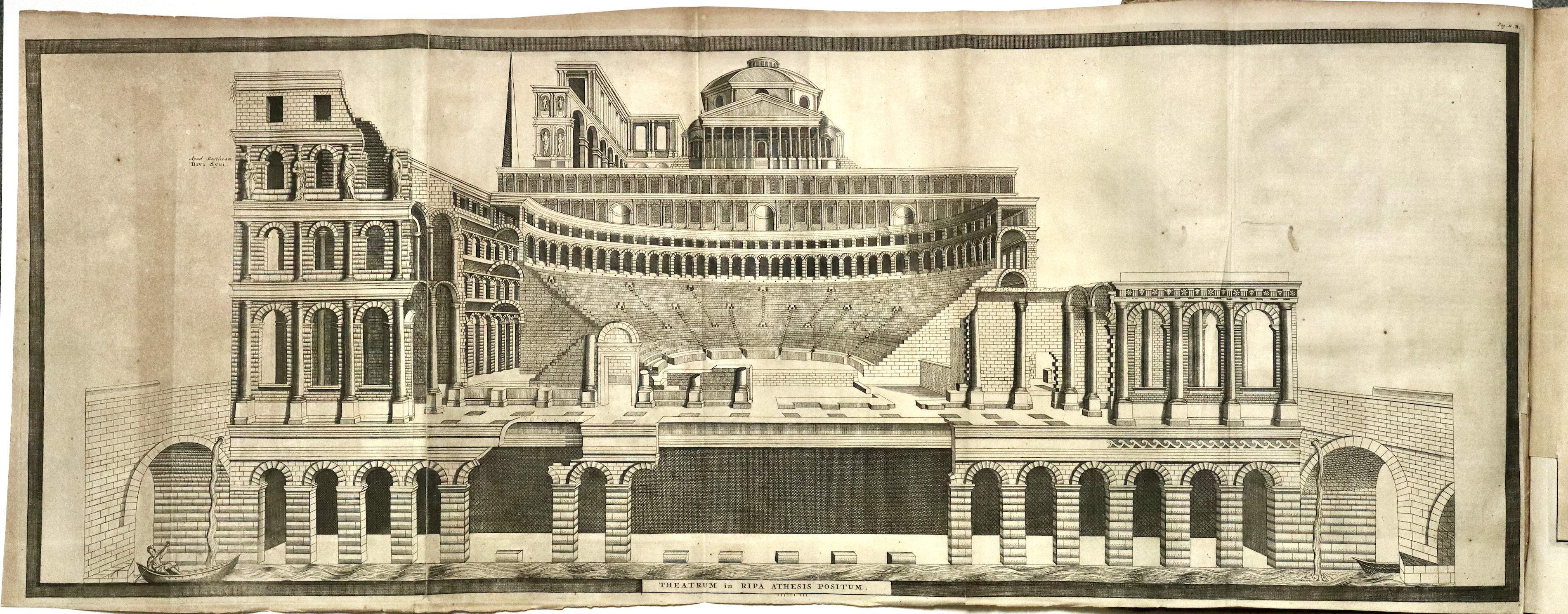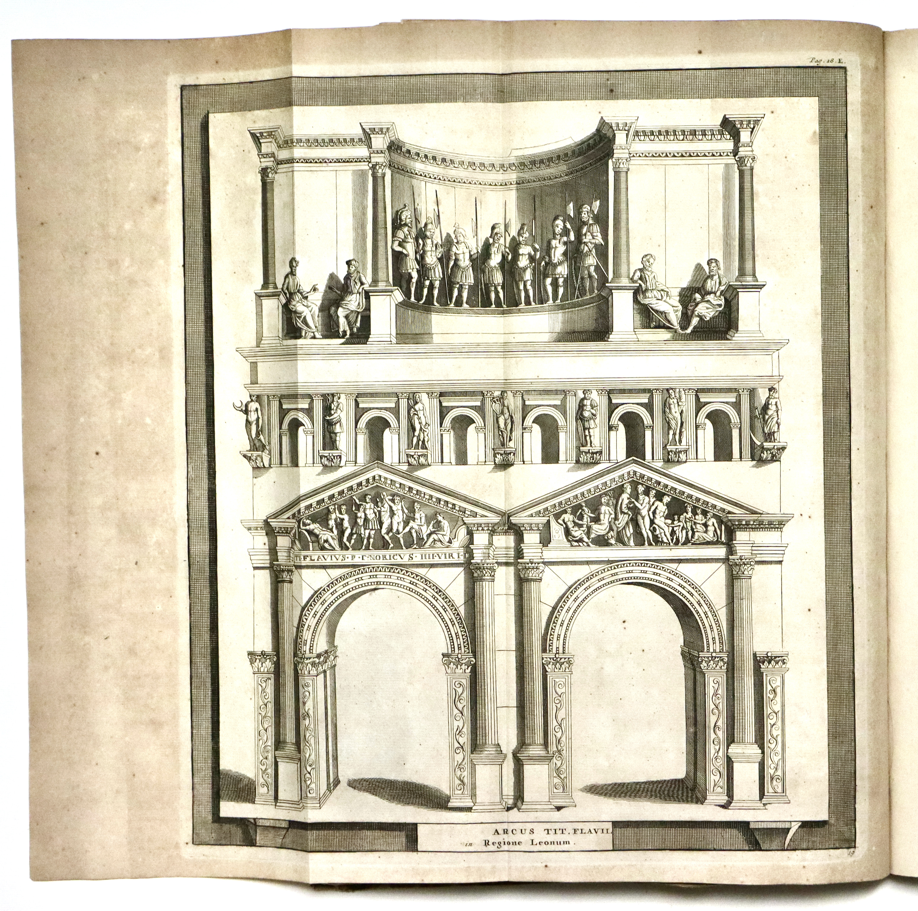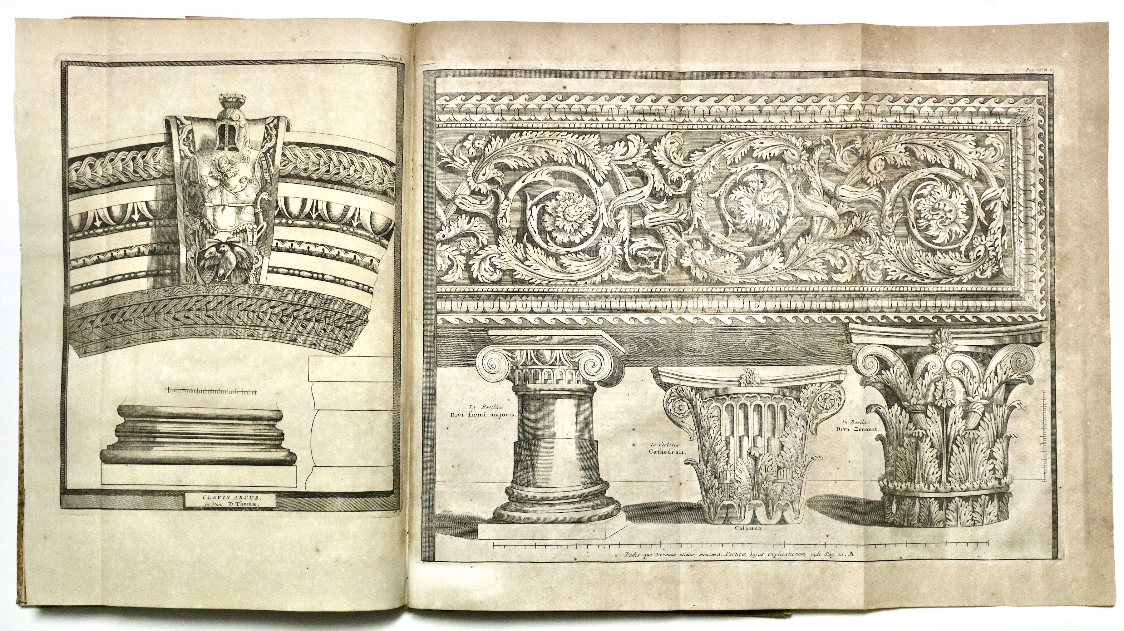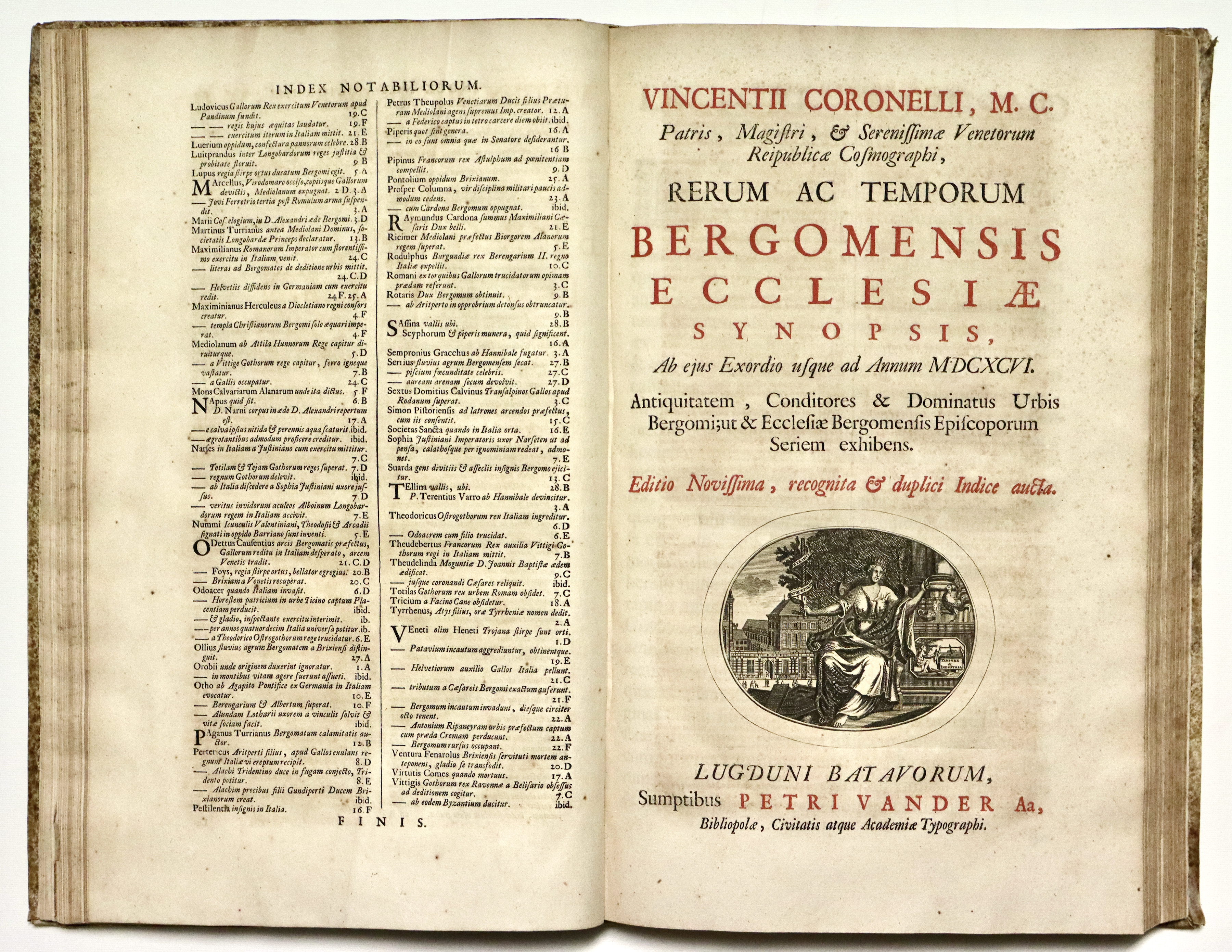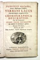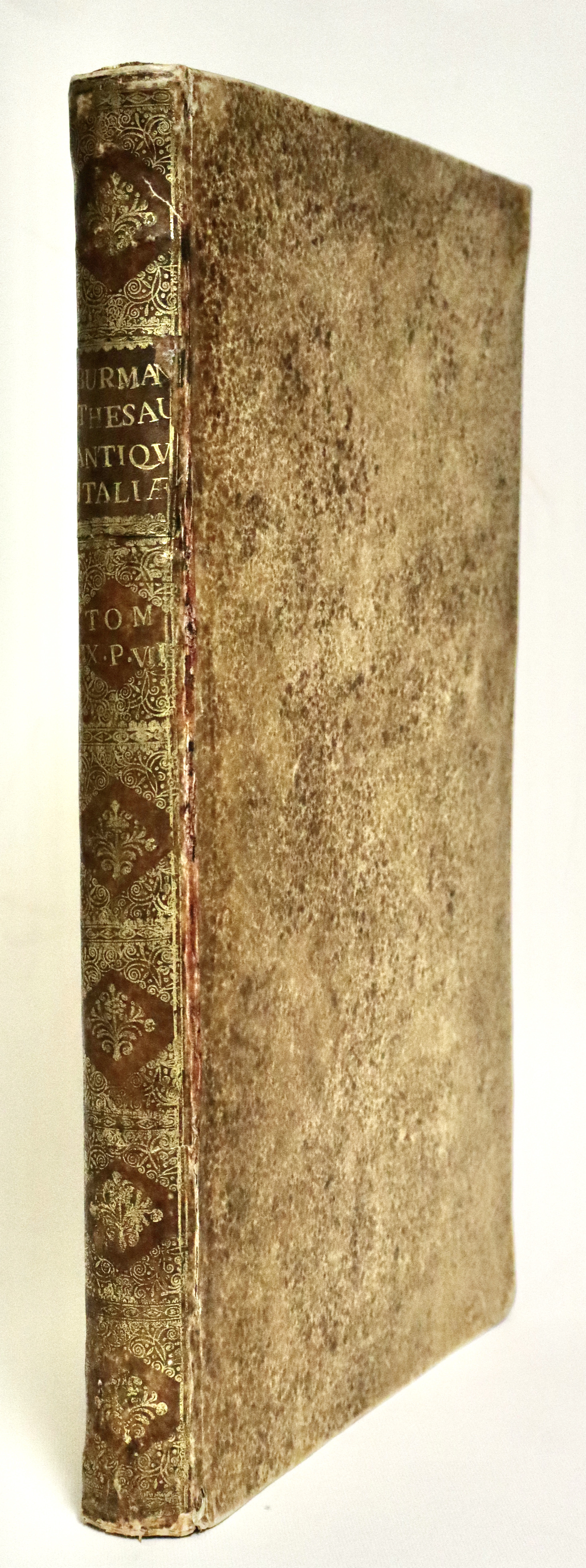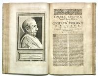 Il Thesaurus è una raccolta di opere di storia locale stampate o manoscritte nei secoli precedenti, raccolte da Graevius. Questo tomo contiene: MACANEUS DOMINICUS. Verbani lacus locorumque adjacentium chorographica descriptio... Pagg. (8), col. 72, pagg. (4). BELLAFINUS FRANCISCUS. De origine et temporibus urbis Bergomi liber...et Marci Antonii Michaelis Agri et Urbis Bergomatis descriptio... Pagg. (4), col. 32, pagg. (4). CORONELLI VINCENZO. Rerum ac temporum bergomensis ecclesiae synopsis. Pagg. (4), col. 40, pagg. (4). FARINA BARTHOLOMAEUS. De Bergomi origine et fatis commentarius... Pagg. (4), col. 36, pagg. (2). CORNAZZANUS ANTONIUS. Vita et gestis Bartholmaei Colei principis bello invictissimi, commentariorum libri sex. Pagg. (6), col. 38. Qualche foglio brunito fortemente. CAPREOLUS HELIA. Cronicorum de rebus Brixianorum libri quatordecim. Pagg. (8), col. 142, pagg. (9). SQUADRONUS ALEXANDER. Fasciculus laudum Regii Lepidi ubi hujus antiquitas, incolae, variae in ea rerum mutationes...enarrantur. Pagg. (4), col. 24, pagg. (2). SARAYNA TORELLO. De civitatis Veronae origine, amplitudine... Pagg. (8), ritratto f.t., col. 88, pagg. (6) con 1 grande tav. f.t. raffigurante pianta e veduta di Verona, 25 tavole architettoniche, molte a doppia pag. Tutto inc. in rame. (Insieme a:) SARAYNA TORELLO. Historiarum et gestorum veronensium, temporibus populi, et dominorum Scaligerorum... Pagg. (4), col. 128, pagg. (6). Alcune tavole del Sarayna, fra cui la bella veduta che riprende il Braun-Hogenberg e 11 tavole di architetture, sono state rilegate all’inizio del tomo, fra le pagine della prima opera di Macaneus per un probabile disguido di rilegatura.