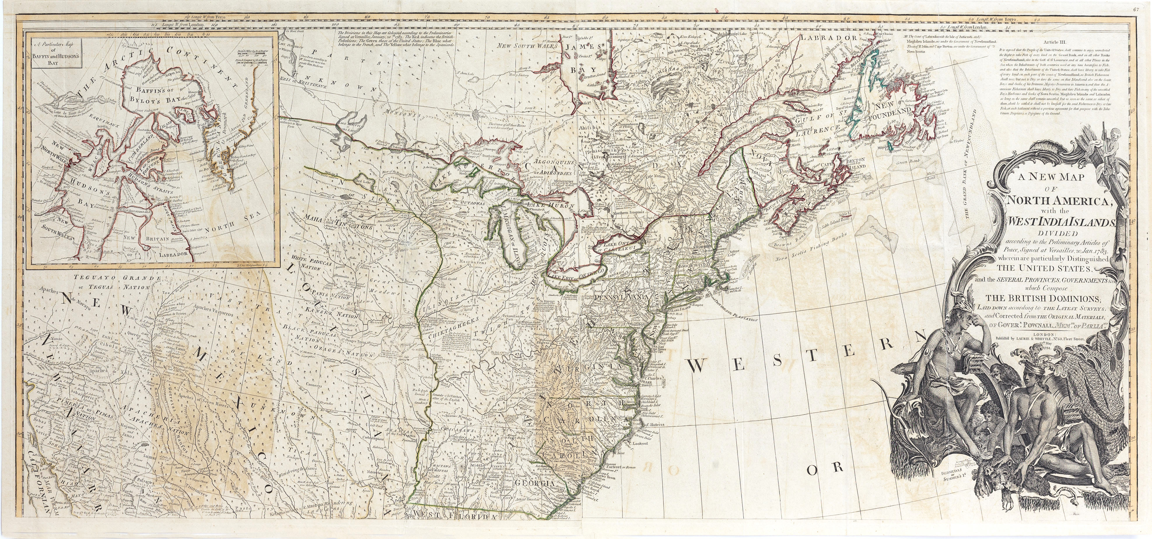 Compare il nome “United States” sulla porzione di Nord America assegnata dal trattato del 1783, in alto a destra si trova una nota di quattro righe sulla costa del Labrador e sull'articolo III del trattato.