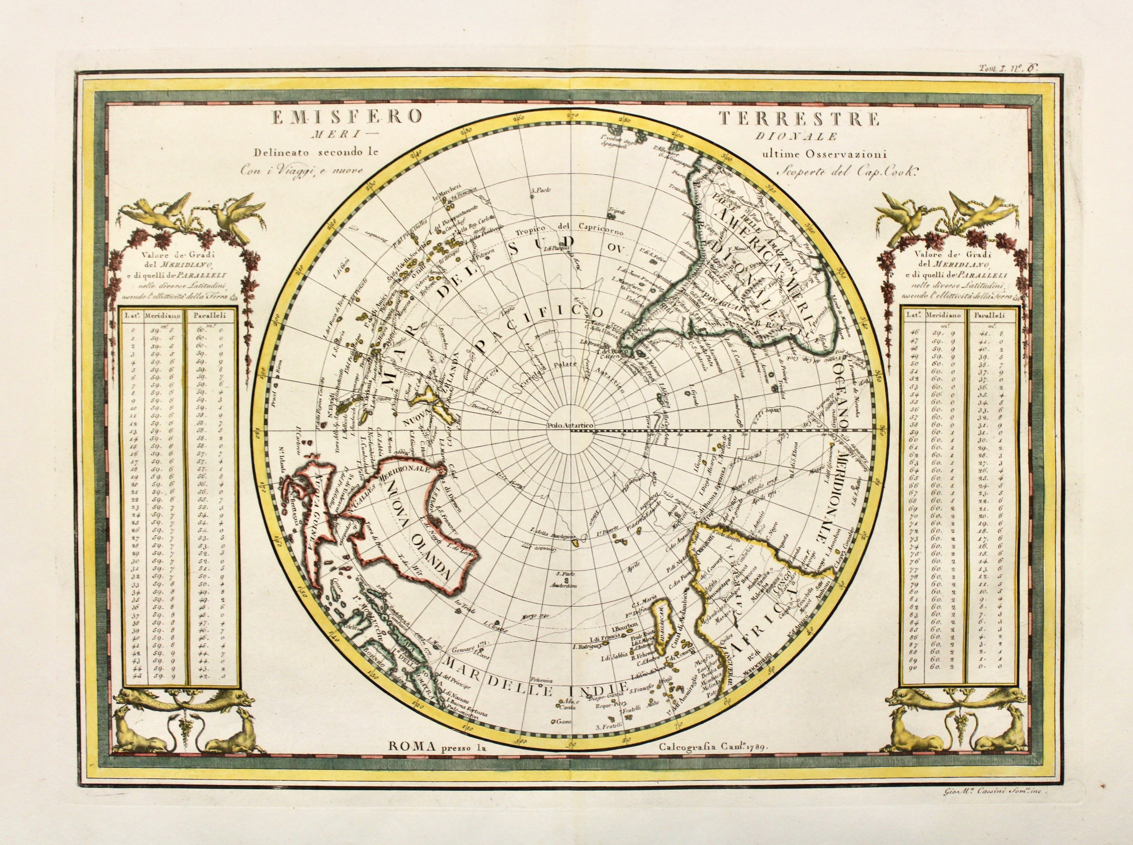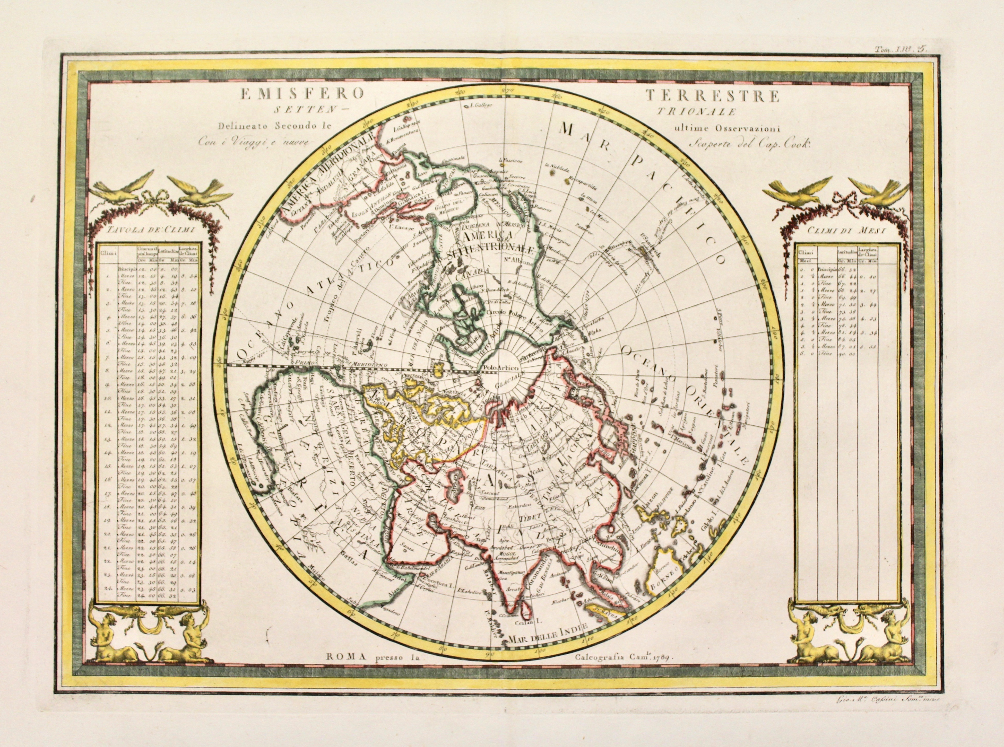Due tavole incise in rame, mm 350x470 ognuna, raffiguranti gli emisferi in visione polare. Ai lati della carta settentrionale sono poste due tavole dei climi; ai lati di quella meridionale, due tabelle indicano il “valore de’ gradi del meridiano e di quelli de’ paralleli nelle diverse latitudini”. Bell’esemplare assai marginoso.