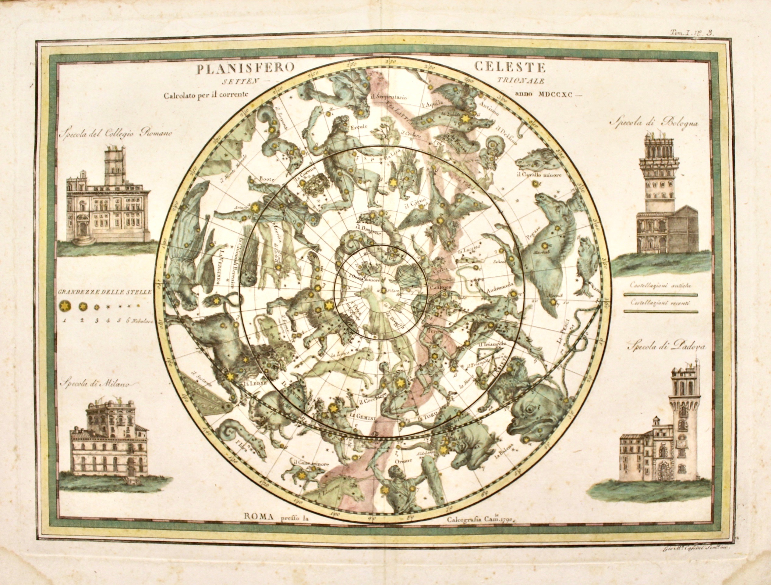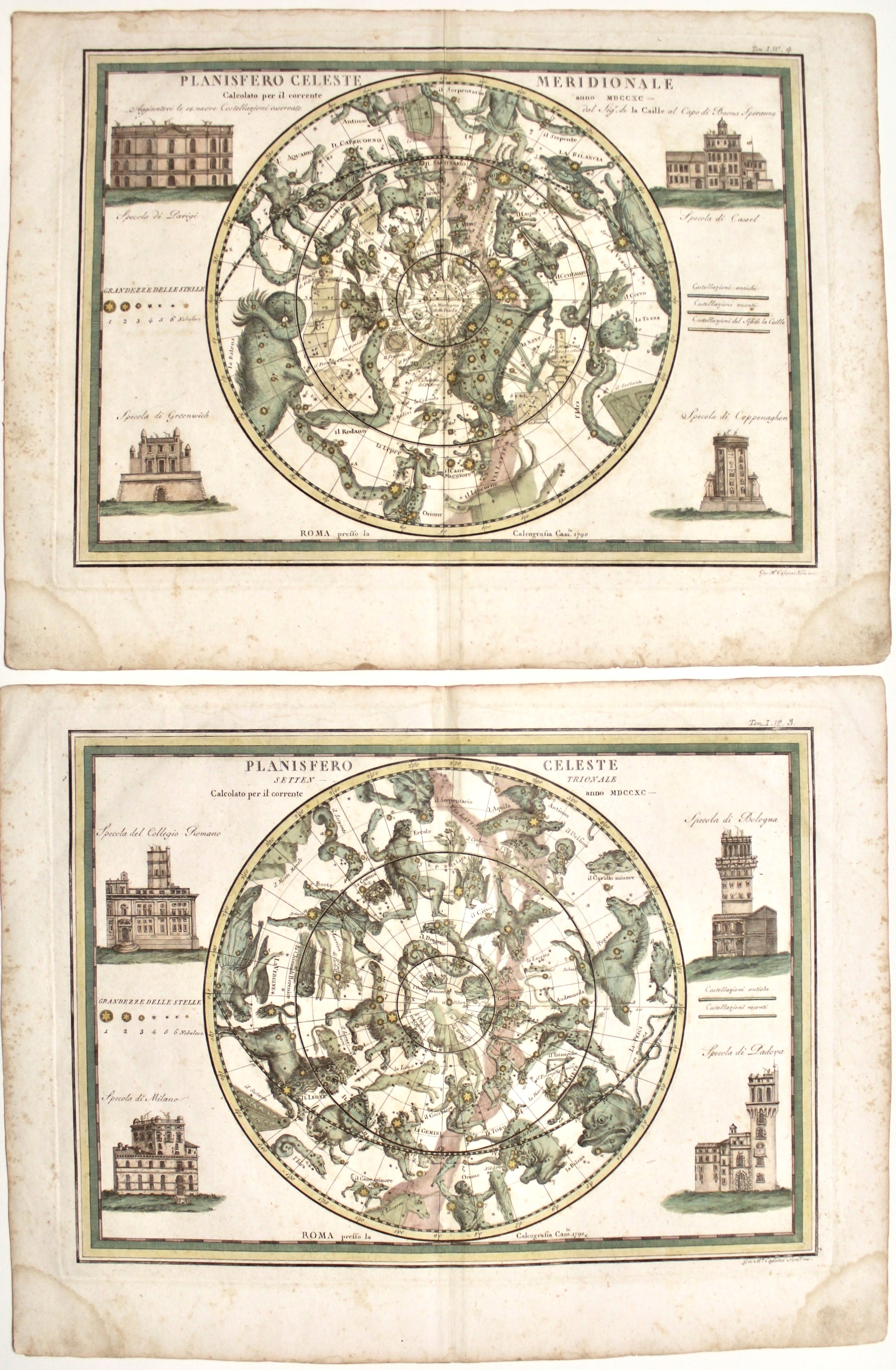 Coppia di incisioni in rame, mm 345x478 ognuna, dipinte a mano d’epoca. Splendida coppia di carte celesti raffiguranti in forma classica le varie costellazioni. Agli angoli sono illustrati i più celebri osservatori dell’epoca, italiani ed europei: le specole del Collegio romano, di Milano, Padova e Bologna, Parigi, Greenwich, Cassel e Copenhagen. Ottimi esemplari marginosi. Tratte da “Nuovo Atlante Geografico Universale delineato sulle ultime osservazioni”, edito a Roma dal 1792 fino al 1801. La Calcografia Camerale gli commissionò l’opera per sostituire il “Mercurio Geografico”. Giovanni Maria Cassini (1745-1824), allievo di Piranesi, fu religioso, geografo, costruttore di globi e cartografo. Qualche leggera fioritura della carta e un alone negli angoli inferiori